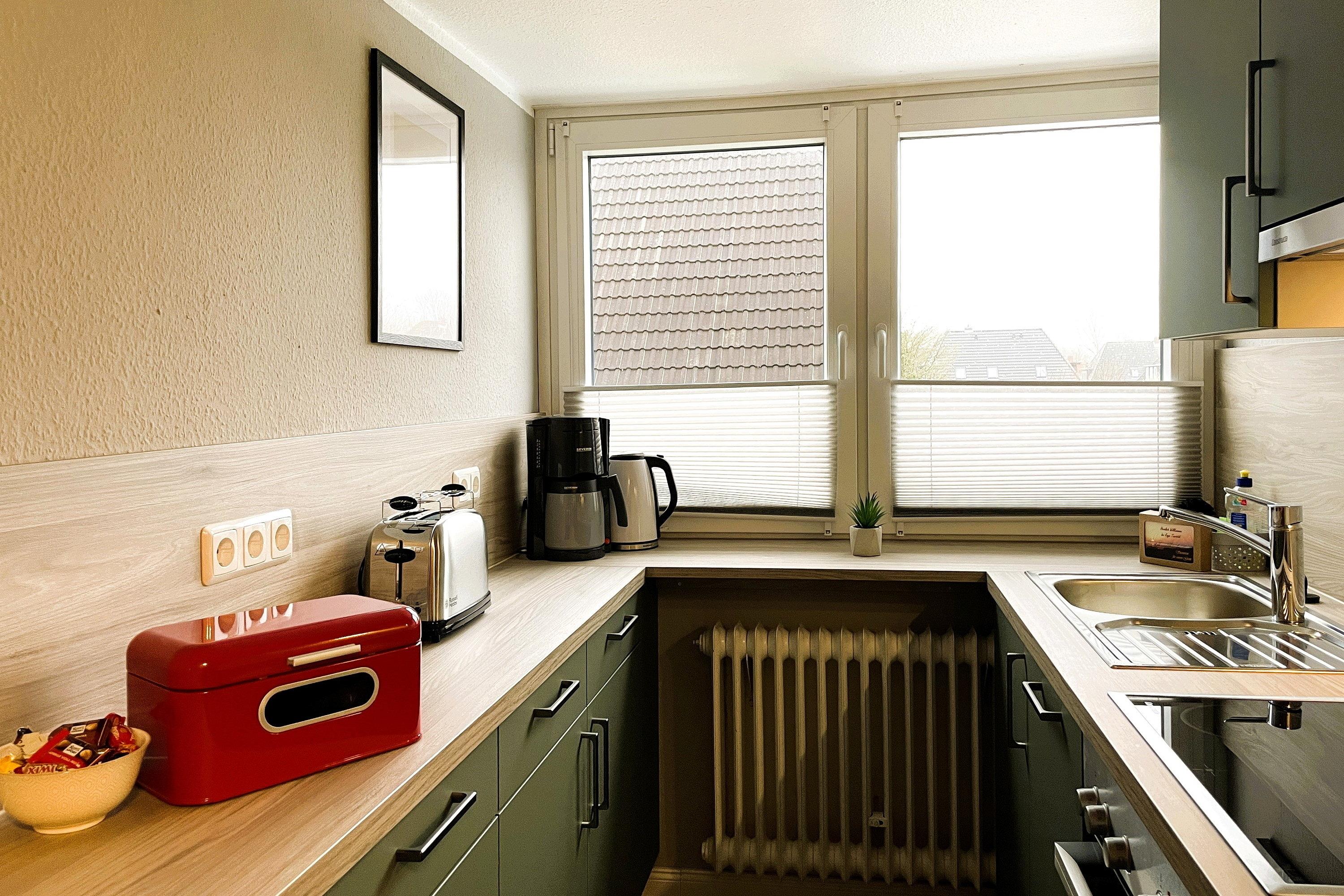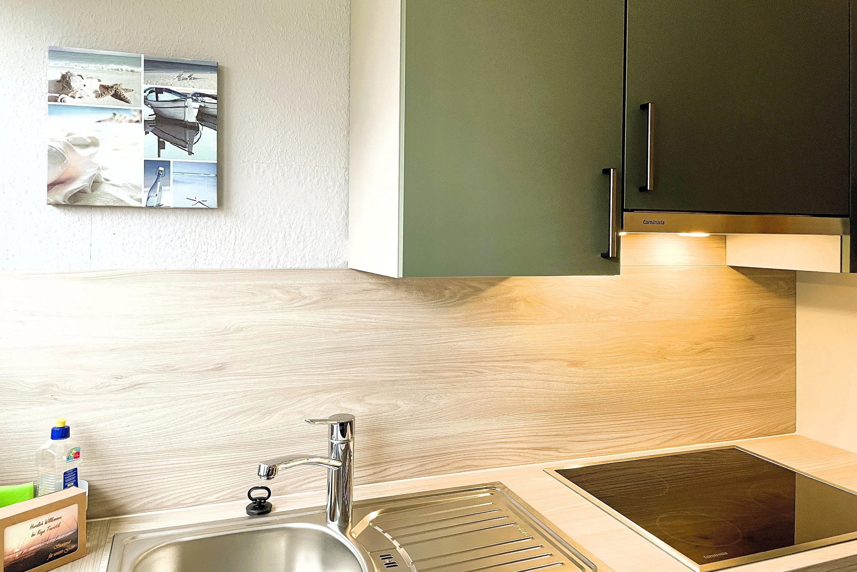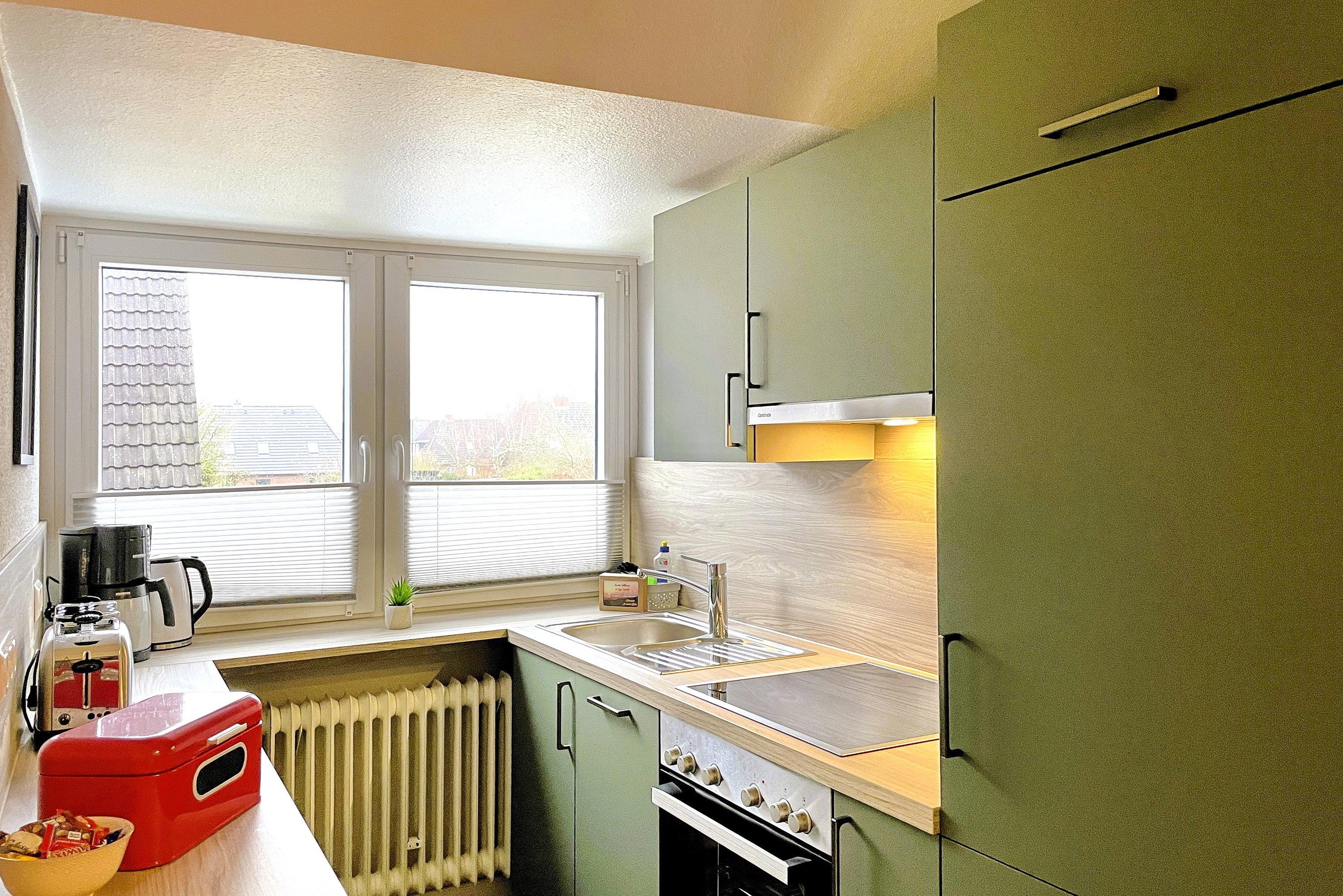 Unser Sonnenblick verfügt über ein geräumiges Wohnzimmer mit WLAN, bequemer Fernsehecke, einem gemütlichem Lesesessel sowie einer kleinen Auswahl an Büchern. Hier integriert finden Sie auch einen Essplatz für drei Personen. Die Küchenzeile mit Kühlschrank, Geschirrspüler, Ceranfeld und Backofen ist funktional hergerichtet und für Ihren Urlaub gut ausgestattet. Das Bad mit Fenster ist hell und die Dusche verfügt über einen niedrigen Einstieg. Das Schlafzimmer mit Doppelbett (180 x 200 cm) und Verdunklungsmöglichkeit lädt zu geruhsamen Nächten ein. Ein weiteres Schlafzimmer verfügt über ein Einzelbett (90 x 200 cm).