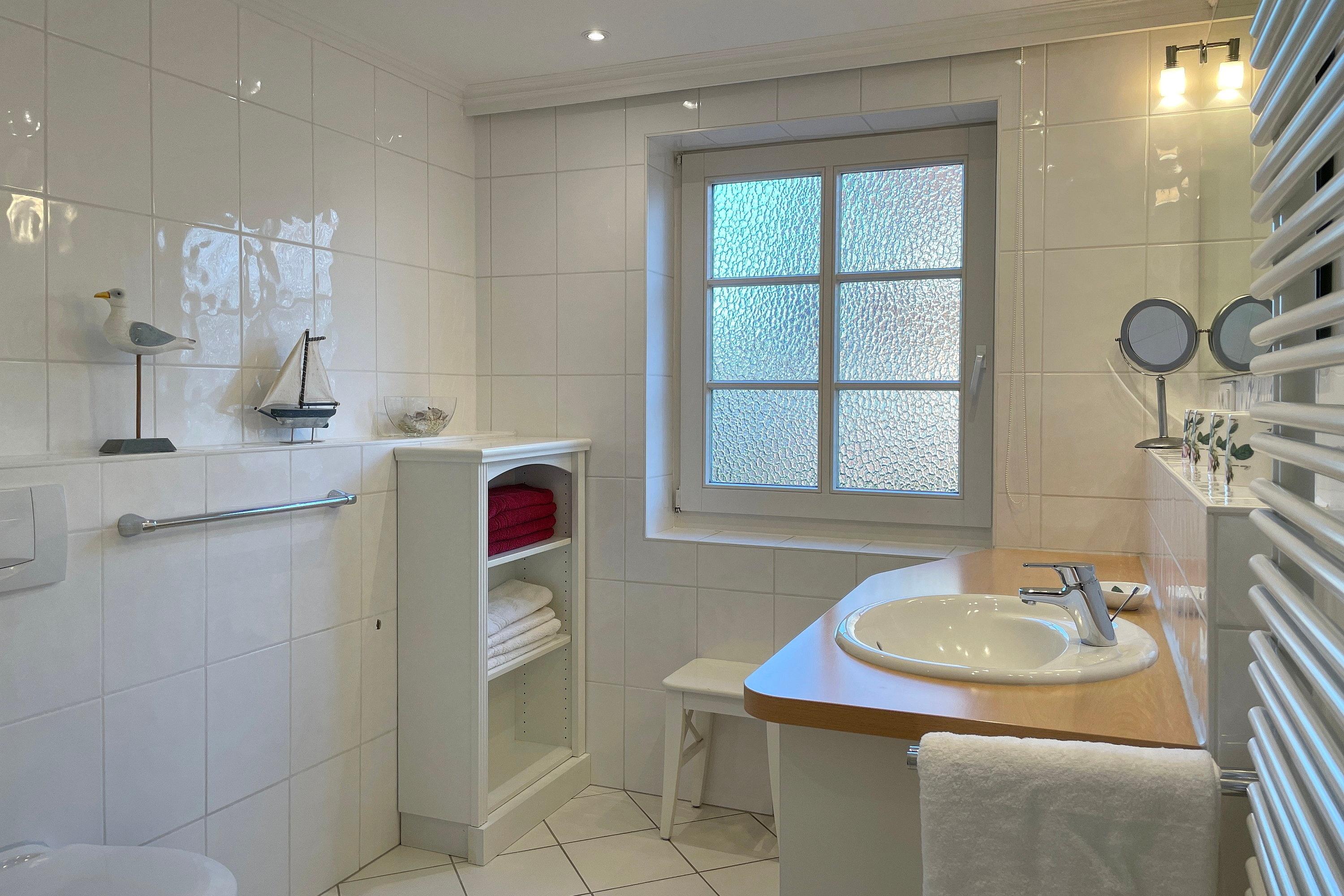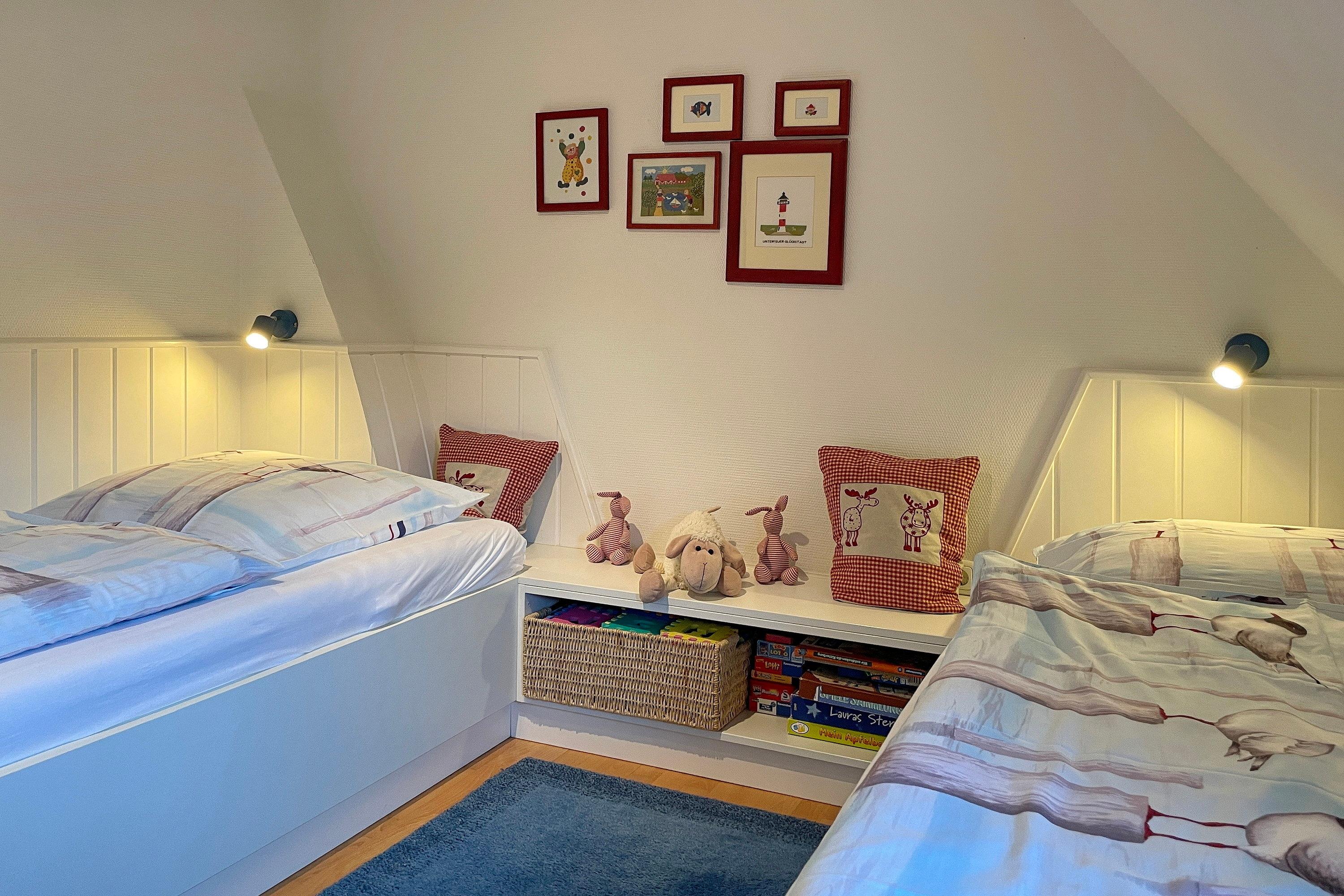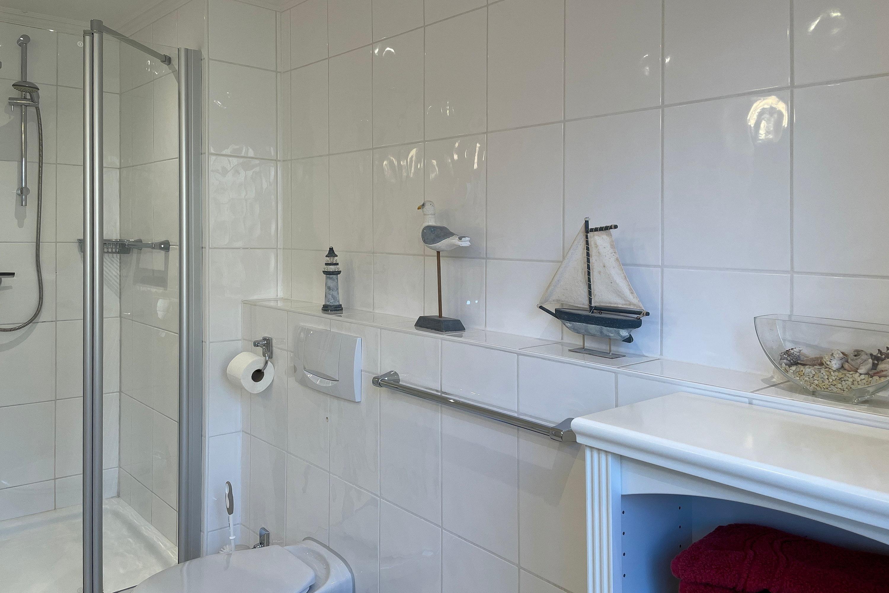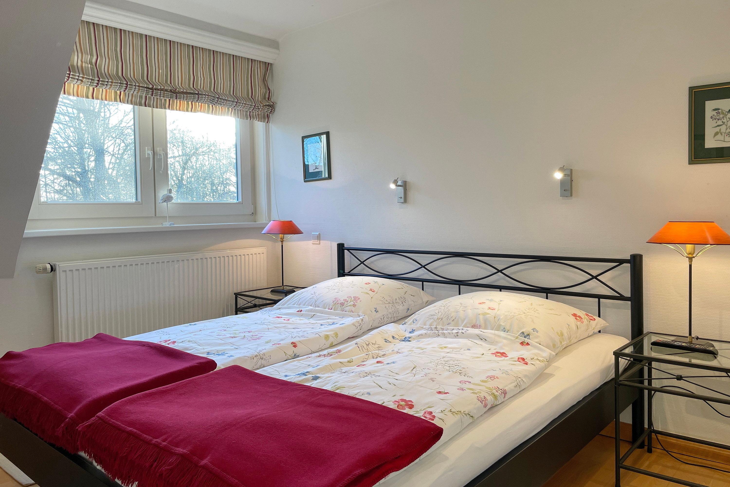 Im Erdgeschoss befindet sich das lichtdurchflutete Wohnzimmer ebenso das zweite großzügige Badezimmer mit Dusche. Ein behagliches Schlafzimmer mit Doppelbett und das Kinderzimmer mit zwei Einzelbetten stehen im Obergeschoss zur Verfügung. Zum Zentrum der Stadt Wyk laufen Sie am Strand entlang ca. 10 Minuten und den Bäcker erreichen Sie morgens in ca. 5 Fußminuten. Genießen Sie Ihren wohlverdienten Urlaub in dieser erstklassigen und sehr gut ausgestatteten Hausscheibe.