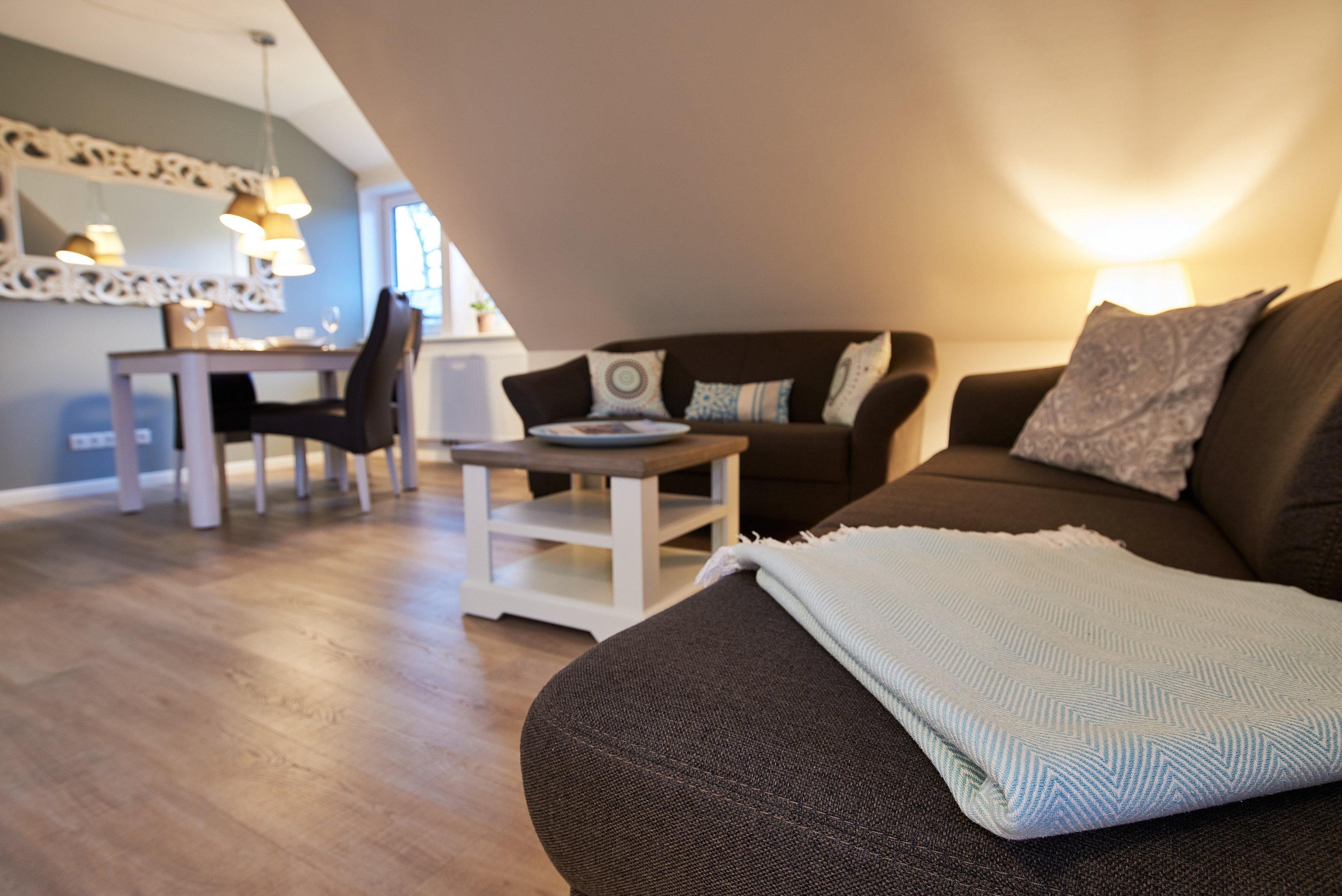 Die ca. 50 qm große, ruhig gelegene OG-Wohnung heißt Sie zu herrlichen Urlaubstagen willkommen. Das Schlafzimmer mit Einbaubett und -Schrank verzaubert und verspricht ruhige Nächte. Im individuellen komfortablen Duschbad mit Fenster steht für Sie ein Waschtrockner zur Verfügung und daran angrenzend befindet sich ein Abstellraum mit Staubsauger, Bügelbrett, Wäscheständer und Platz für Ihre Koffer. Das Herzstück der Wohnung ist der Wohnbereich mit der integrierten, offenen und vollausgestatteten Küche sowie einem komfortablen Essplatz. Bei der Einrichtung, der teilweise mit Dekopaneelen ausgelegten Zimmer, wurde höchster Wert auf Komfort, Ambiente, Funktionalität und eine wohnliche Atmosphäre gelegt. SAT-TV, Radio, Blu-Ray Player, und WLAN gehören selbstverständlich zur Ausstattung. In der Küche profitieren Sie von unserer langjährigen Erfahrung im Vermietungsbereich. Geschirrspüler, Backofen, Mikrowelle, Toaster, Kaffeemaschine (Senseo Duo), Wasserkocher usw. gehören zu der umfangreichen Ausstattung. Für die Fahrräder steht ein Unterstellplatz zur Verfügung. Im gemeinschaftlichen Garten befindet sich eine eigene Sitzgelegenheit mit Strandkorb (in den Sommermonaten). Diese Ferienwohnung ist eine sehr gute Empfehlung und das ideale Feriendomizil für 2 Personen.
