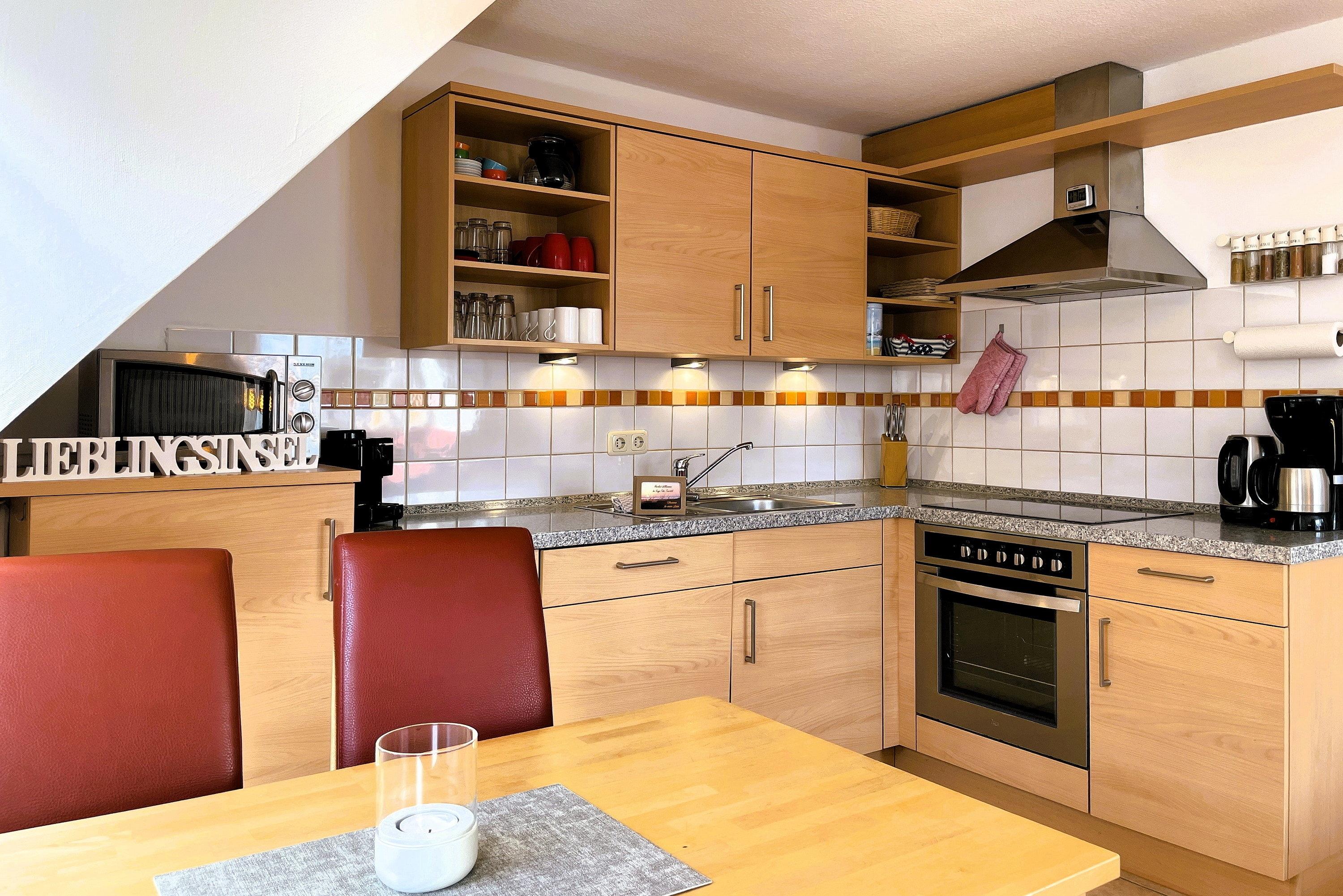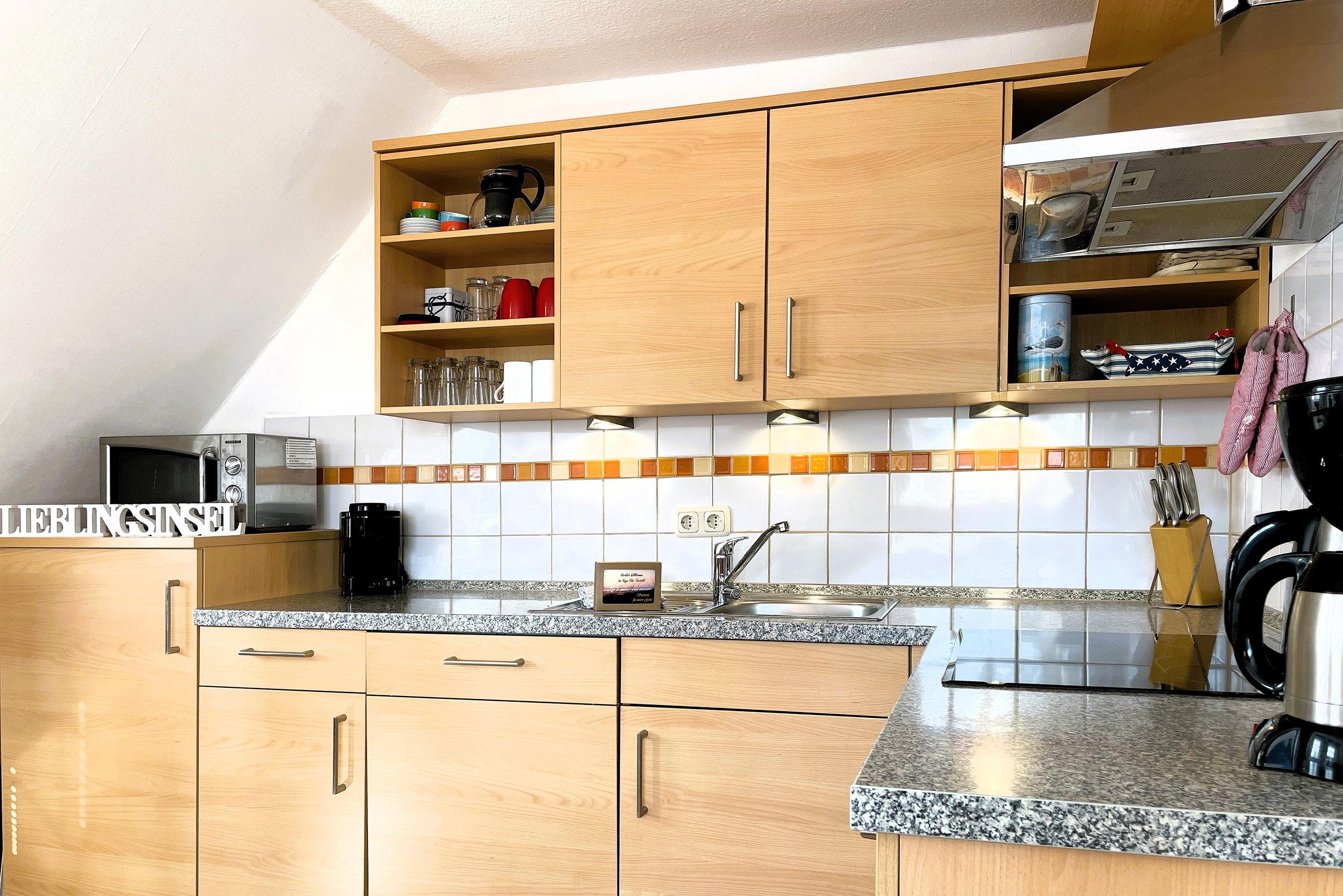 In der Küchenzeile werden Sie eine große Auswahl an Hilfsmittel finden. Es sind ein Geschirrspüler, eine Mikrowelle, ein Backofen, eine Kaffeemaschine, ein Wasserkocher und eine Espressomaschine vorhanden.