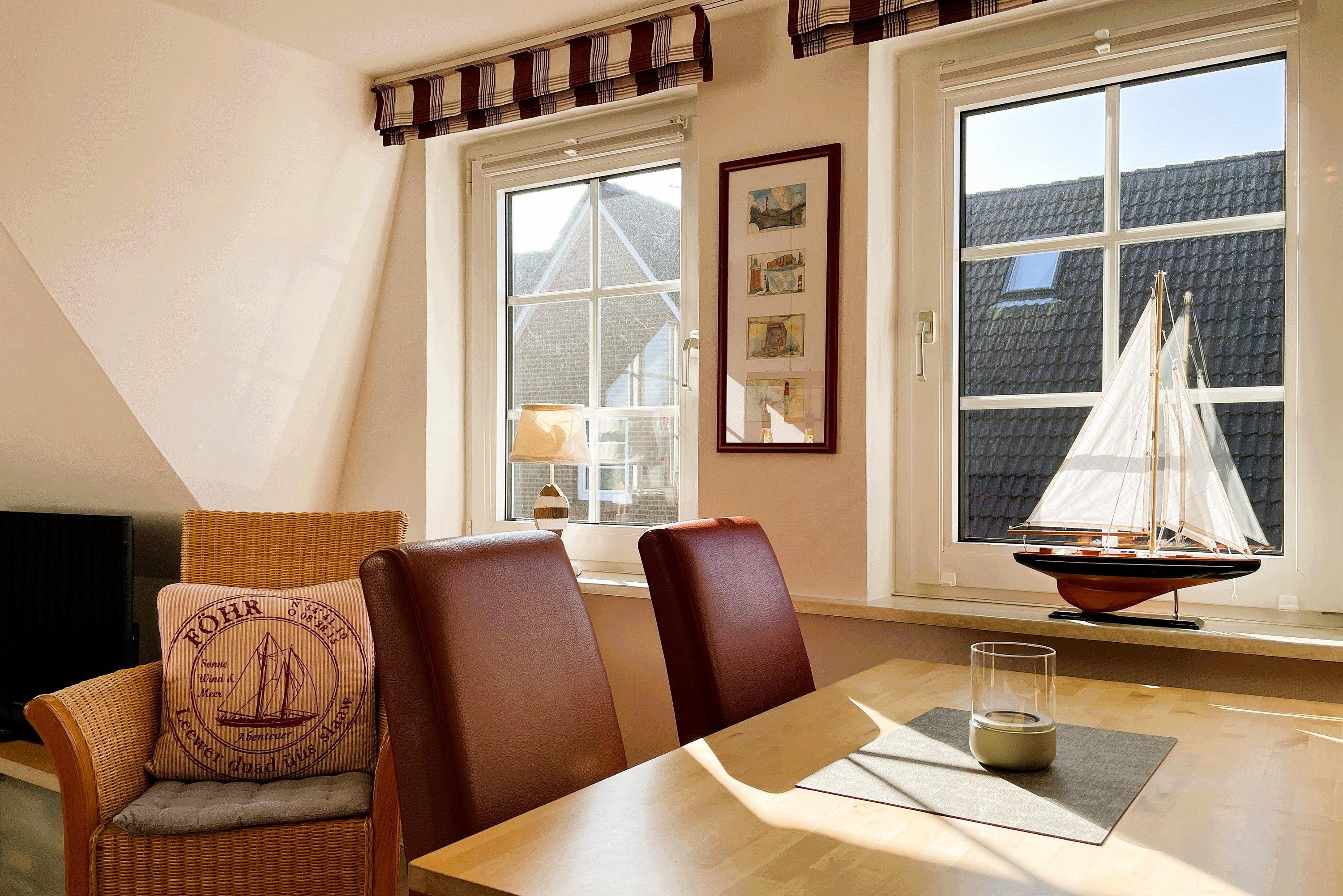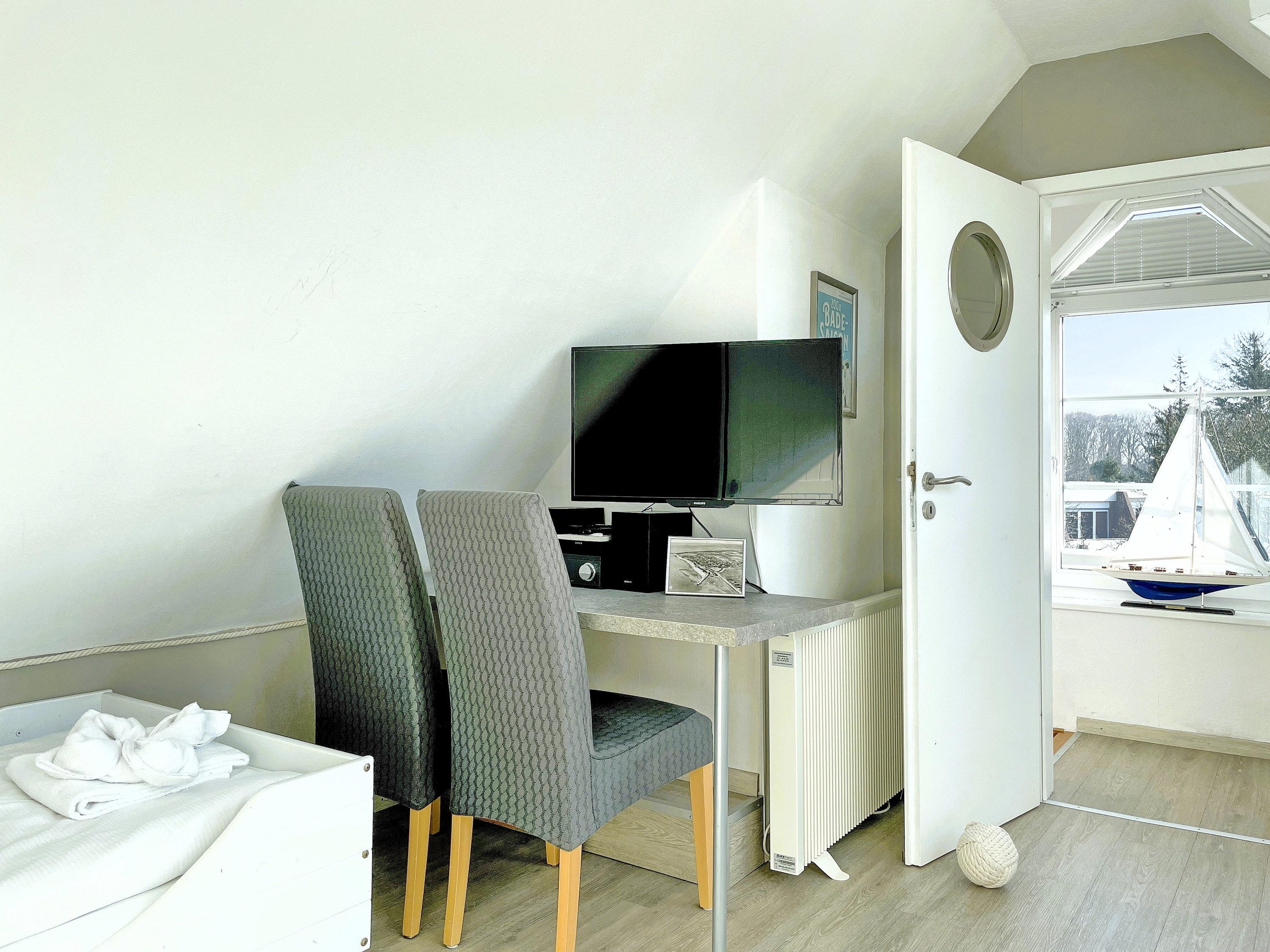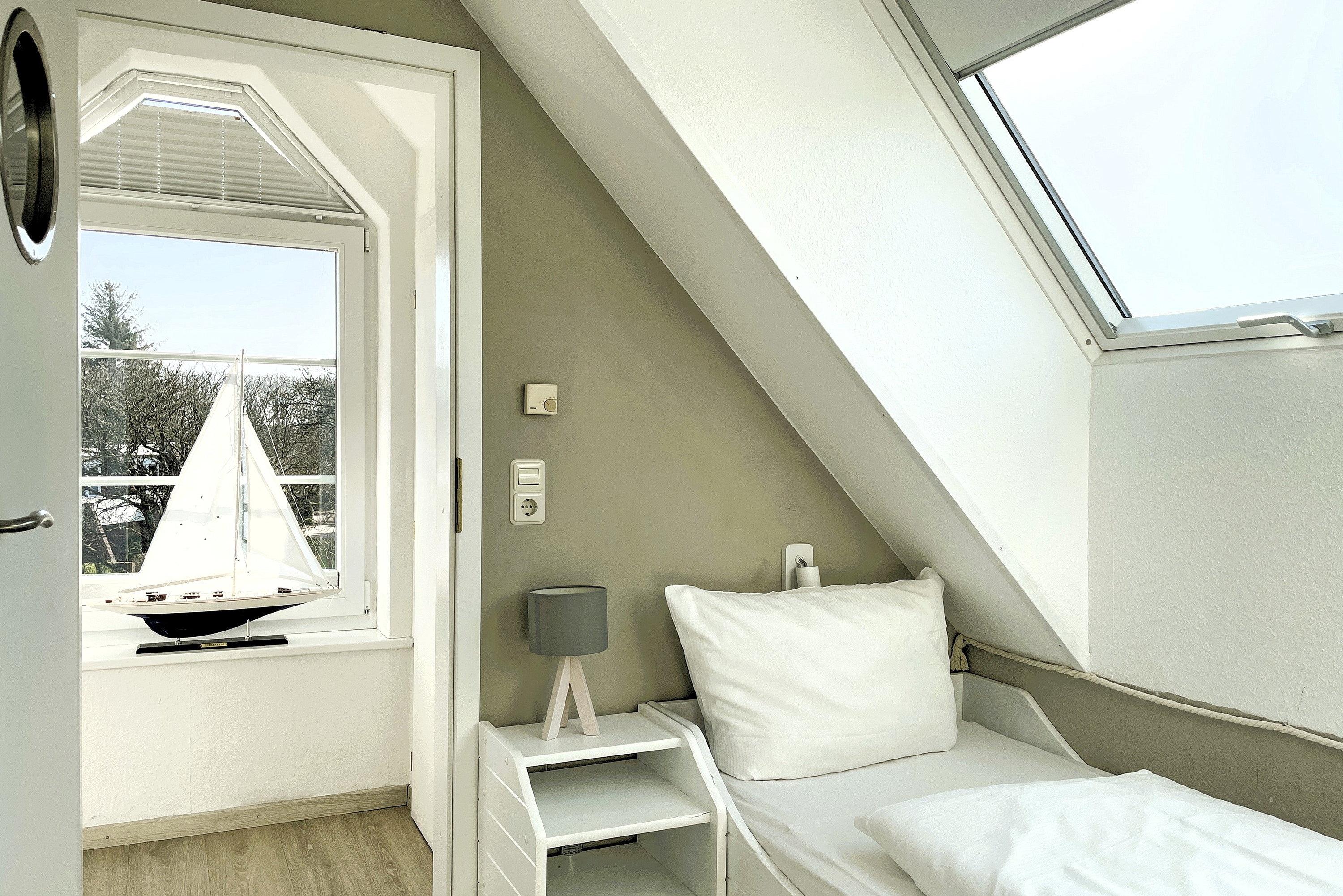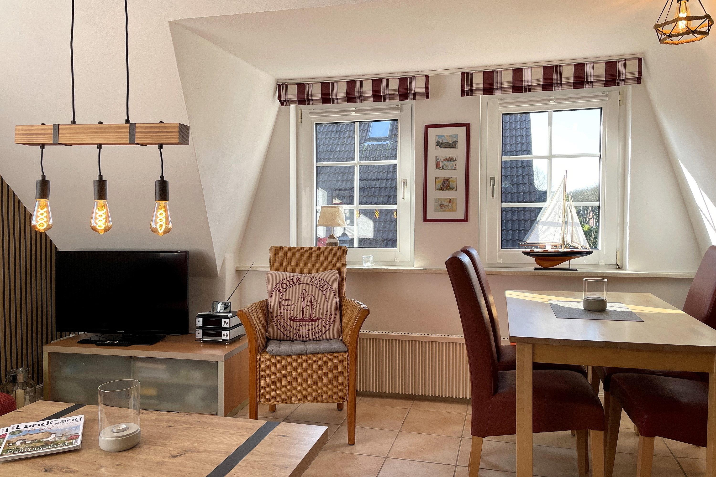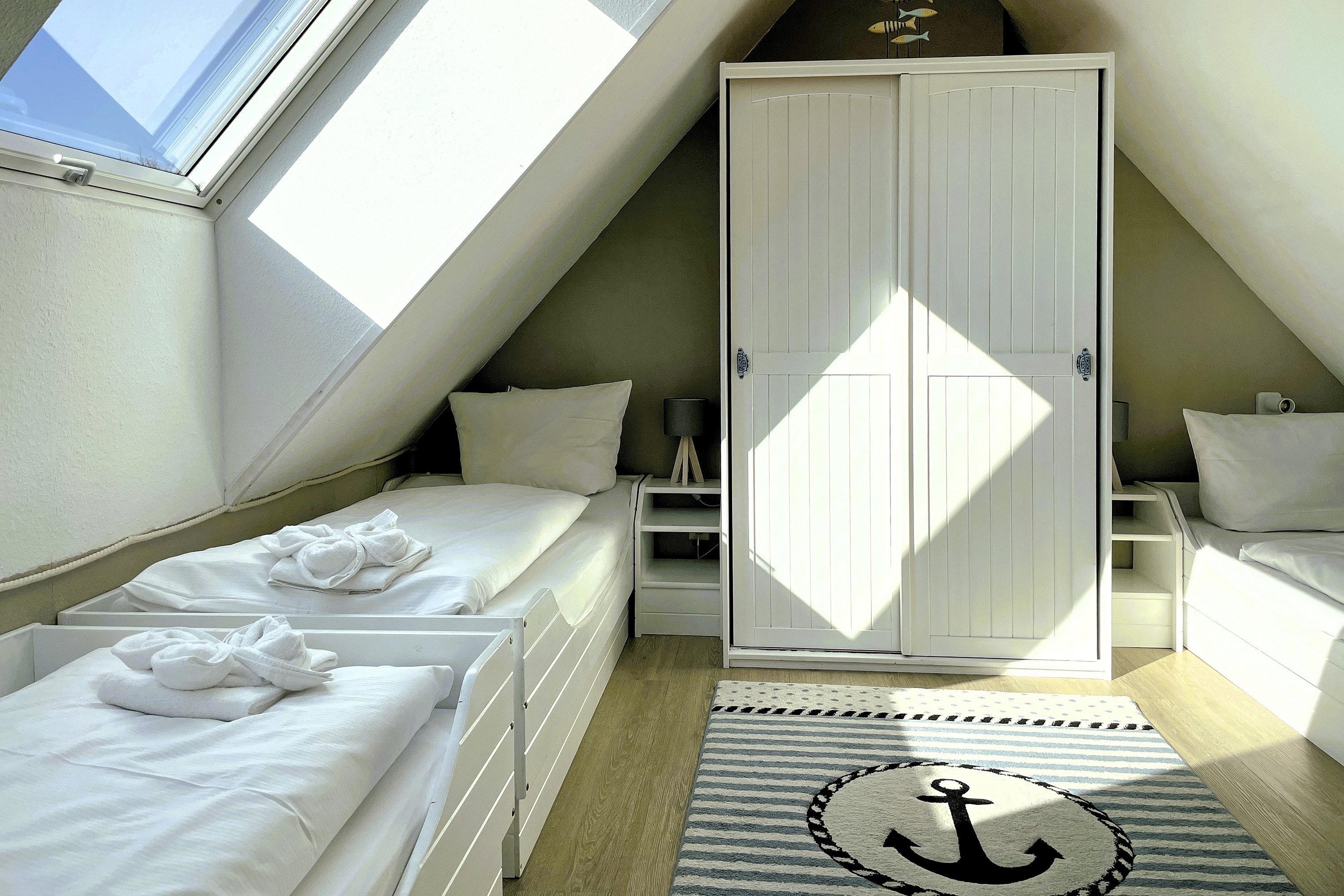 Die lichtdurchflutete Wohnung verteilt sich auf 2 Etagen. Im 1. Obergeschoss befinden sich das liebevoll mit kleinen Details dekorierte Wohnzimmer, eine gut ausgestattete Küchenzeile mit Essbereich, ein Badezimmer mit Dusche und ein gemütliches Schlafzimmer mit Doppelbett (160x200 cm) und Kleiderschrank. Über eine robuste Treppe geht’s ins Dachgeschoss. Drei Einzelbetten (90x200cm), ein Kleiderschrank und ein Schreibtisch sowie ein zusätzlicher Fernseher stehen für Sie bereit. Maritim eingerichtet präsentiert sich dieser Raum nicht nur als Schlafraum sondern auch als Wohlfühlraum, wenn Sie sich mal zurückziehen wollen. Für Schietwedder-Tage haben wir für die Großen und Kleinen Gesellschaftsspiele, Bücher, Kabel TV und Stereoanlage, falls mal Langeweile aufkommen sollte.