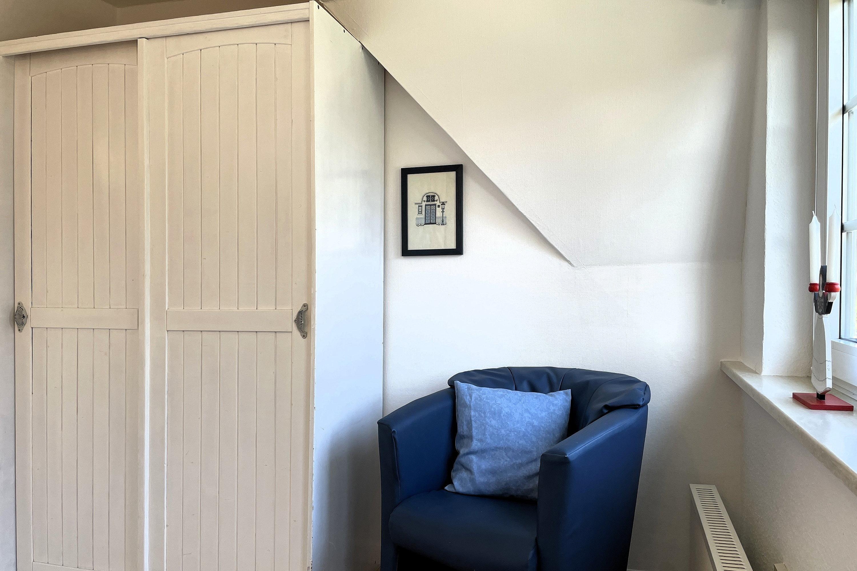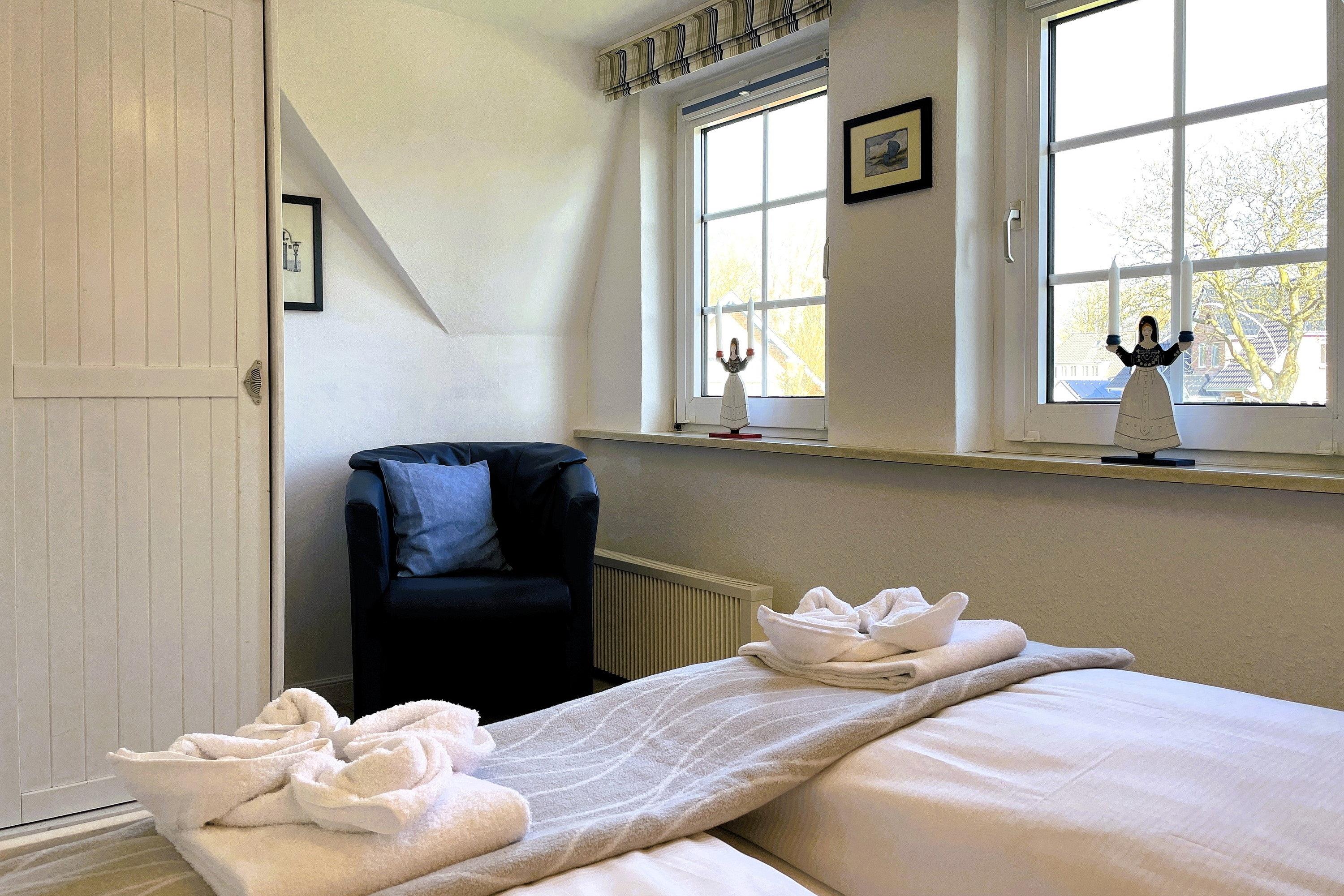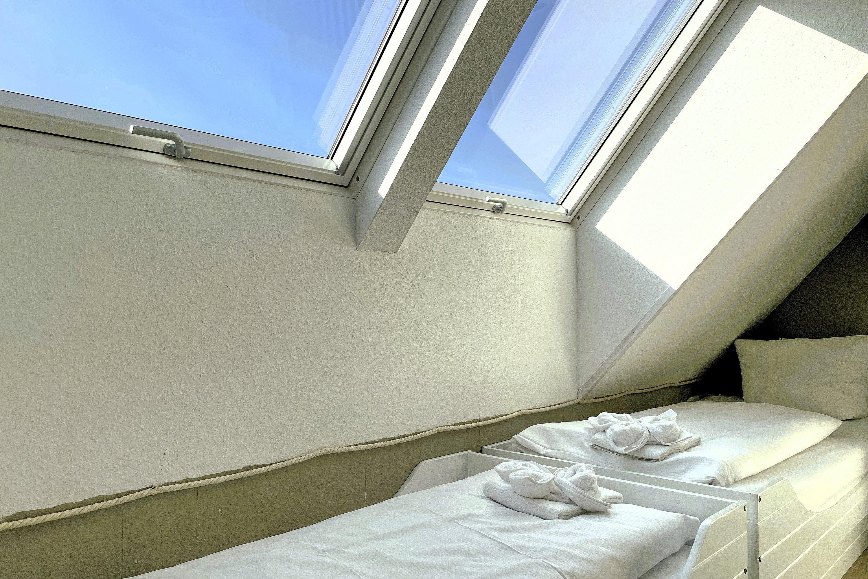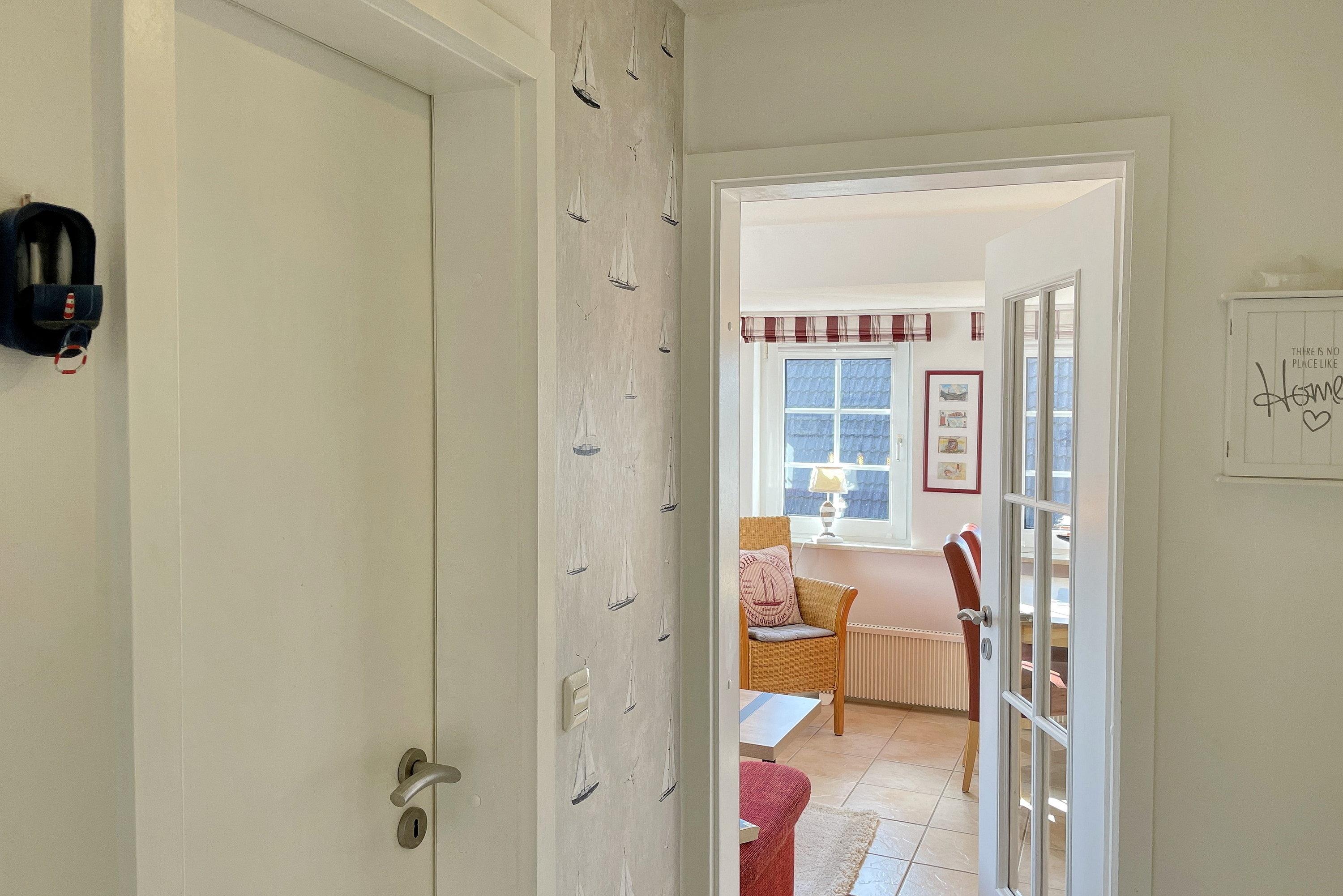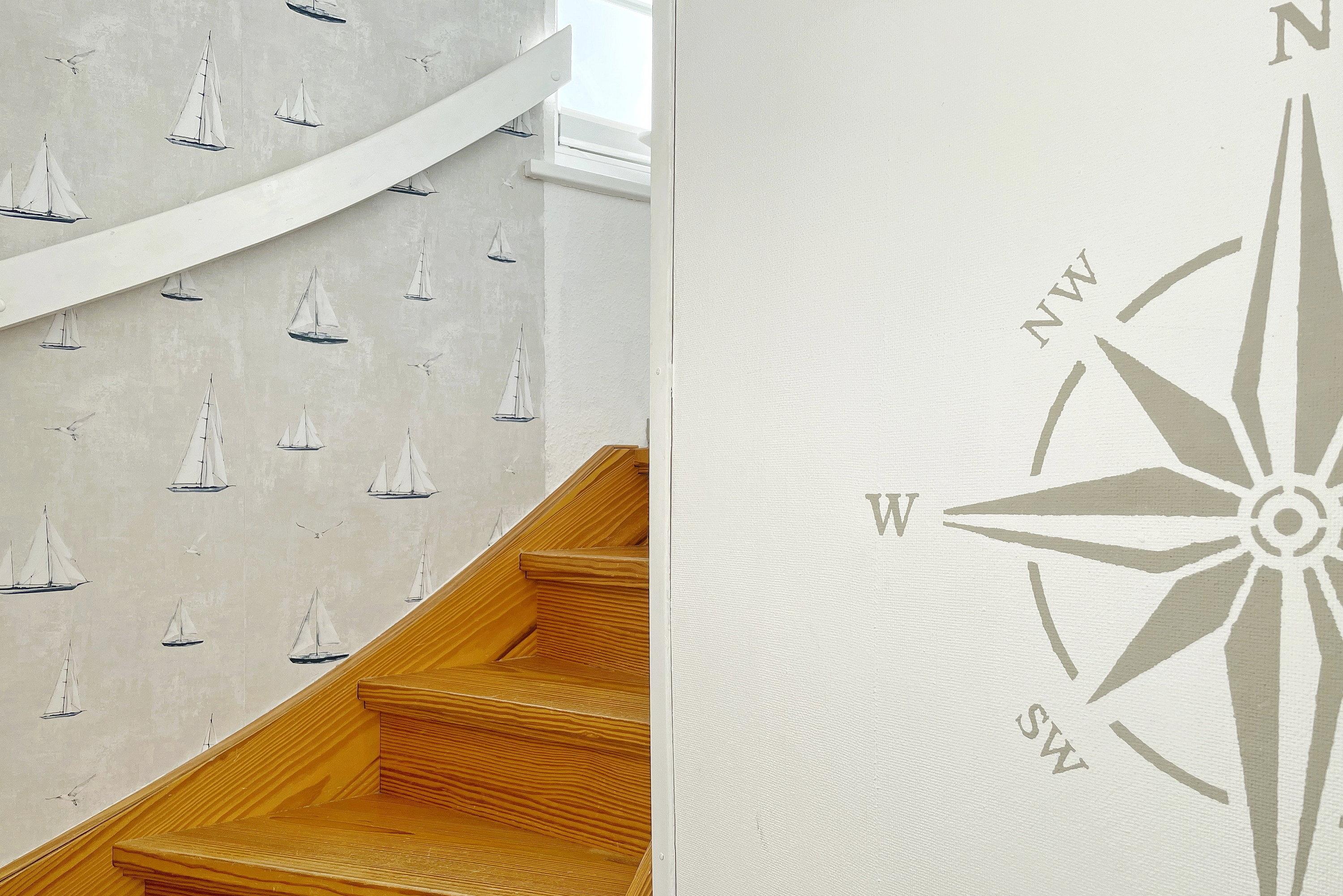 Die lichtdurchflutete Wohnung verteilt sich auf 2 Etagen. Im 1. Obergeschoss befinden sich das liebevoll mit kleinen Details dekorierte Wohnzimmer, eine gut ausgestattete Küchenzeile mit Essbereich, ein Badezimmer mit Dusche und ein gemütliches Schlafzimmer mit Doppelbett (160x200 cm) und Kleiderschrank. Über eine robuste Treppe geht’s ins Dachgeschoss. Drei Einzelbetten (90x200cm), ein Kleiderschrank und ein Schreibtisch sowie ein zusätzlicher Fernseher stehen für Sie bereit. Maritim eingerichtet präsentiert sich dieser Raum nicht nur als Schlafraum sondern auch als Wohlfühlraum, wenn Sie sich mal zurückziehen wollen. Für Schietwedder-Tage haben wir für die Großen und Kleinen Gesellschaftsspiele, Bücher, Kabel TV und Stereoanlage, falls mal Langeweile aufkommen sollte.