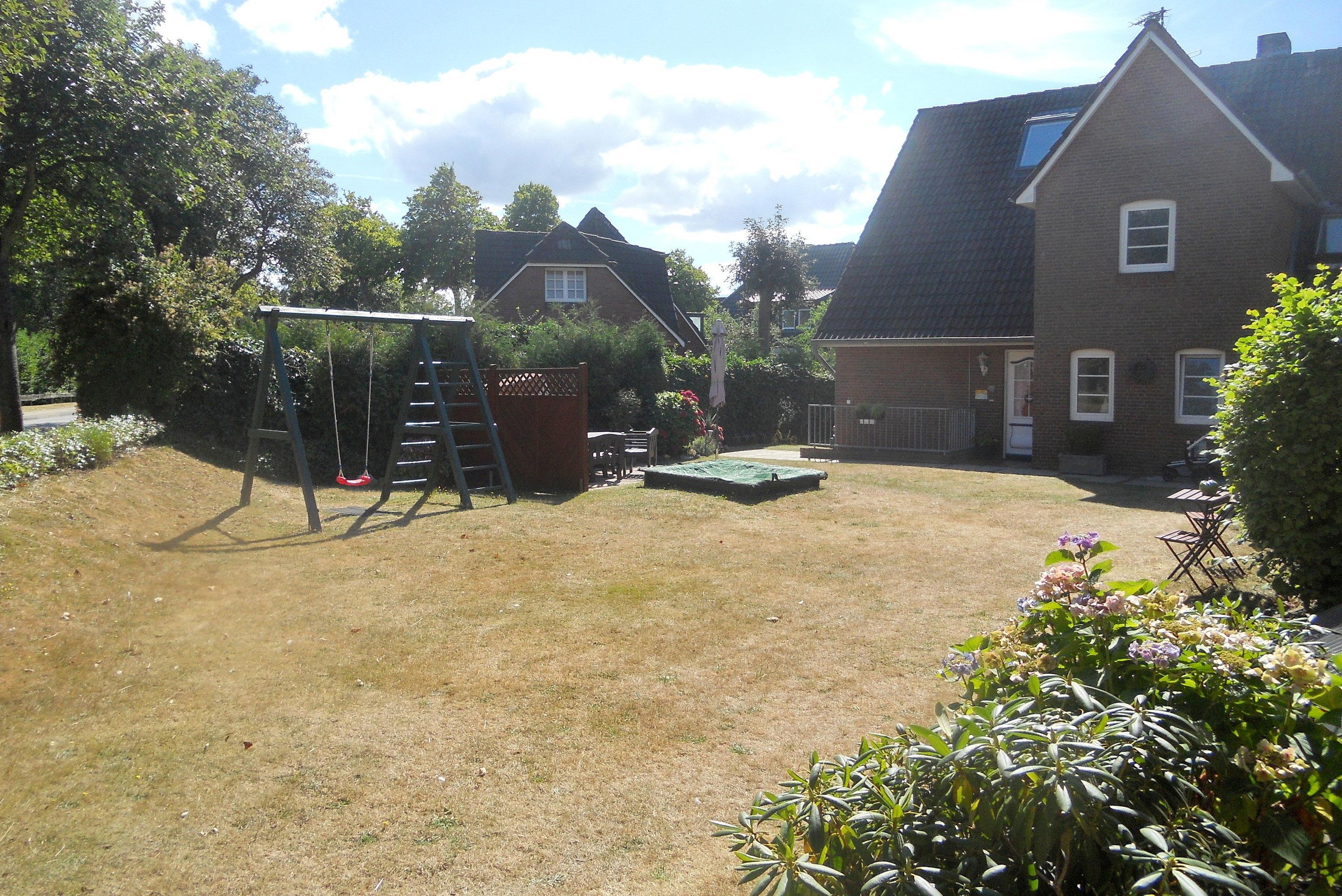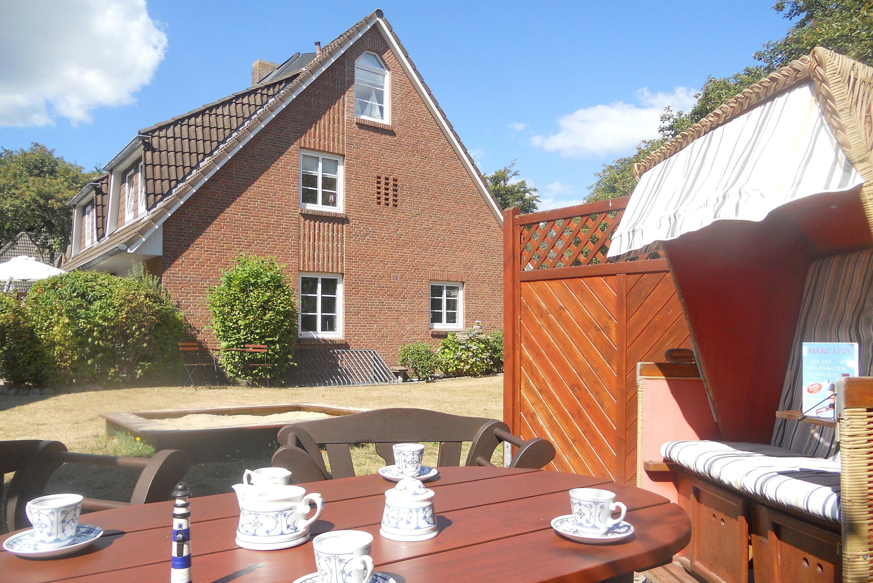 Frühstück im Bett oder doch lieber im angrenzenden Garten? – Beides ist möglich! Der Garten bietet neben einer Sandkiste und einer Schaukel auch eine Sitzecke mit Strandkorb. Hier besteht die Möglichkeit auch zu grillen.