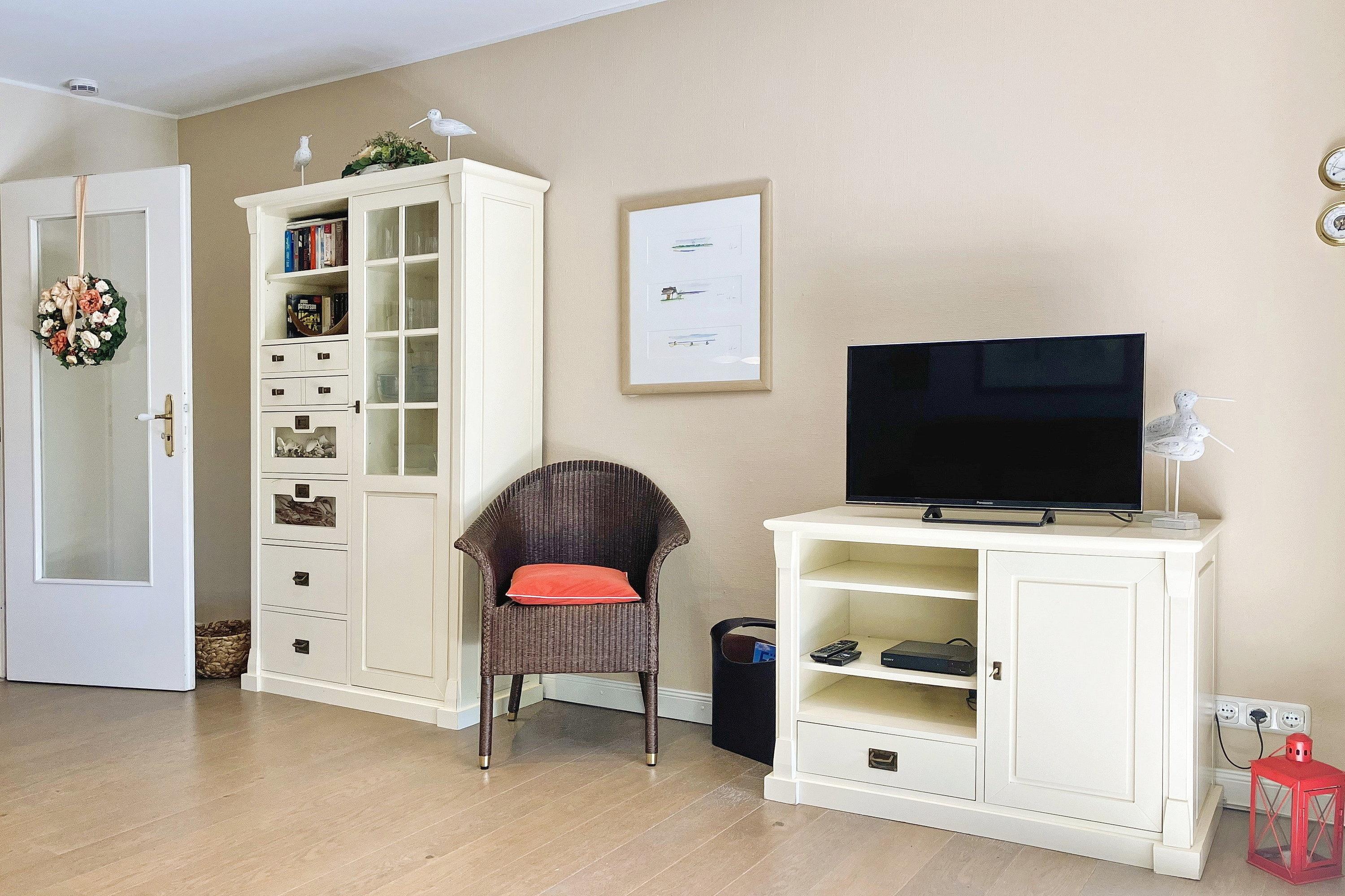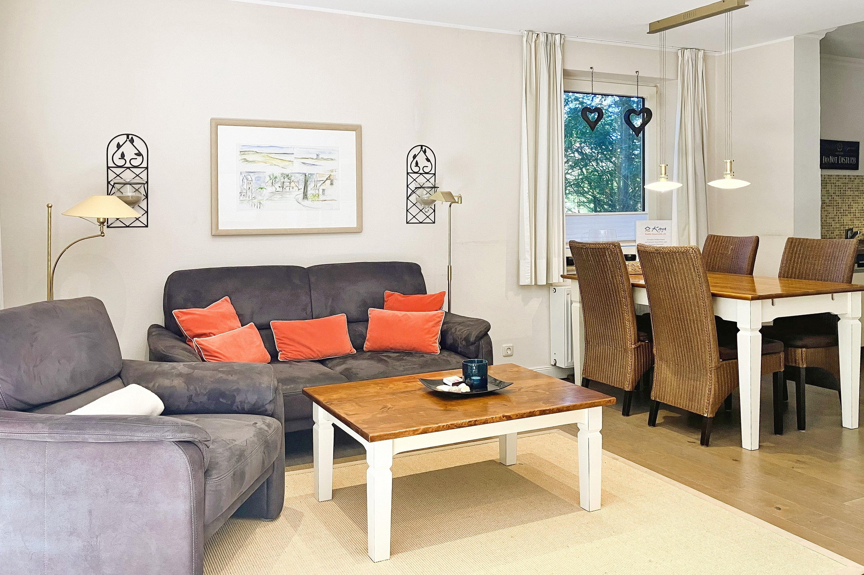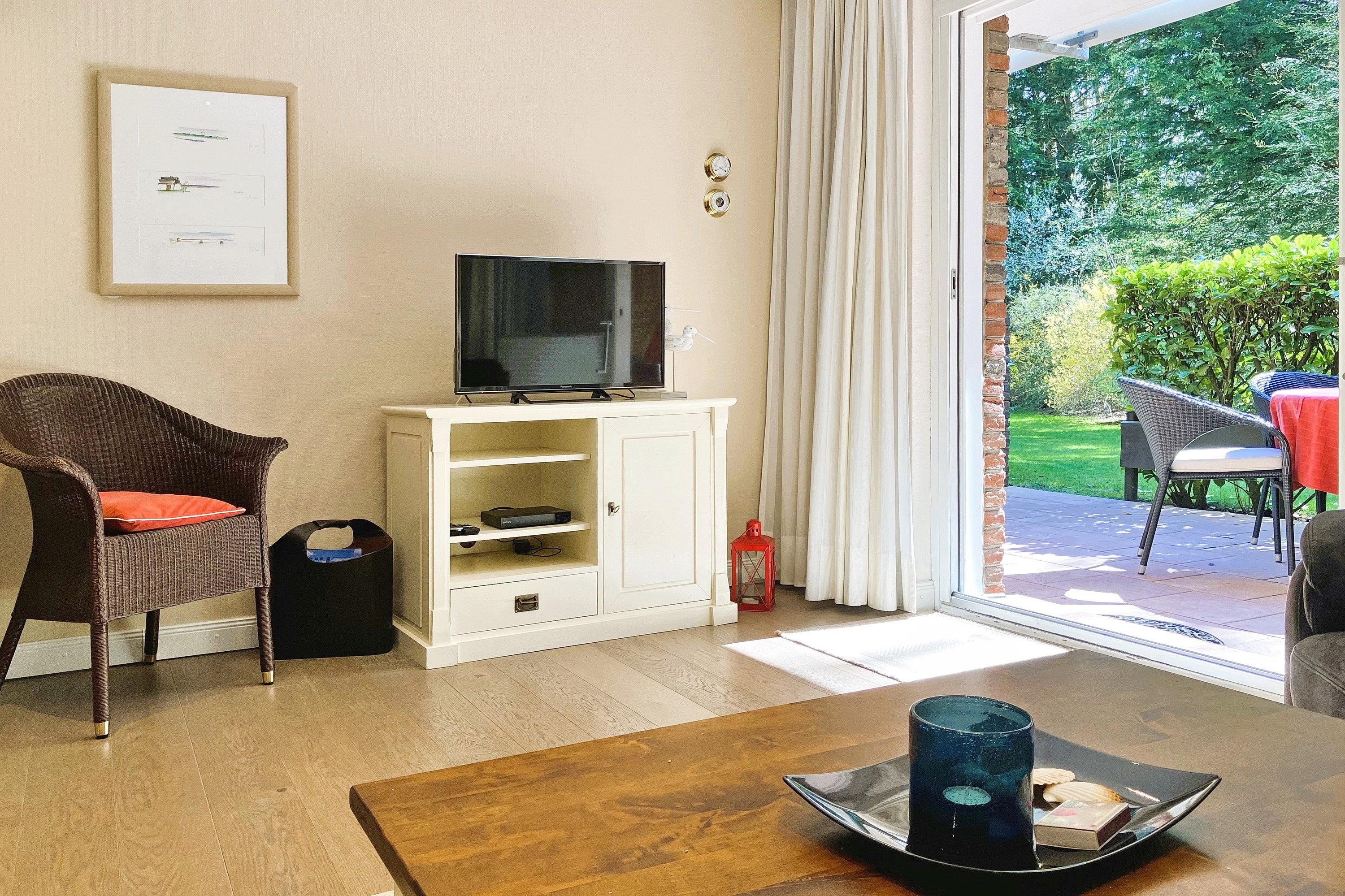 Früher war Föhr als die "grüne Insel" bekannt und in unserer "Wohnung 12 am Südstrand" wird man daran erinnert. Nur ca. 200m entfernt vom beliebten Wyker Südstrand liegt die Unterkunft mitten im alten Kurpark mit seinem vielseitigen Baumbestand. Hier können bis zu 4 Personen entspannen und vom stressigen Alltag abschalten. Genießen können Sie nicht nur die Lage inmitten der Natur, sondern auch Ihr Feriendomizil mit der hochwertigen und geschmackvollen Einrichtung, die keine Wünsche offen lässt. Zwei gemütliche Schlafzimmer, ein Bad mit ebenerdiger Dusche und der weitläufige Wohnbereich mit bequemer Sitzgruppe, Essecke und Küchenzeile sind charmant und gepflegt. Auf Ihrer Terrasse wartet in den Sommermonaten (ca. Mai bis ca. September) ein eigener Strandkorb auf Sie, der das Föhr-Urlaubs-Feeling vollendet. Buchen Sie gleich Ihren nächsten Föhr-Aufenthalt in unserer Wohnung 12 am Südstrand.