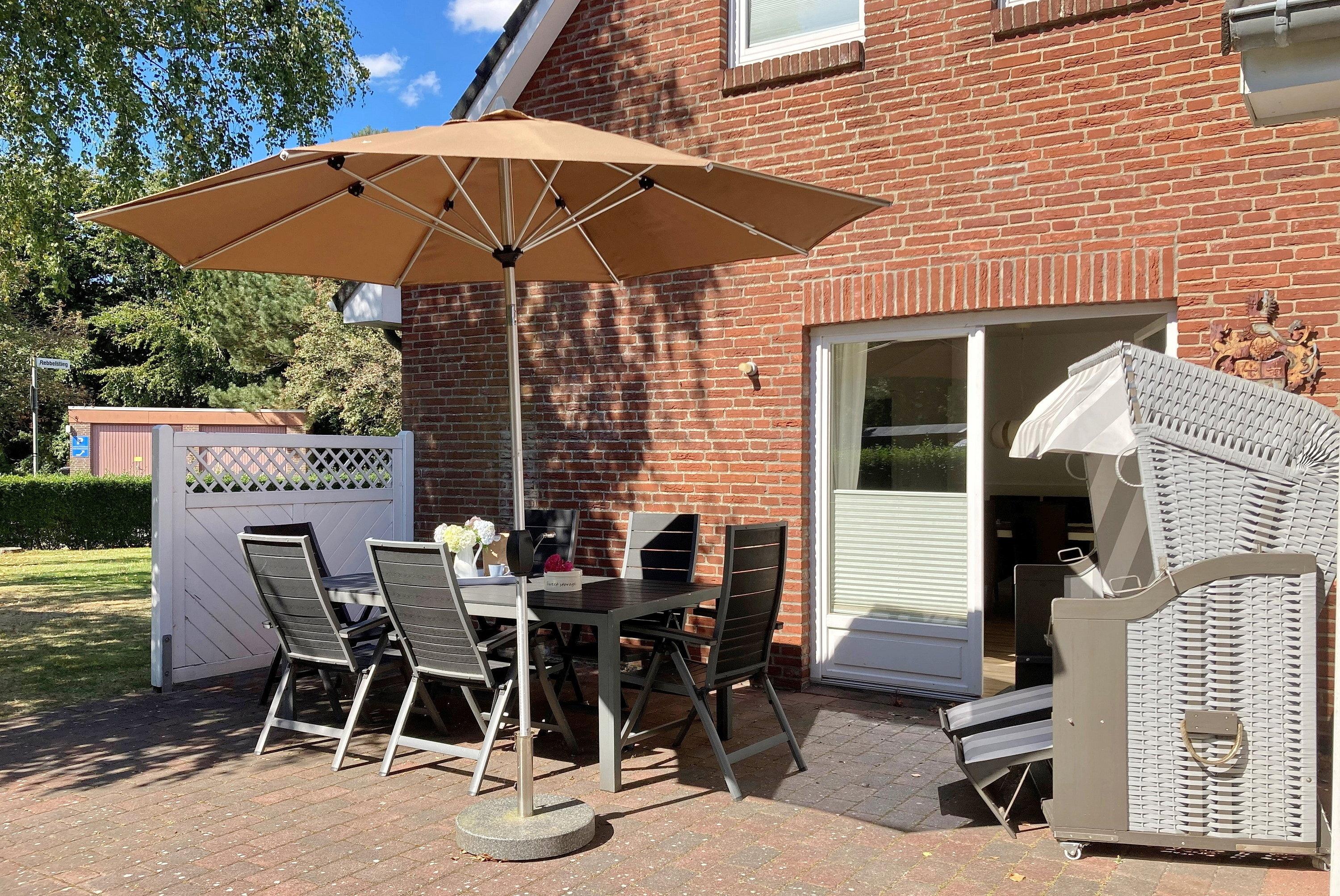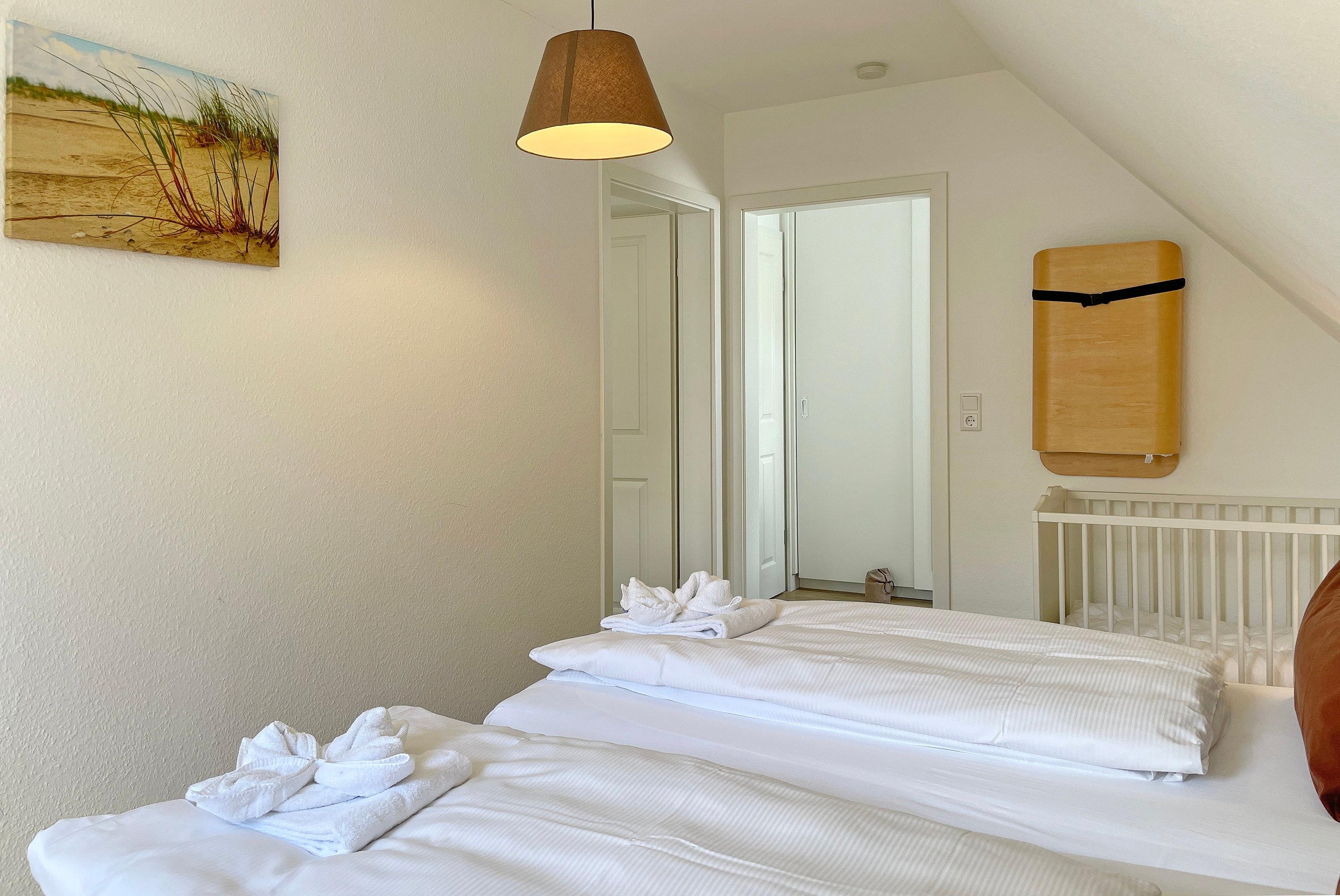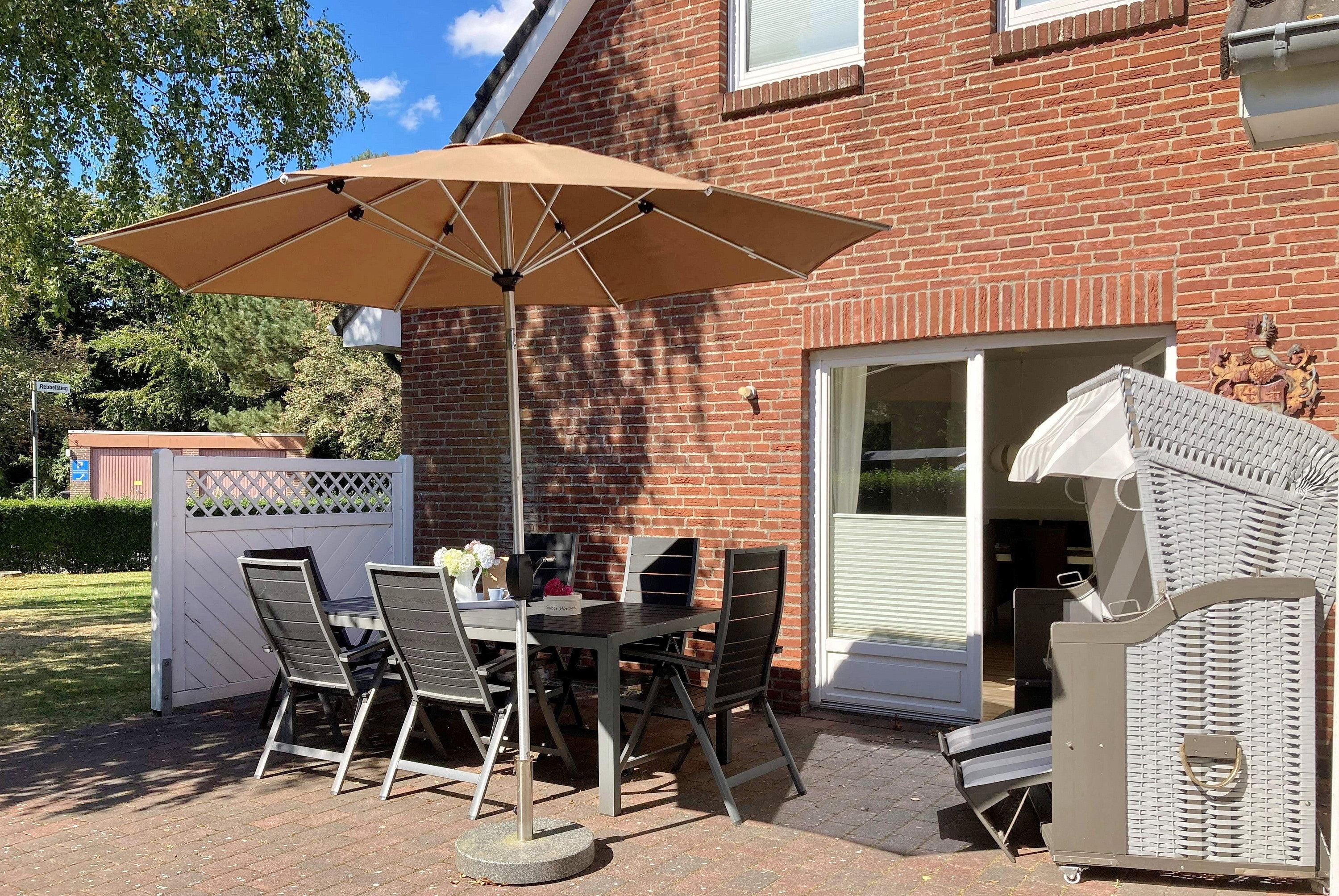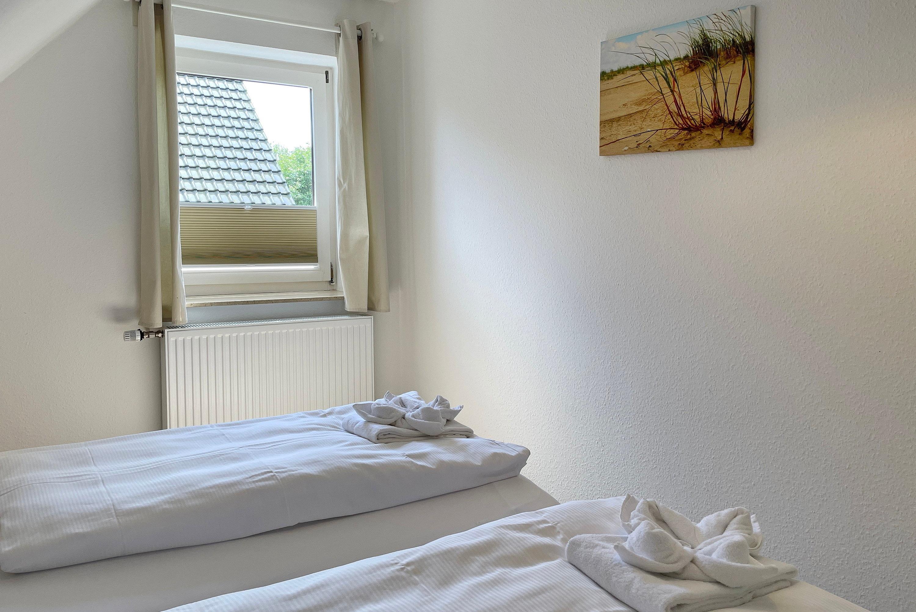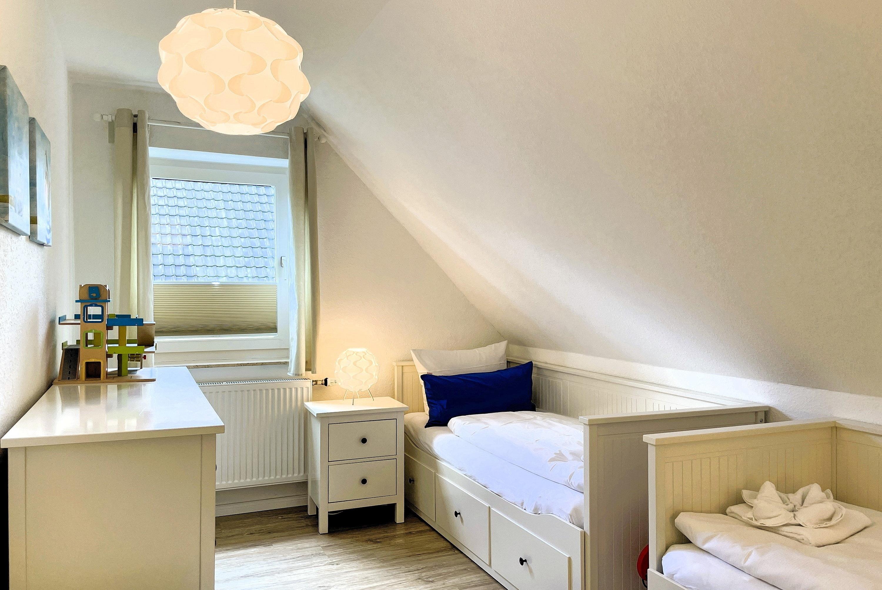 Über kurze Wege erreichen Sie die Innenstadt, die Strandpromenade mit ihren vielen Cafés und Boutiquen, sowie den Strand. Das Haupthaus ( Friesenstern 1 ) erstreckt sich für bis zu 6 Personen über 2 Ebenen, zuzüglich Keller. Es empfängt Sie ein großzügiger Eingangsbereich, mit Zugang zu einem Gäste WC, einem Schlafzimmer mit zwei Einzelbetten (80x200 cm), dem geschmackvoll eingerichteten Wohnzimmer und der Küche. Vom hellen Wohn- Essbereich gelangen Sie auf ihre eigene Terrasse mit Strandkorb und in den Garten. Die Küche ist erstklassig ausgestattet, so dass sie selbst im Urlaub zum Kochen einlädt. Im Obergeschoss finden Sie ein Schlafzimmer mit einem Doppelbett (200x200 cm mit 2 Matratzen) und einem Babybett, sowie Wickelbereich, mit Zugang zu einem weiteren Schlafzimmer mit 2 Einzelbetten (80x200 cm). Ein weiteres Kinderbett kann dazu gestellt werden, so dass 6 Personen mit zwei Kleinkinder genügend Platz finden. Direkt neben dem Elternschlafzimmer befindet sich ein Ankleidezimmer mit Schreibecke, für das Erledigen Ihrer Urlaubspost oder sonstigen Schreibarbeiten. Des weiteren finden Sie in dieser Etage auch das große und moderne Badezimmer mit Dusche und Badewanne.