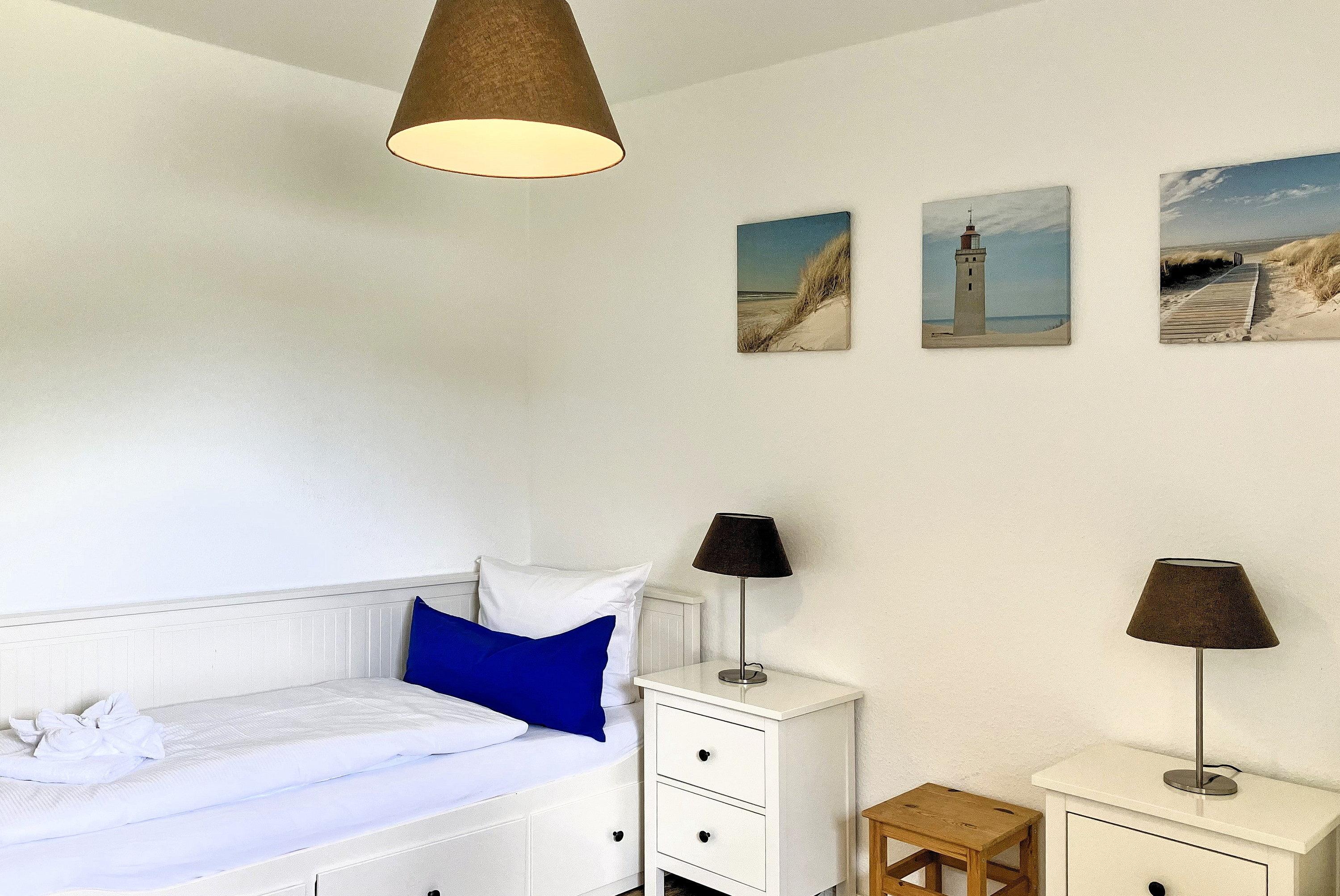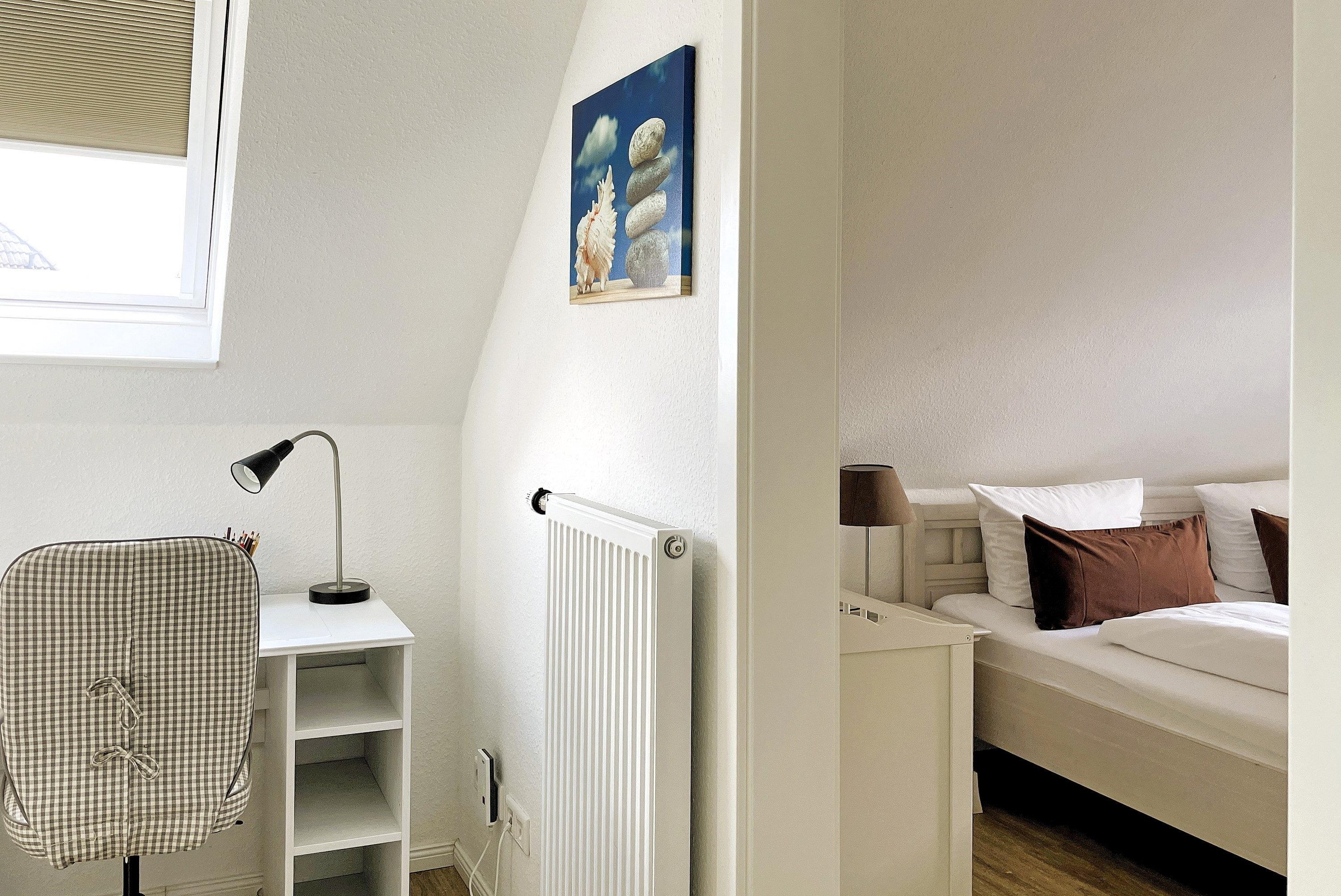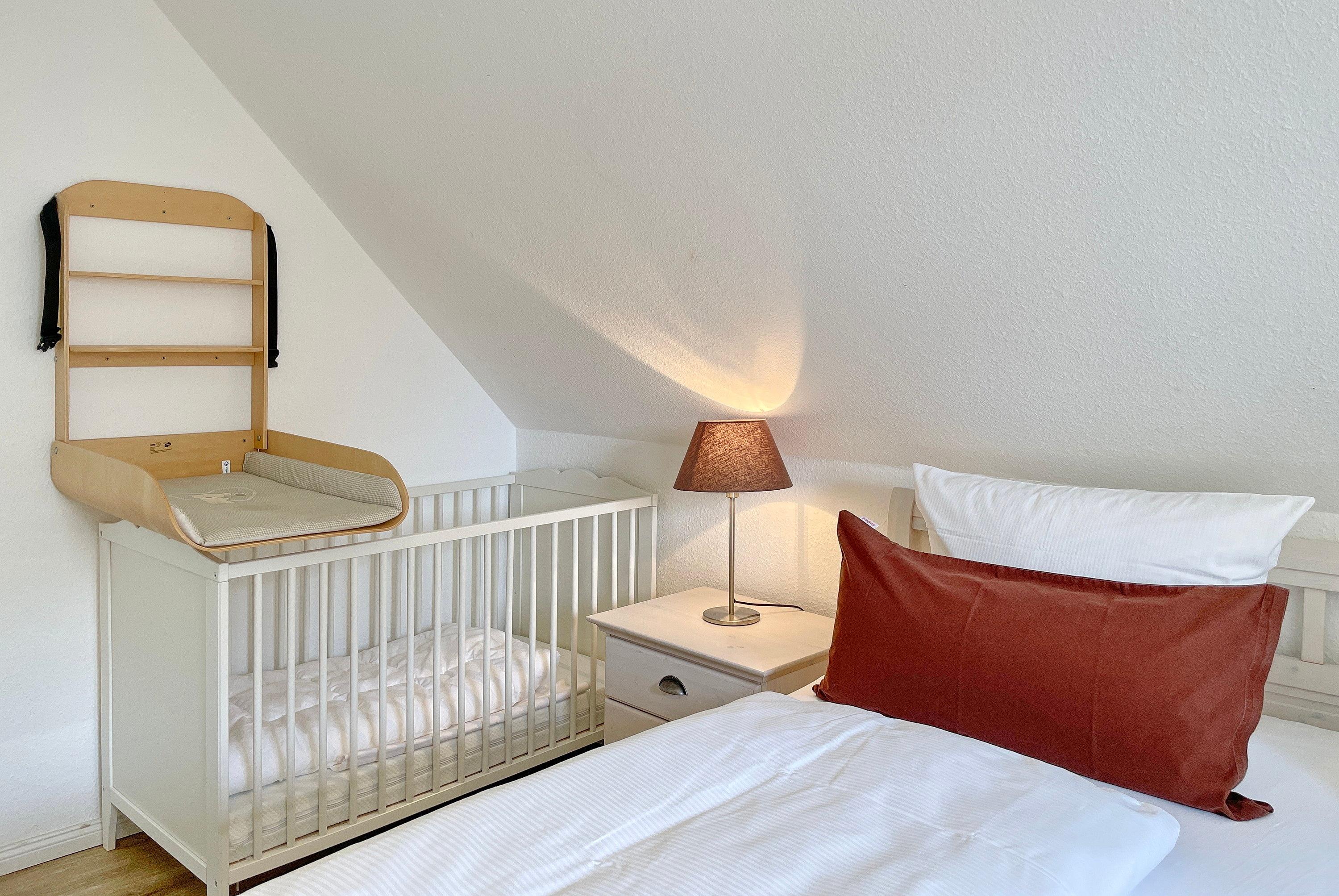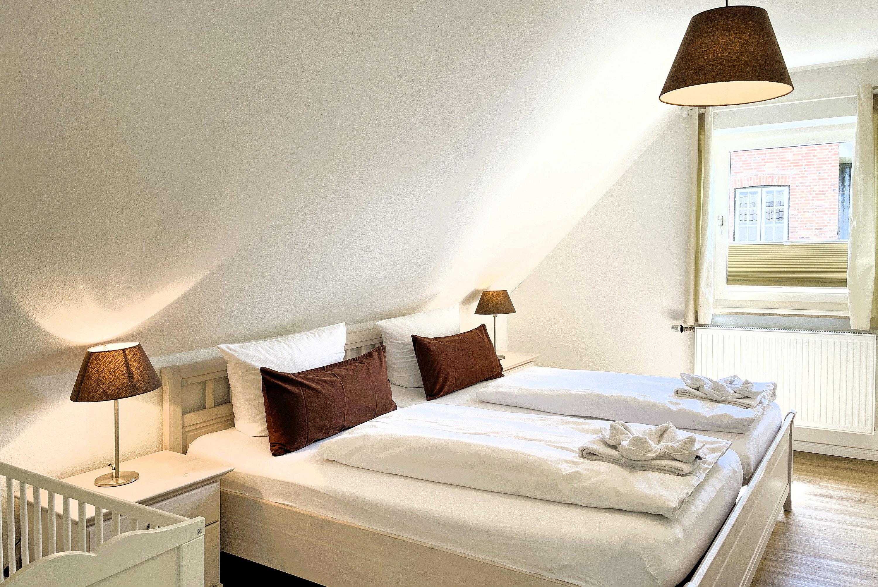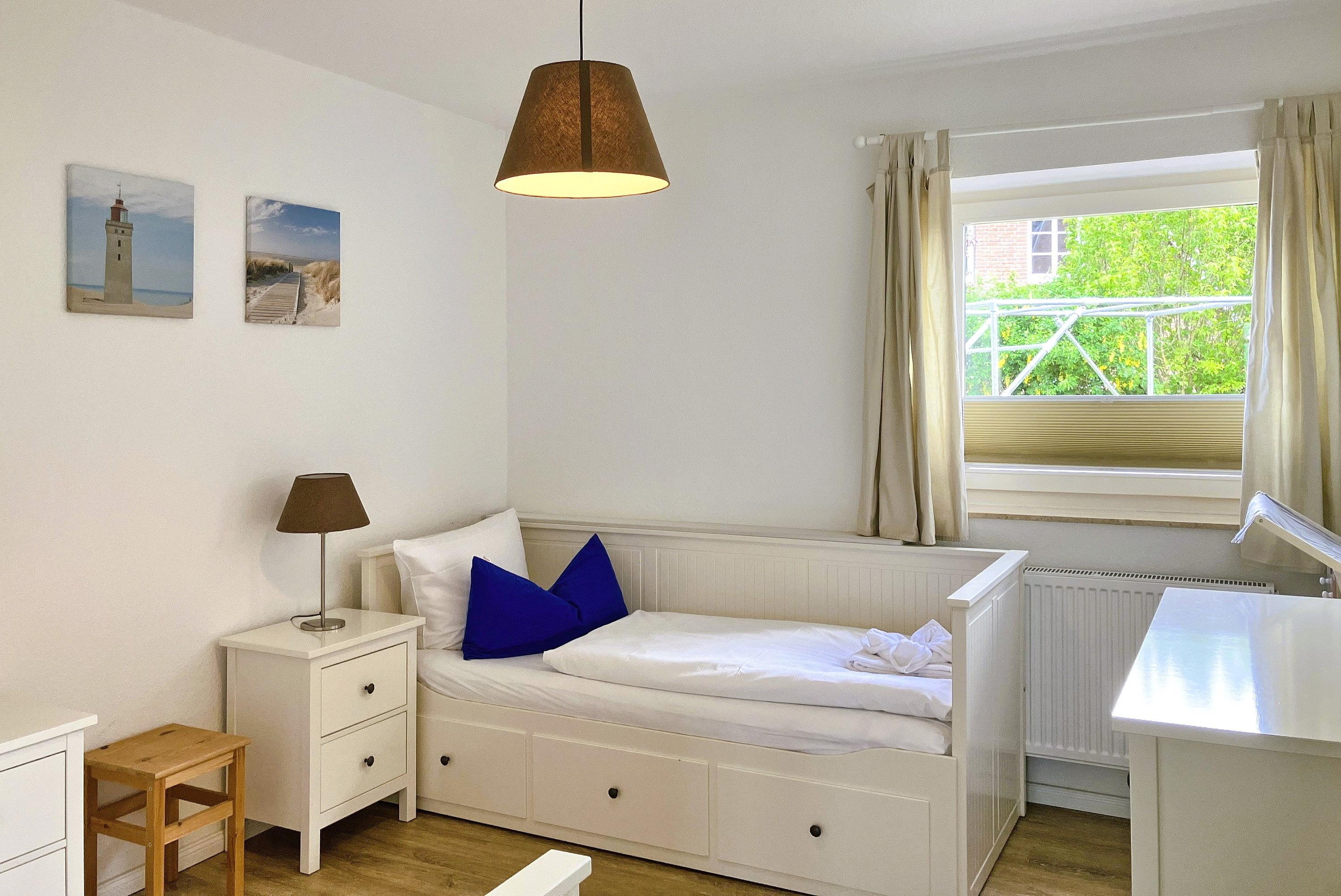 Über kurze Wege erreichen Sie die Innenstadt, die Strandpromenade mit ihren vielen Cafés und Boutiquen, sowie den Strand. Das Haupthaus ( Friesenstern 1 ) erstreckt sich für bis zu 6 Personen über 2 Ebenen, zuzüglich Keller. Es empfängt Sie ein großzügiger Eingangsbereich, mit Zugang zu einem Gäste WC, einem Schlafzimmer mit zwei Einzelbetten (80x200 cm), dem geschmackvoll eingerichteten Wohnzimmer und der Küche. Vom hellen Wohn- Essbereich gelangen Sie auf ihre eigene Terrasse mit Strandkorb und in den Garten. Die Küche ist erstklassig ausgestattet, so dass sie selbst im Urlaub zum Kochen einlädt. Im Obergeschoss finden Sie ein Schlafzimmer mit einem Doppelbett (200x200 cm mit 2 Matratzen) und einem Babybett, sowie Wickelbereich, mit Zugang zu einem weiteren Schlafzimmer mit 2 Einzelbetten (80x200 cm). Ein weiteres Kinderbett kann dazu gestellt werden, so dass 6 Personen mit zwei Kleinkinder genügend Platz finden. Direkt neben dem Elternschlafzimmer befindet sich ein Ankleidezimmer mit Schreibecke, für das Erledigen Ihrer Urlaubspost oder sonstigen Schreibarbeiten. Des weiteren finden Sie in dieser Etage auch das große und moderne Badezimmer mit Dusche und Badewanne.