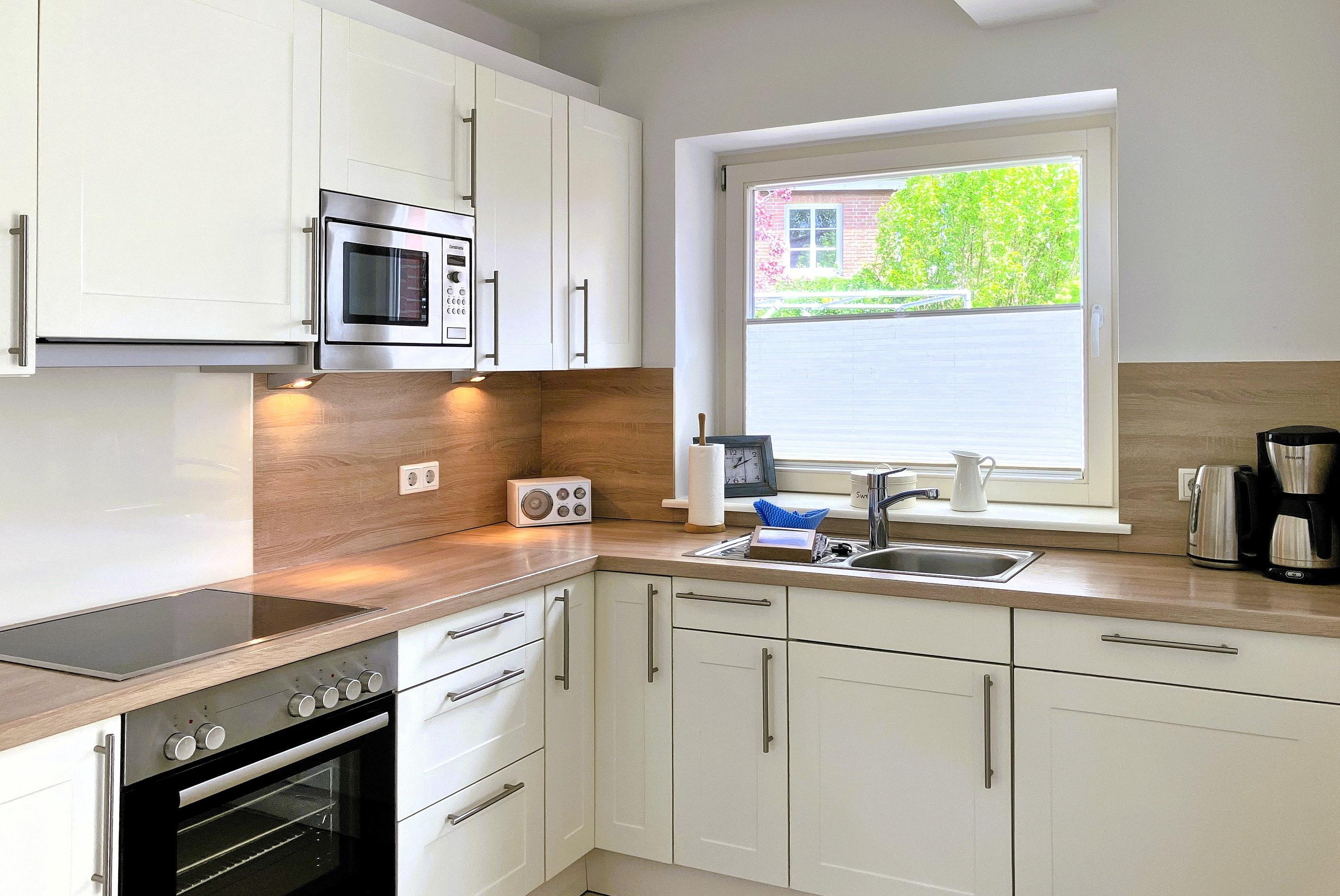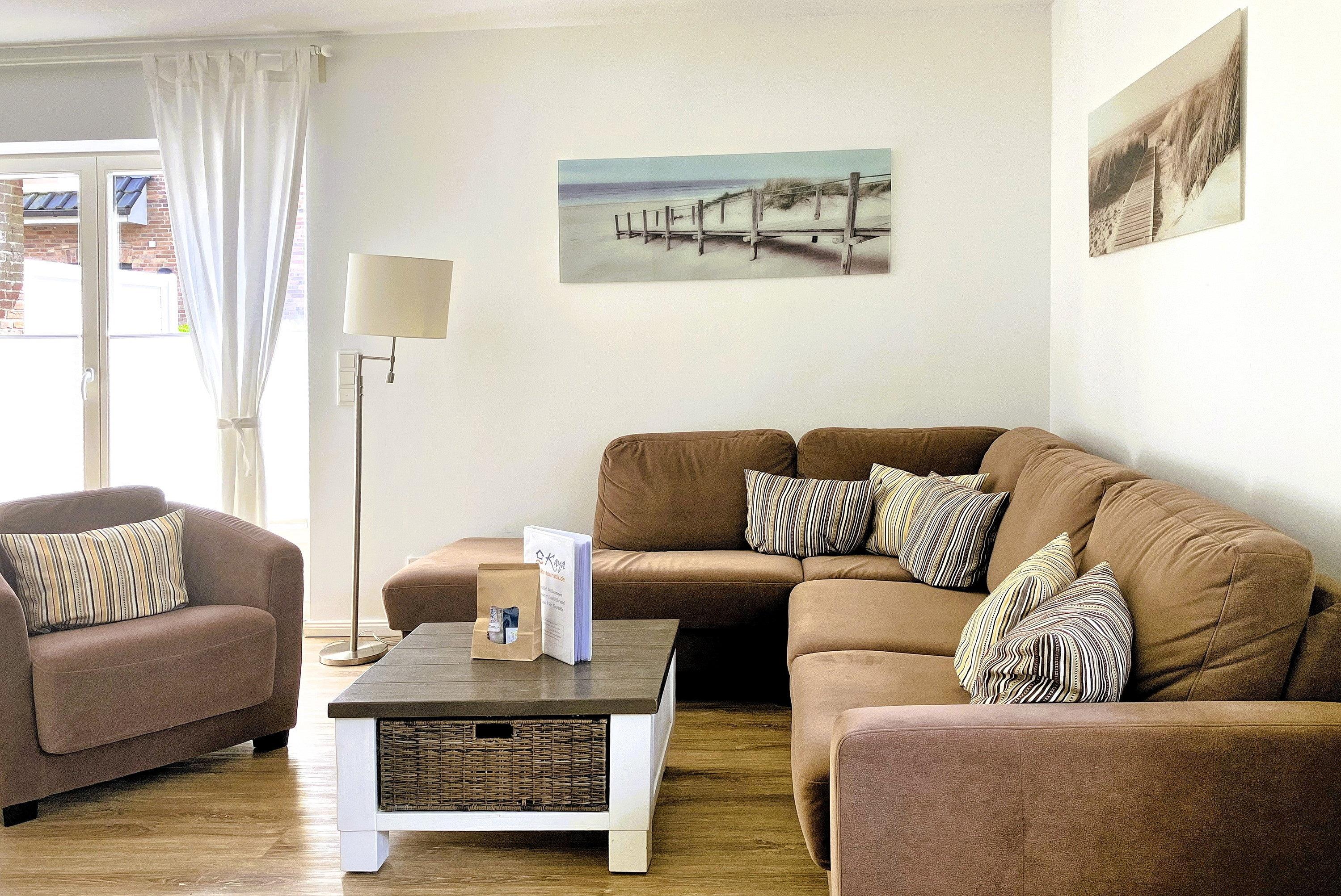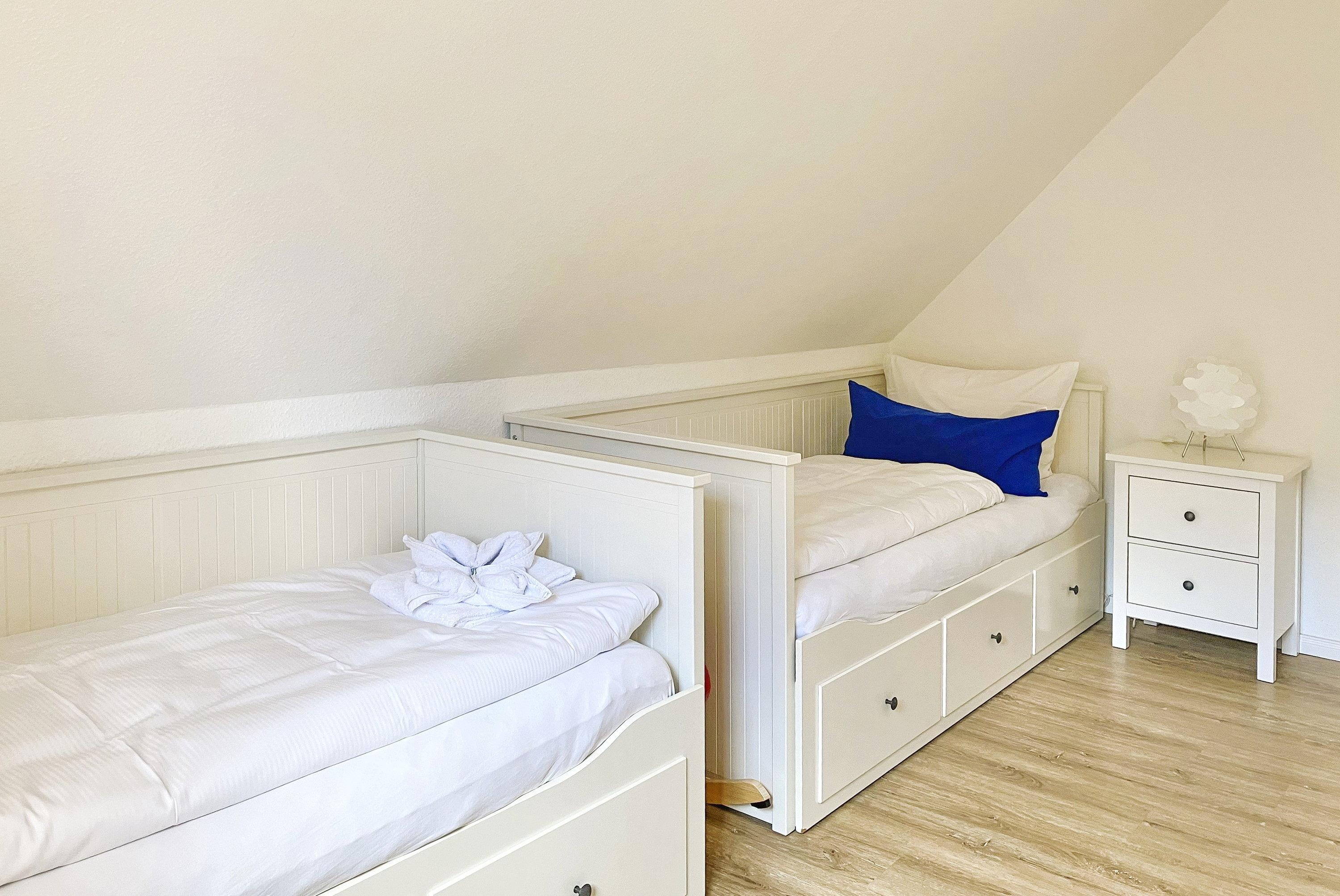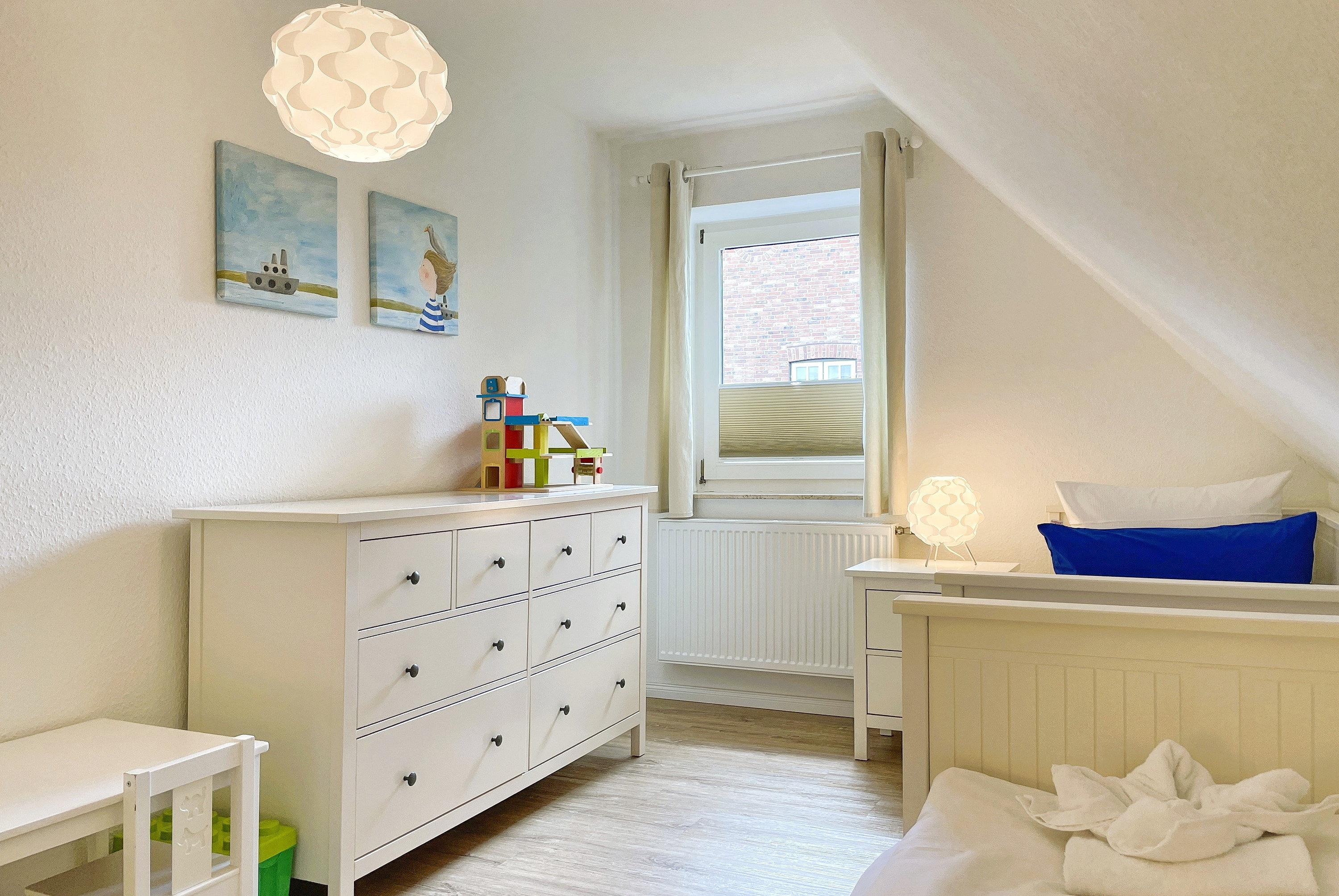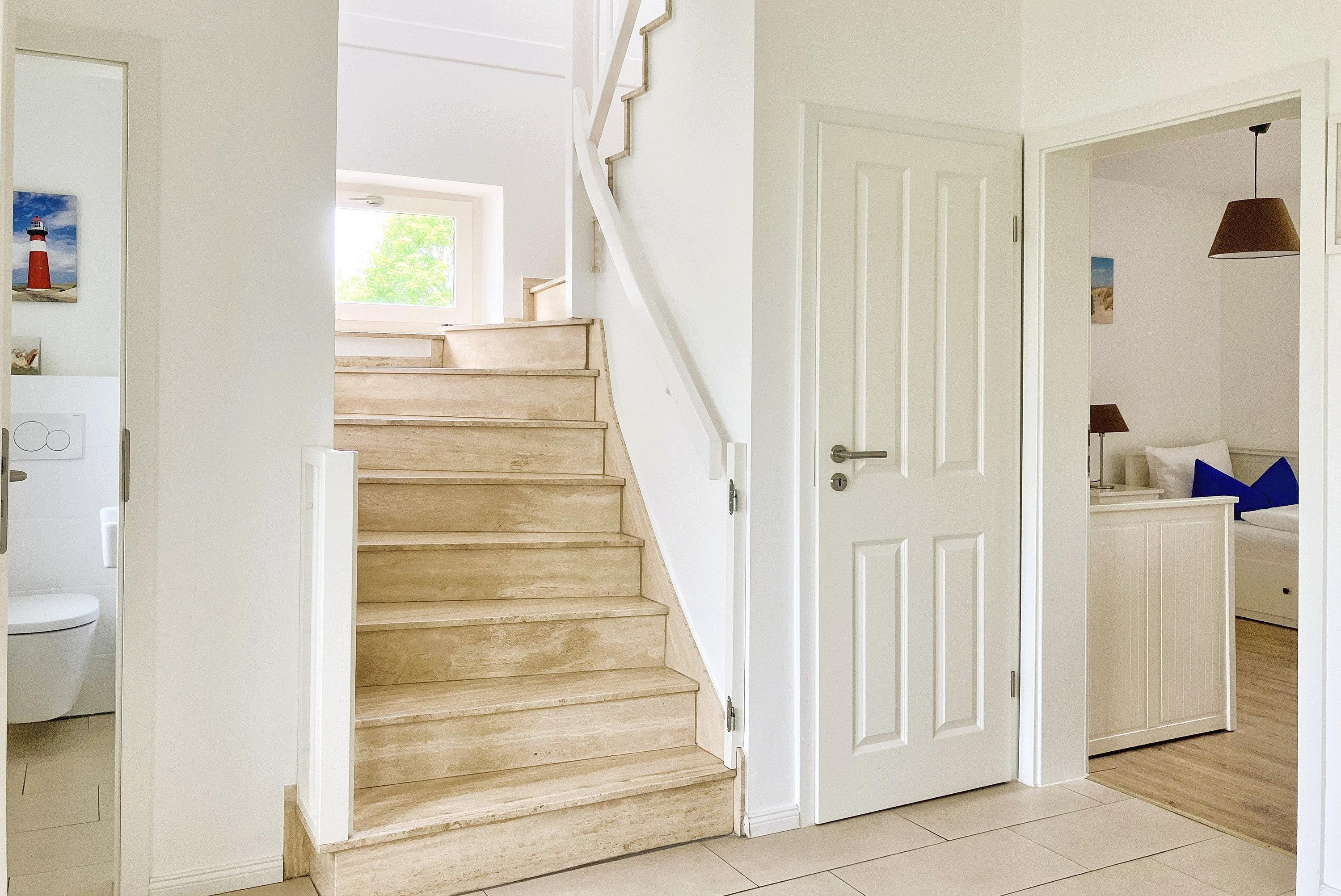 Über kurze Wege erreichen Sie die Innenstadt, die Strandpromenade mit ihren vielen Cafés und Boutiquen, sowie den Strand. Das Haupthaus ( Friesenstern 1 ) erstreckt sich für bis zu 6 Personen über 2 Ebenen, zuzüglich Keller. Es empfängt Sie ein großzügiger Eingangsbereich, mit Zugang zu einem Gäste WC, einem Schlafzimmer mit zwei Einzelbetten (80x200 cm), dem geschmackvoll eingerichteten Wohnzimmer und der Küche. Vom hellen Wohn- Essbereich gelangen Sie auf ihre eigene Terrasse mit Strandkorb und in den Garten. Die Küche ist erstklassig ausgestattet, so dass sie selbst im Urlaub zum Kochen einlädt. Im Obergeschoss finden Sie ein Schlafzimmer mit einem Doppelbett (200x200 cm mit 2 Matratzen) und einem Babybett, sowie Wickelbereich, mit Zugang zu einem weiteren Schlafzimmer mit 2 Einzelbetten (80x200 cm). Ein weiteres Kinderbett kann dazu gestellt werden, so dass 6 Personen mit zwei Kleinkinder genügend Platz finden. Direkt neben dem Elternschlafzimmer befindet sich ein Ankleidezimmer mit Schreibecke, für das Erledigen Ihrer Urlaubspost oder sonstigen Schreibarbeiten. Des weiteren finden Sie in dieser Etage auch das große und moderne Badezimmer mit Dusche und Badewanne.