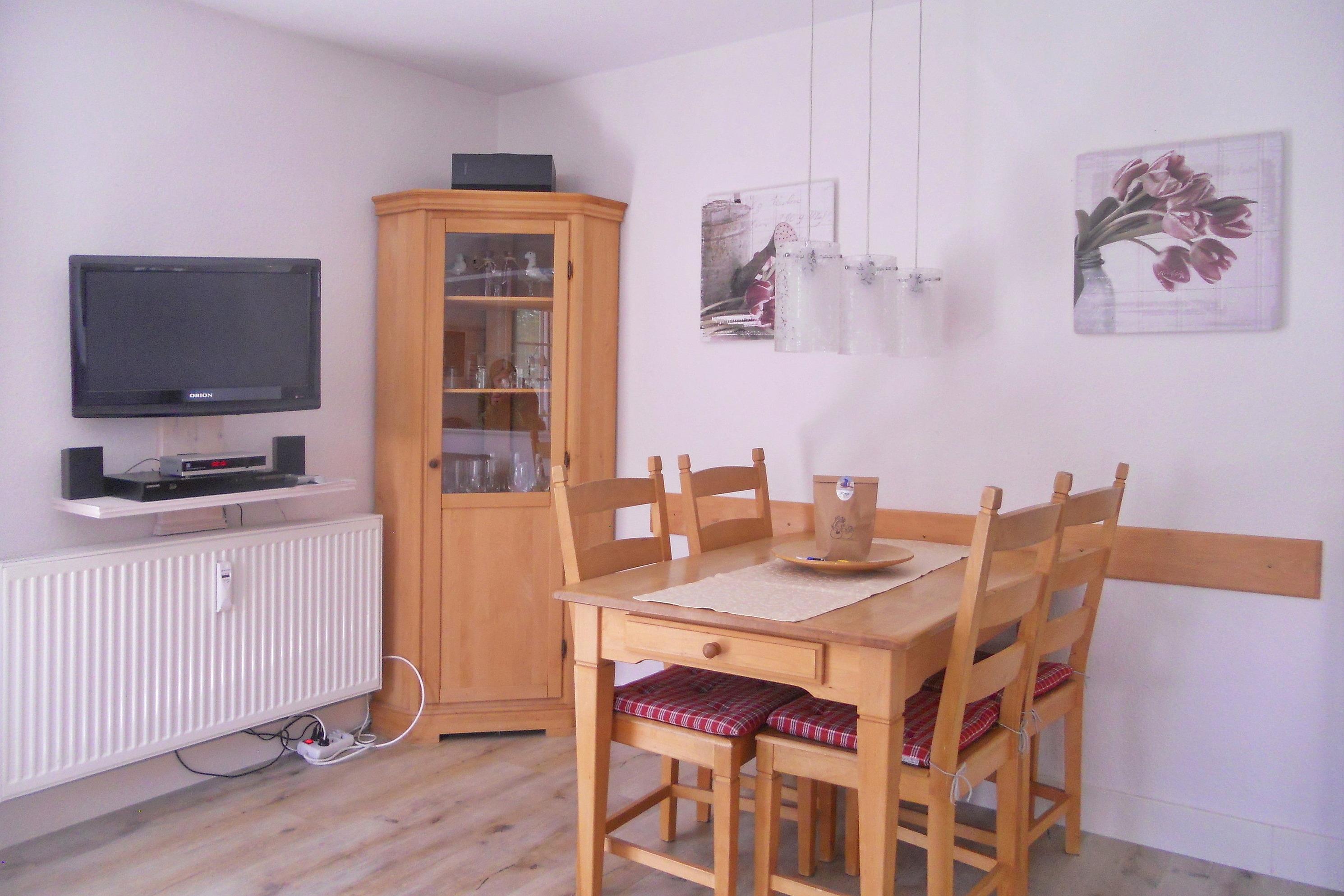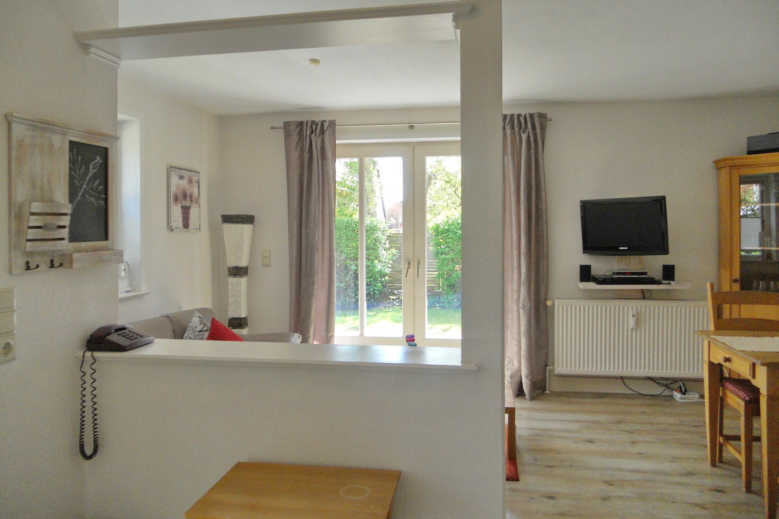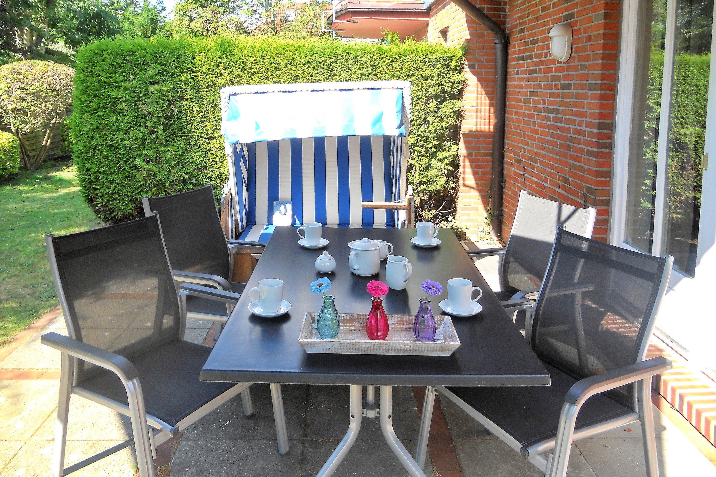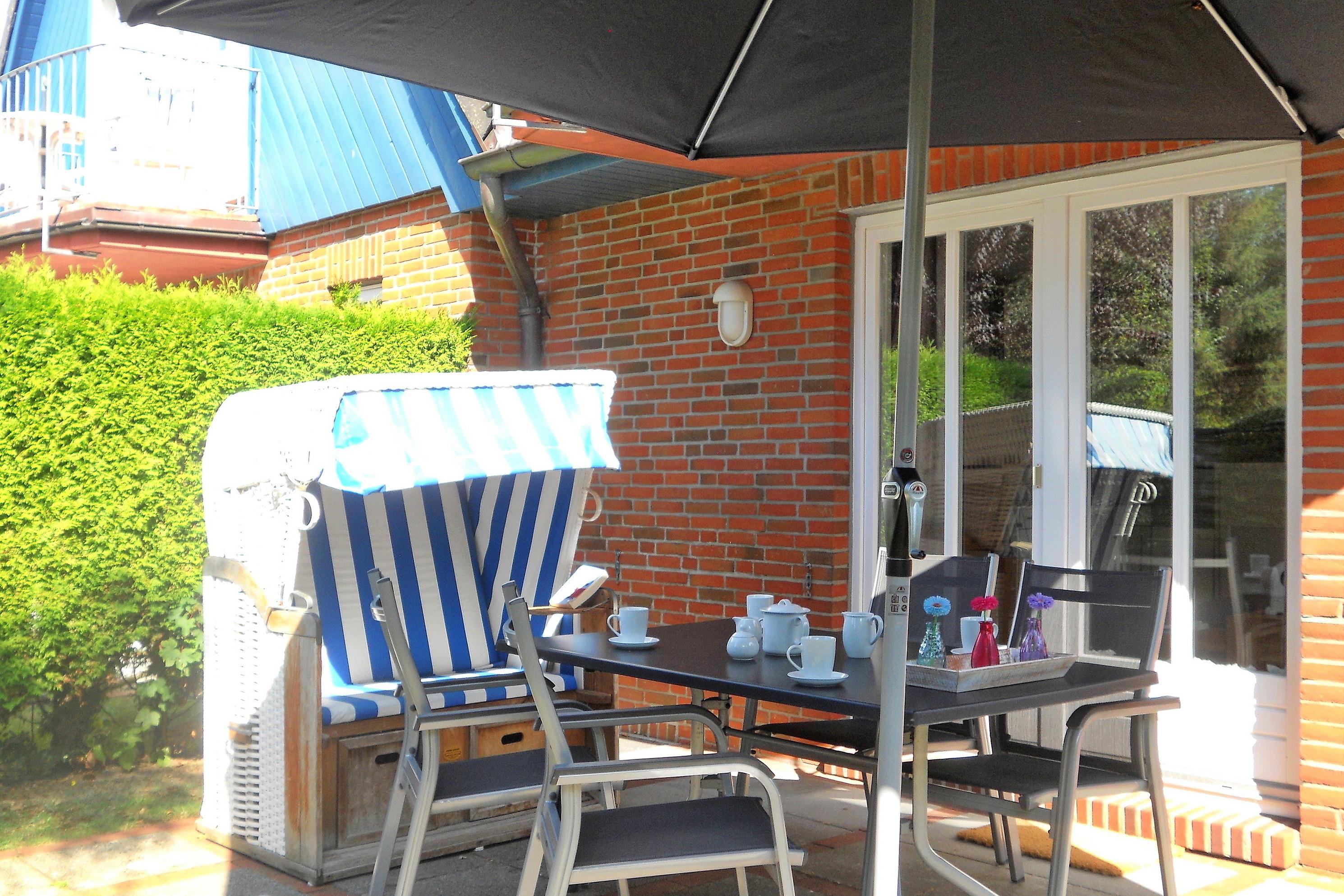 Die schöne Anlage Friesenperle in der Feldstraße 15 a und b besteht aus zwei Häusern mit jeweils 6 Wohneinheiten. Auf dem Grundstück befindet sich eine kleine Grillecke, Abstellmöglichkeiten für Ihre Fahrräder, für jede Wohnung ein eigener Parkplatz sowie für unsere kleinen Gäste eine Doppelschaukel mit Kletterleiter um sich auszutoben. Im vorderen Gebäude steht allen Gästen zur gemeinschaftlichen Nutzung im Keller ein Waschraum mit Waschmaschine und Trockner ( jeweils gegen Gebühr), Wäscheständer und Bügelbrett mit Bügeleisen sowie eine Sauna (gegen Gebühr) mit Duschmöglichkeit und Ruheraum zur Verfügung. Durch die Lage in zweiter Reihe zur Straße ist die Anlage besonders bei befreundeten Familien, die gerne gemeinsam verreisen möchten besonders beliebt, doch auch Pärchen verleben wunderbare Urlaubstage. Die zentrale Lage ermöglicht es in wenigen Minuten das Friesenmuseum, das Wellenbad Aqua Föhr und den Abenteuerspielplatz Löwenhöhle im nahe gelegenen Wald zu besuchen oder einen Spaziergang durch die hübschen Gassen der Wyker Innenstadt zu unternehmen, um die vielen freundlichen Cafés, Geschäfte und Restaurants kennenzulernen. Unsere gemütliche EG-Wohnung Friesenperle 9 (ca. 45m) lädt zu herrlichen Urlaubstagen ein. Der offengestaltete Wohnbereich mit integriertem Essplatz und moderner Küchenzeile ist der Mittelpunkt der Wohnung und ist von den Eigentümern mit viel Liebe zum Detail eingerichtet und mit WLAN, Flachbild-TV, Stereoanlage und einem Blu-ray-Player ausgestattet wurden. Hier lassen sich gemütliche Abende verbringen oder genießen Sie einen Spieleabend am gemütlichen Esstisch. Die Küchenzeile ist ebenfalls sehr gut ausgestattet mit Backofen, Ceranfeldherd mit Dunstabzugshaube, Geschirrspüler, Wasserkocher, Filterkaffeemaschine und einer Tassimo-Maschine, so dass Ihnen der gehobene Komfort, den Sie von der Wohnung erwarten dürfen, geboten wird. Des Weiteren sind 2 Schlafräume vorhanden mit einem Doppelbett (160 x 200 cm) im Schlafzimmer und einem Etagenbett (80x 200 cm) im Kinderzimmer. Das Bad verfügt über einen Handtuchheizkörper, eine Dusche mit sehr flachem Einstieg, Fenster und einem Schrank, der Platz für Ihre Utensilien bereitstellt. Auf die nach Süden ausgerichtete Terrasse mit Möbeln und Strandkorb(ca. von April bis Oktober)gelangen Sie über eine doppelflügelige Tür und können schöne Sonnenstunden verbringen. Der gemeinschaftliche Grillplatz eignet sich hervorragend um neue Urlaubsbekanntschaften zu schließen und nach einem erholsamen Tag am Strand oder einer erlebnisreichen Inseltour den Abend in geselliger Runde mit Würstchen, Steak und Flens ausklingen zu lassen.