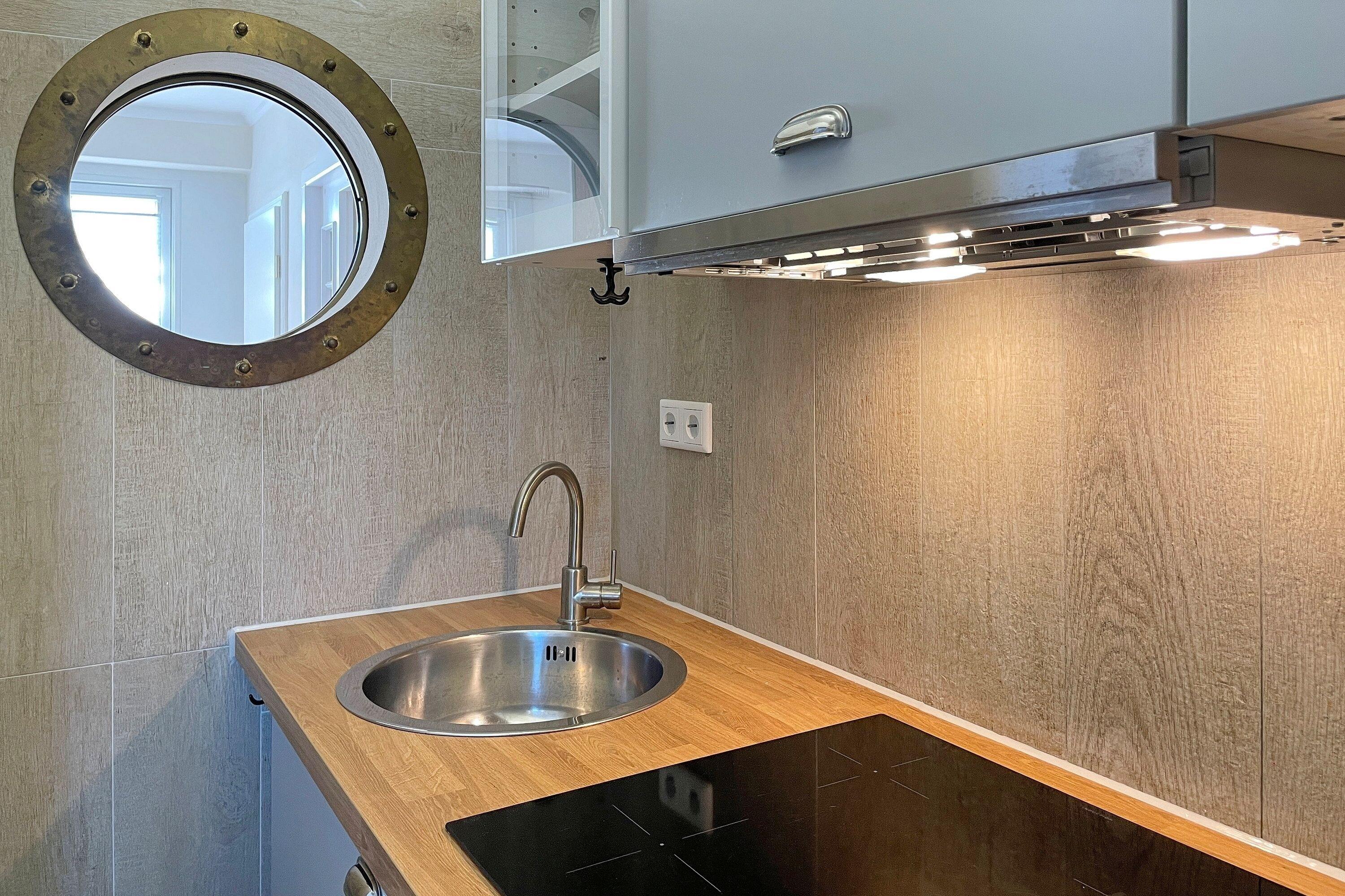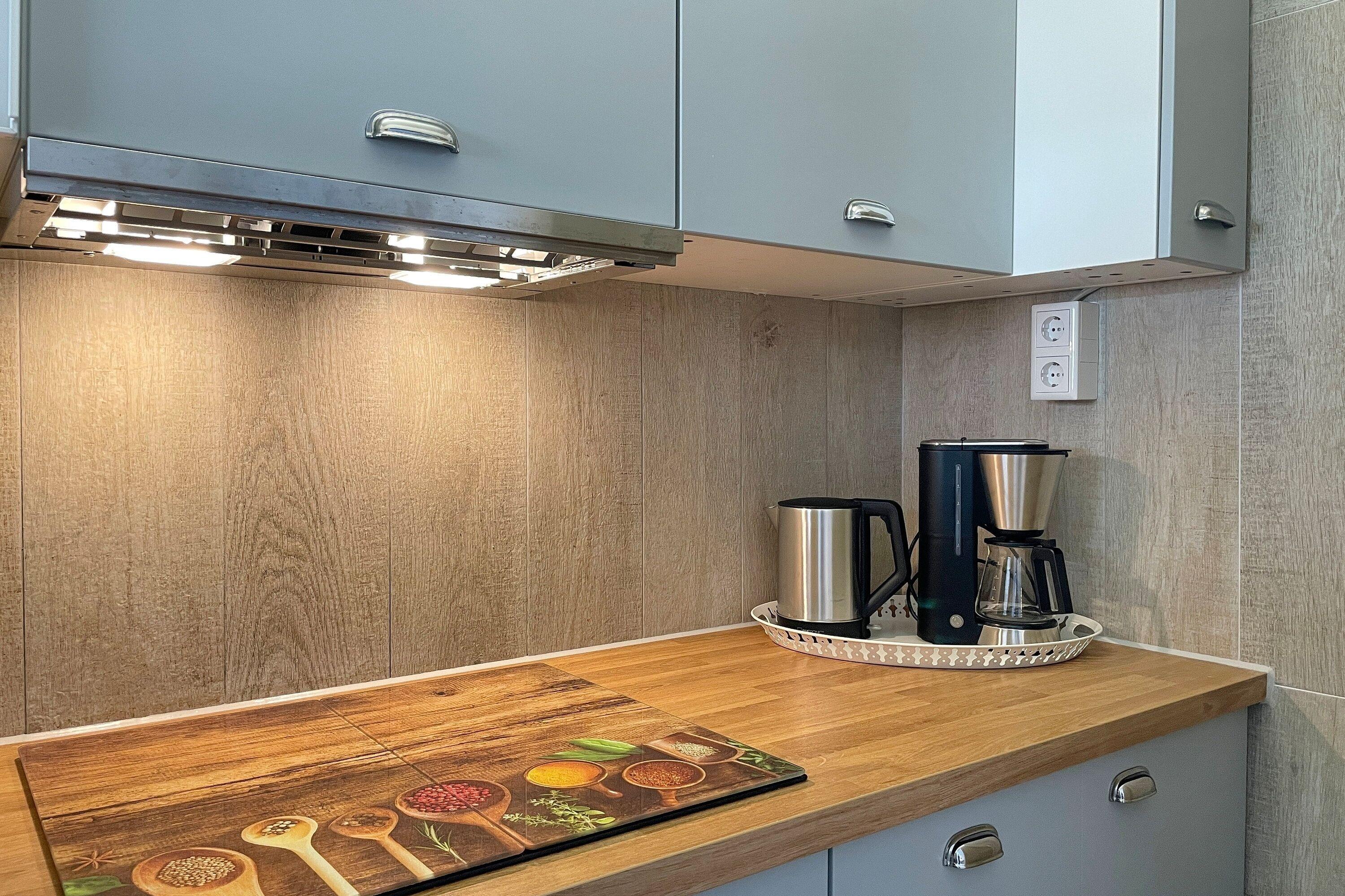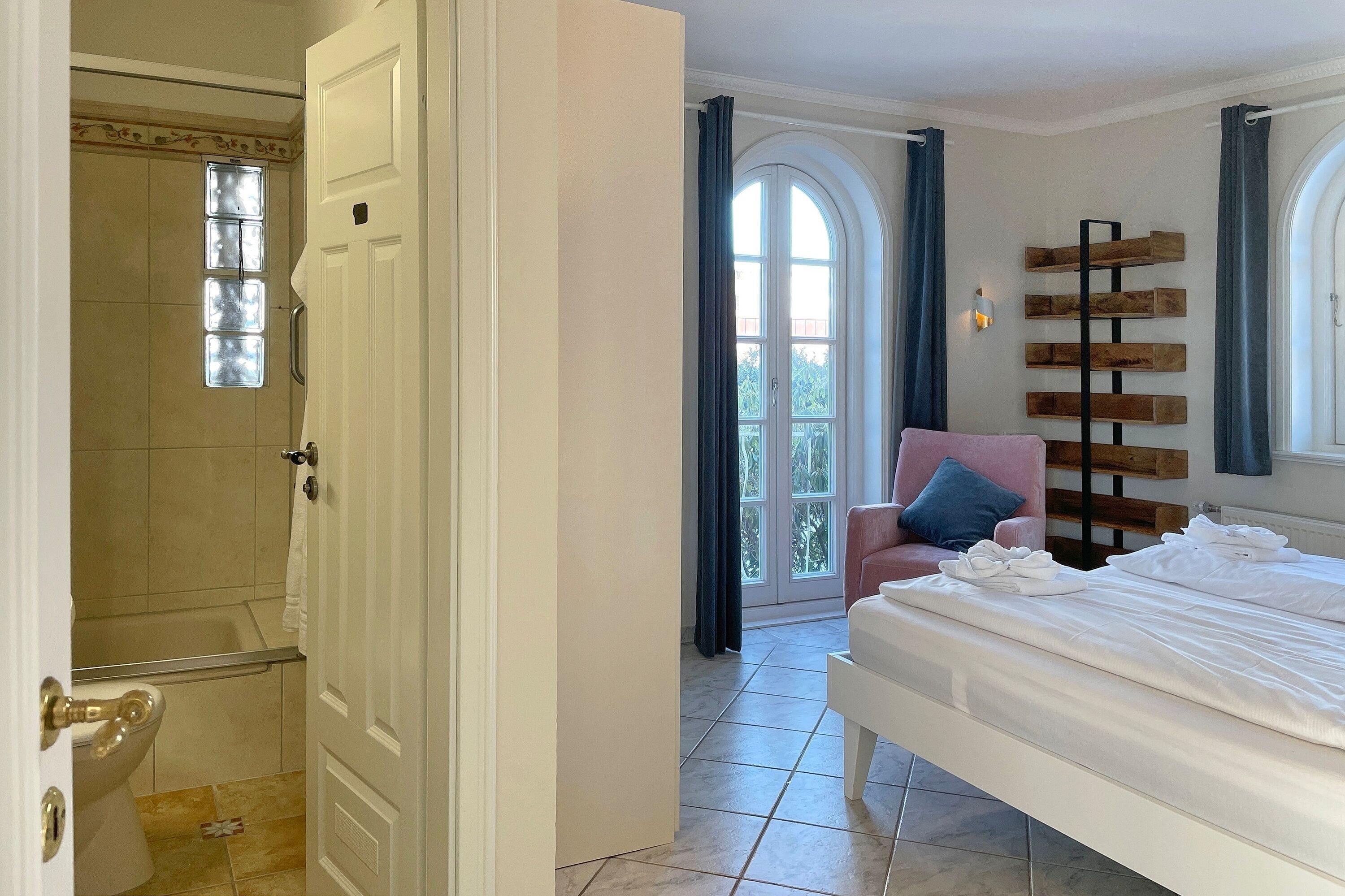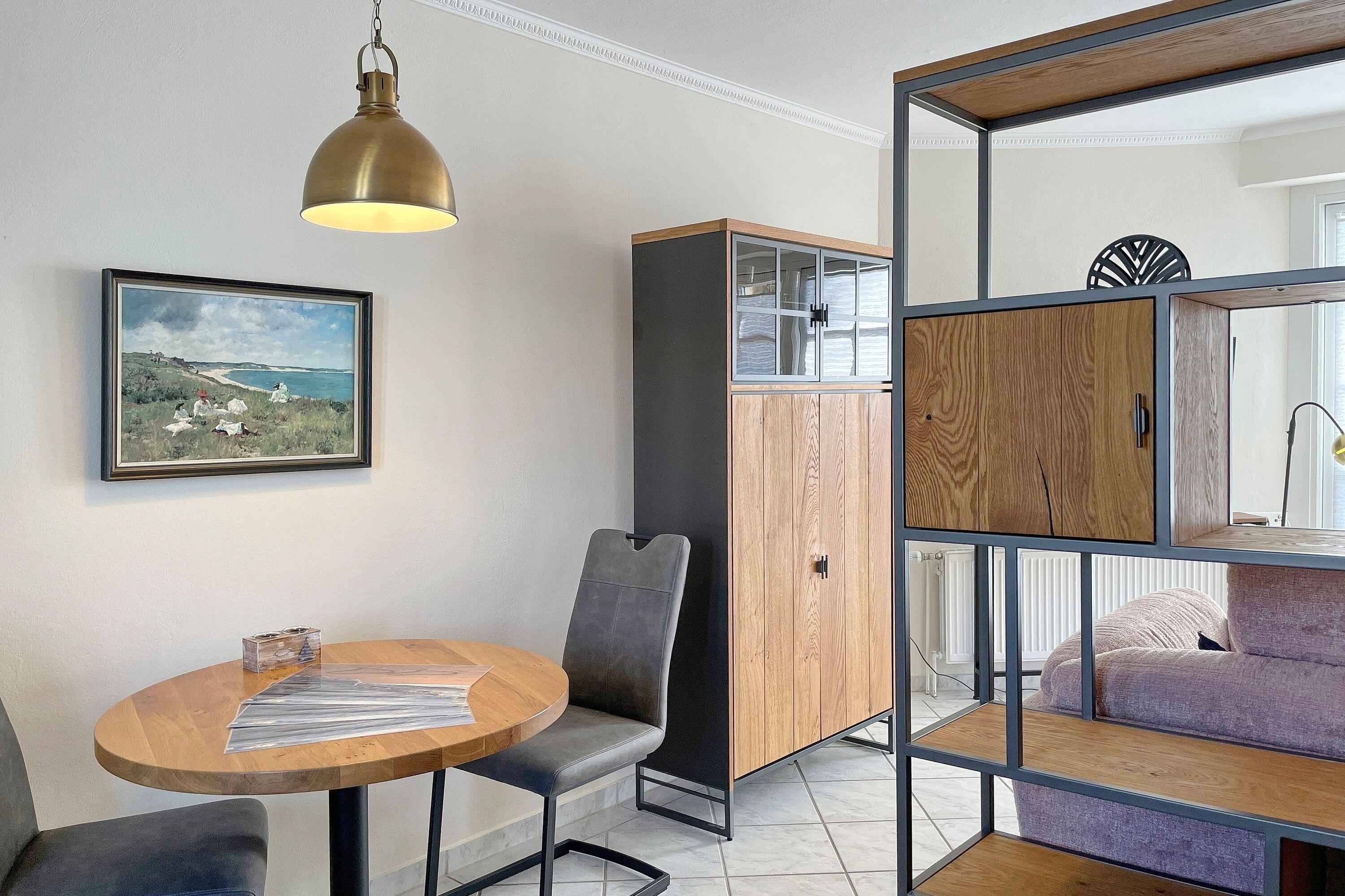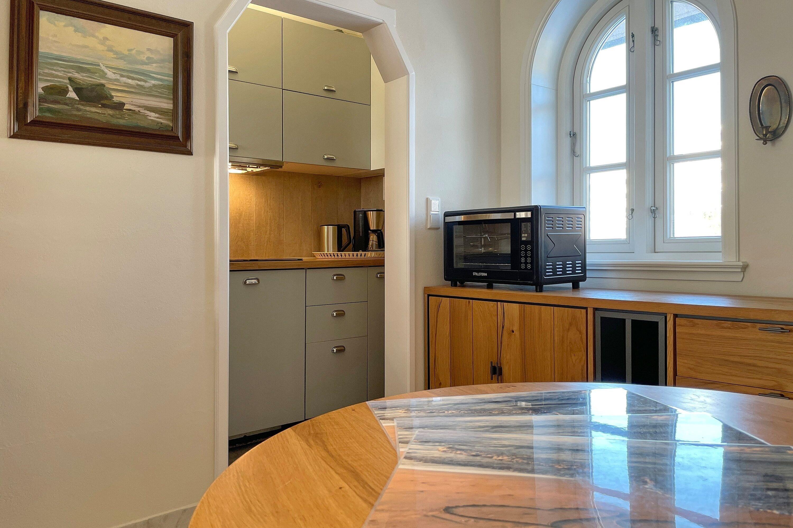 Von Ihrer privaten Terrasse mit Meerblick aus können Sie den Blick über das Wattenmeer schweifen lassen und ungestört das Wechselspiel der Gezeiten genießen. Im Wohnbereich erwarten Sie ein bequemes Sofa mit direktem Blick auf das Meer, eine Essecke für Zwei und eine kleine, gut ausgestattete Küchenzeile mit Kühl-Gefrierkombination, Spülmaschine, Backofengerät, 4-Platten-Kochfeld, Wasserkocher und Kaffeemaschine – perfekt für Selbstversorger. Das Schlafzimmer, das Sie durch eine Glastür vom Wohnraum aus erreichen, verfügt über ein gemütliches Doppelbett und einen geräumigen Kleiderschrank. Ein französischer Balkon verleiht dem Raum dabei einen romantischen Akzent. Das angrenzende Badezimmer mit Dusche (hoher Einstieg) und WC ist kompakt und funktional gestaltet.