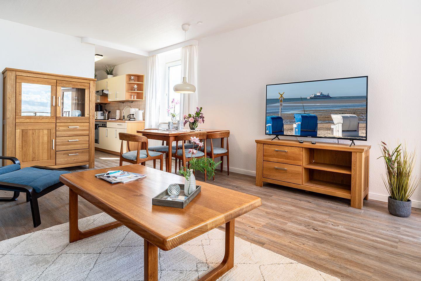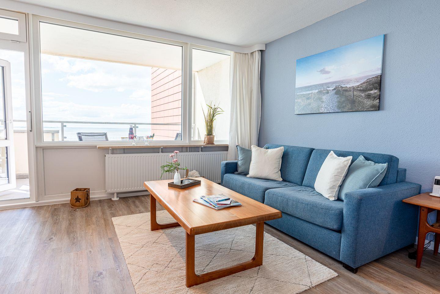 Die Wohnung 45 liegt im 6. OG, ist ca. 50 qm groß und für 2 bis 4 Personen eingerichtet. Sie besteht aus einem Wohnzimmer, einem Schlafzimmer, einer vom Wohnzimmer abgehenden Küchenzeile, einem Wannenbad mit WC sowie einem Flur. Der vom Wohnzimmer aus zugängliche, überdachte Balkon hat Südlage und bietet einen herrlichen Blick über die Nordsee, die Halligen und den Strand. Balkonmöbel sind vorhanden. Der gesamte Wohn- und Schlafbereich ist mit Parket ausgelegt und beinhaltet ein Schlafsofa als Schlafmöglichkeit für die dritte und vierte Person. Das Mobiliar ist überwiegend in Teakholz gehalten. Bei dieser Wohnung haben Sie Schwimmbadbenutzung im Hause.