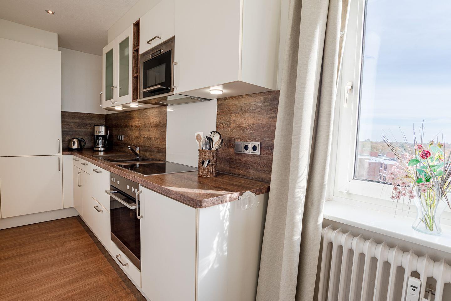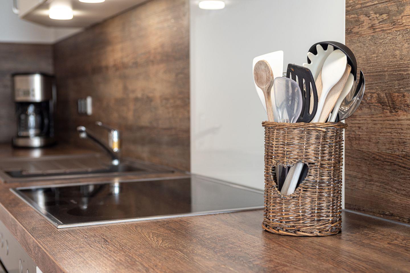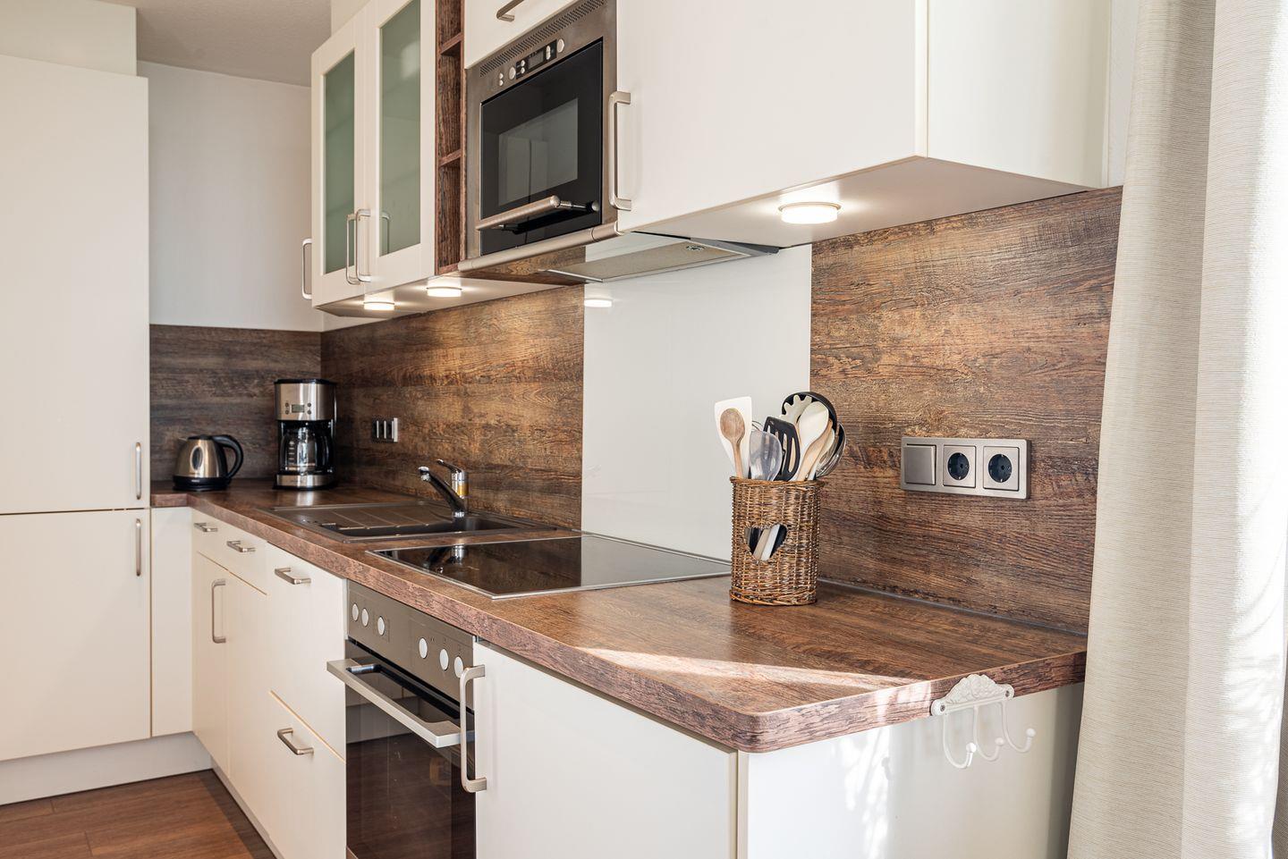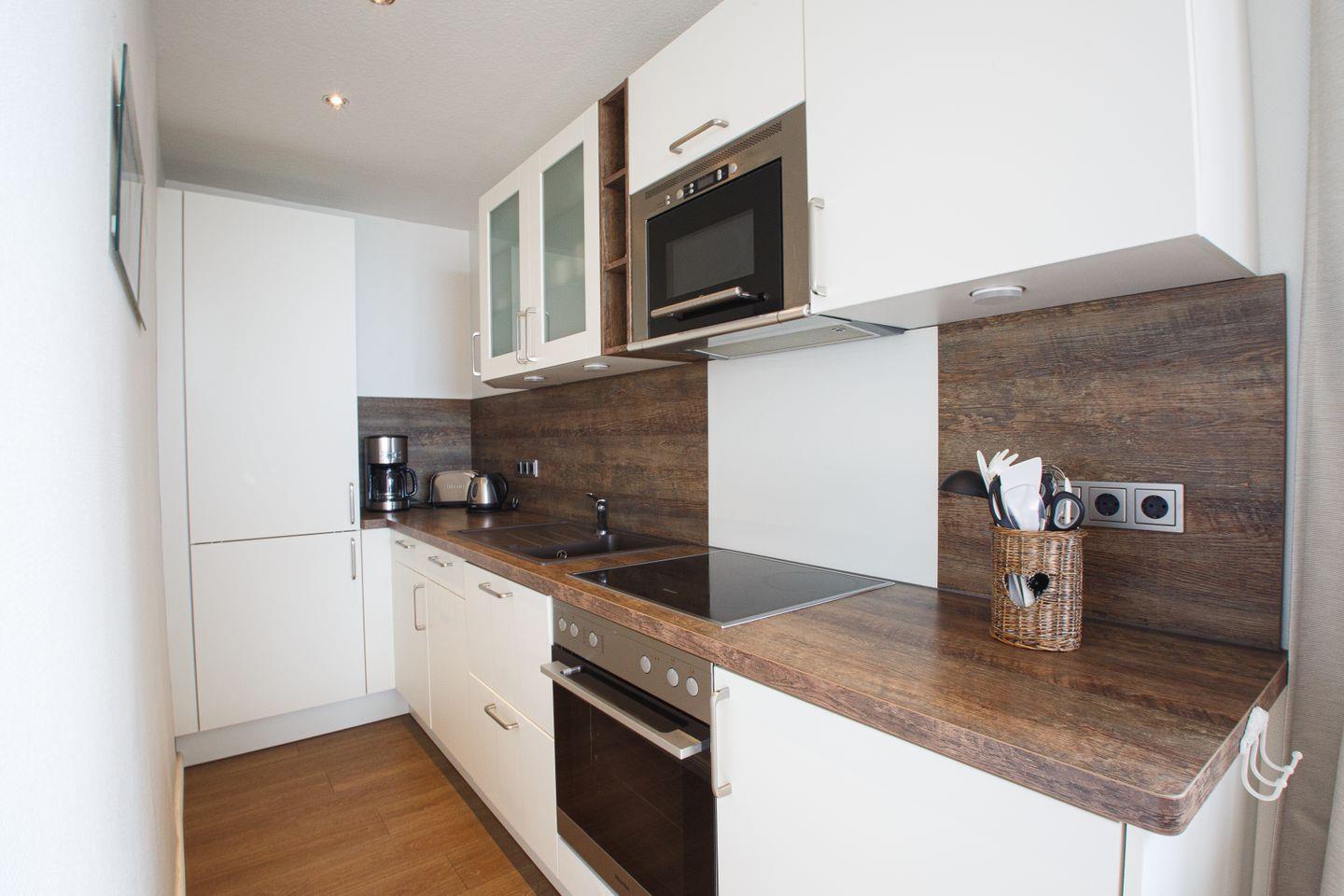 Die KÜCHENZEILE ist klein, aber fein. Zur technischen Ausstattung gehören Kühlschrank mit Gefrierfach, Herd, Kaffeemaschine, Wasserkocher, Toaster und einige weitere Kochutensilien.