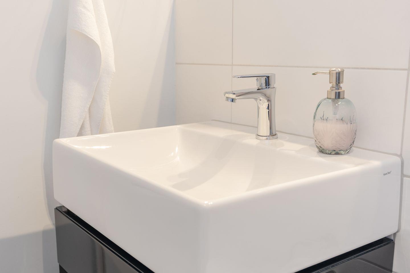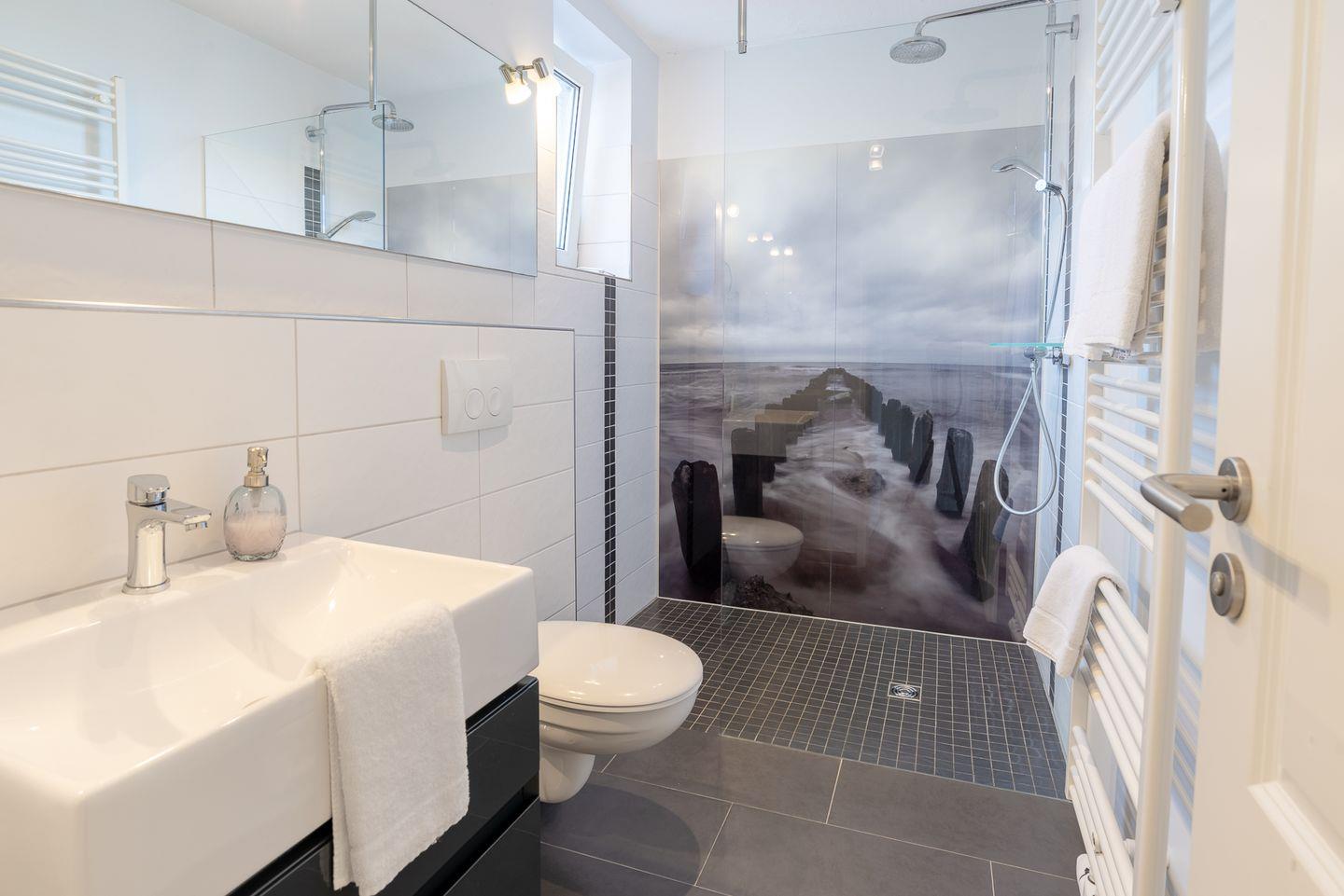 Das neuwertige, geflieste BADEZIMMER ist mit einer Dusche ausgestattet.