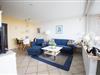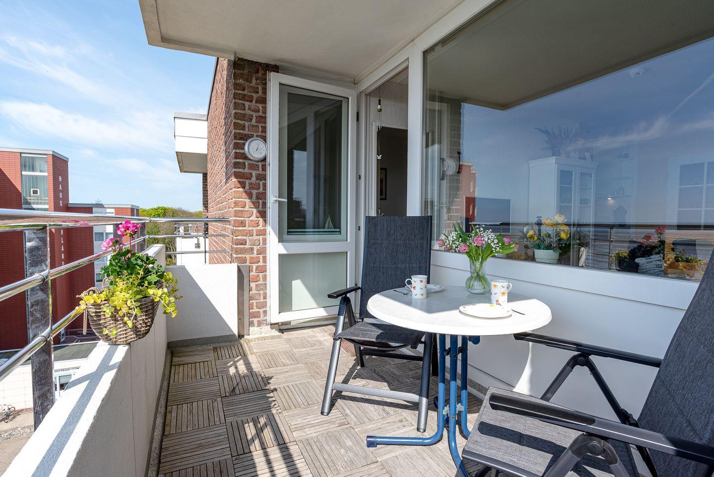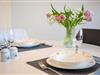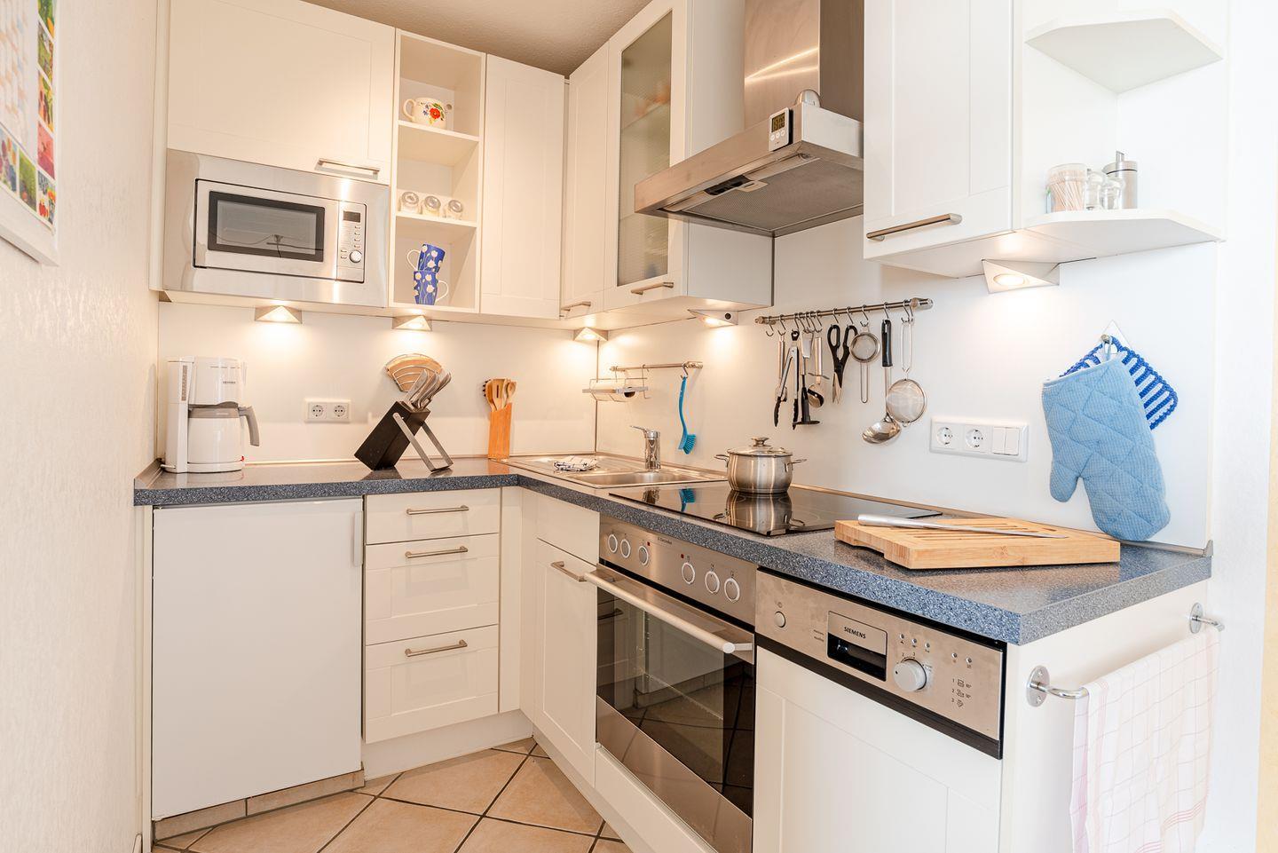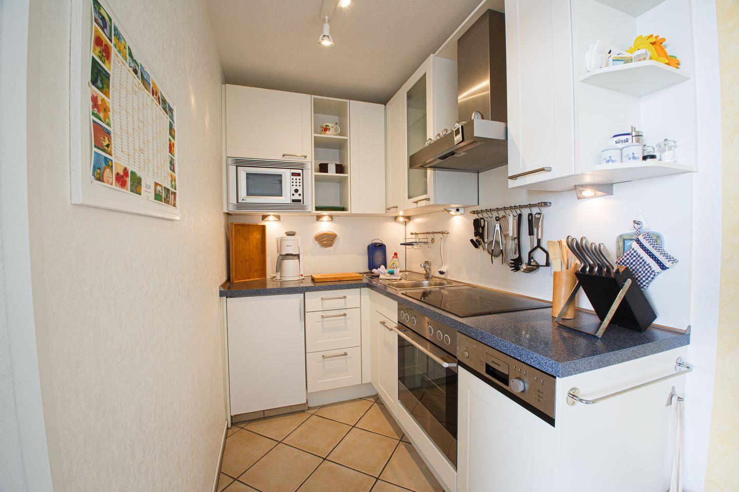 Die Wohnung befindet sich im 5.Stock. Sie ist geschmackvoll ausgestattet und liebevoll in blau-weiß Tönen möbliert. Der überdachte Balkon ist mit Teakholz ausgelegt, mit Stühlen, Tisch und Liegen ausgestattet. Er bietet einen grandiosen Blick übers Meer bis hinüber zu den Halligen. Der Wohnbereich, das Bad, die Küche und der Flur sind einheitlich gefliest, im Schlafzimmer finden Sie einen Korkfußboden. Der Schlafbereich besteht aus zwei Einzelbetten (für einige Gäste ein „no go“, für andere vielleicht erstrebenswert).