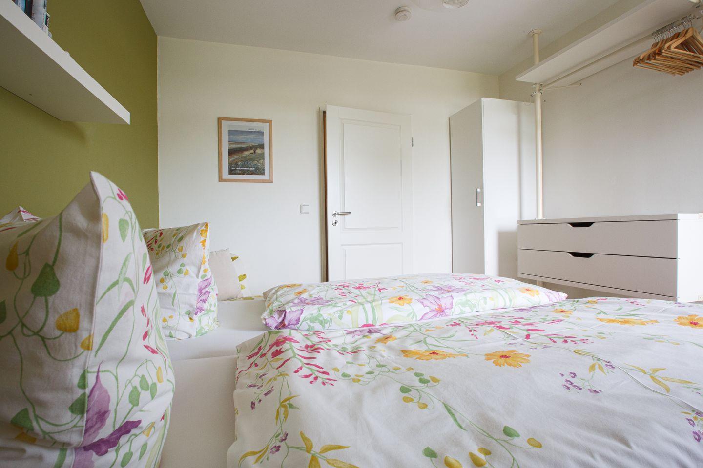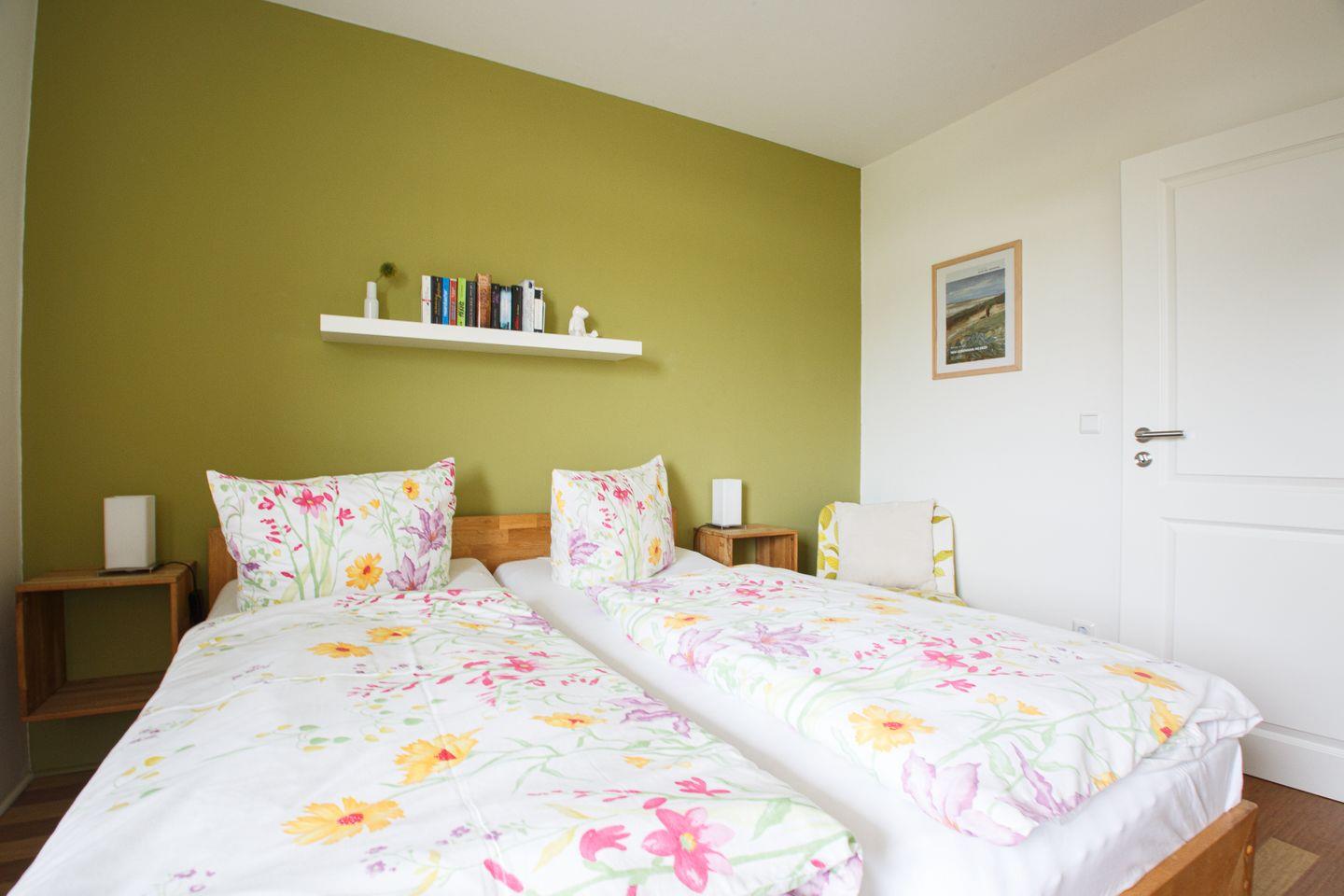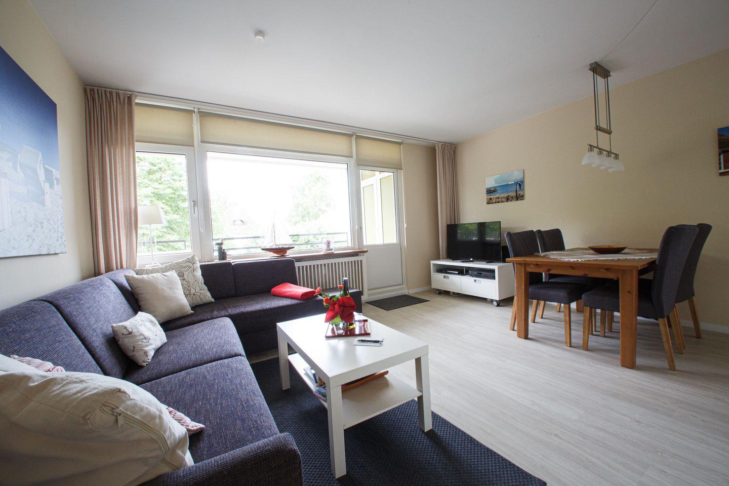 Die helle und modern eingerichtete Wohnung liegt im 1. Stock des Hauses Oland und bietet auf 50qm Platz für 2 bis 4 Personen. Sie verfügt über kostenfreies WLAN und ein Telefon mit Festnetz-Flat. Die Wohnung besteht aus einem großzügigen Wohnbereich mit Essecke und offener Küche, dem Schlafzimmer, Diele sowie Duschbad mit WC. Sie wurde komplett mit Laminat ausgelegt. Der große, überdachte und vom Wohnzimmer zugängliche Balkon in Süd-Westlage bietet seitlichen Blick auf die Nordsee und am Abend traumhafte Blicke auf unvergessliche Sonnenuntergänge. Vom kleinen Nordbalkon am Schlafzimmer hat man einen weiten Blick ins Grüne. Die Benutzung des Schwimmbads im Haus Uthlande ist im Mietpreis enthalten.
