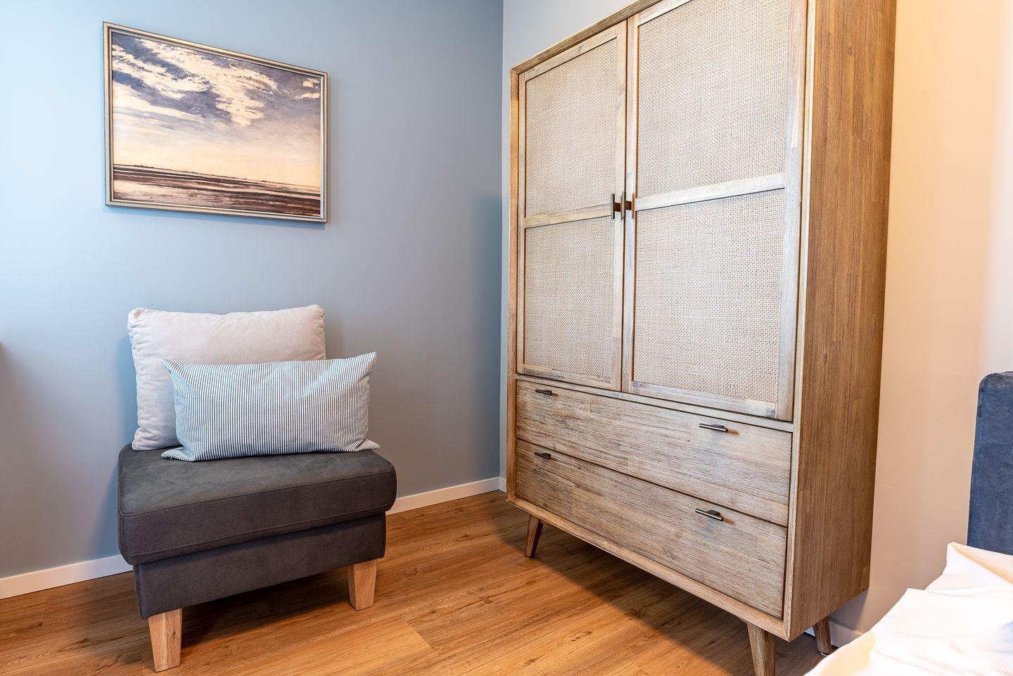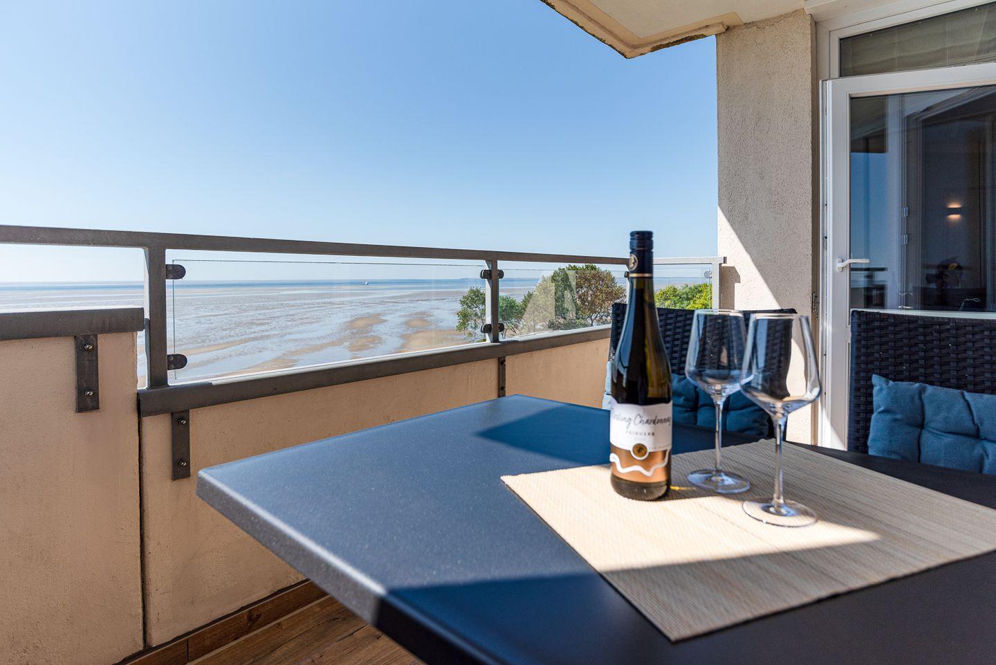 Das Haus Uthlande liegt am Südstrand und bietet eine wunderschöne Aussicht vom Balkon, die von Amrum im Westen bis zum Festland im Osten reicht. Die Ferienwohnung 46 Watten`n Blick befindet sich im VI. Obergeschoss und ist bequem mit dem Fahrstuhl erreichbar.