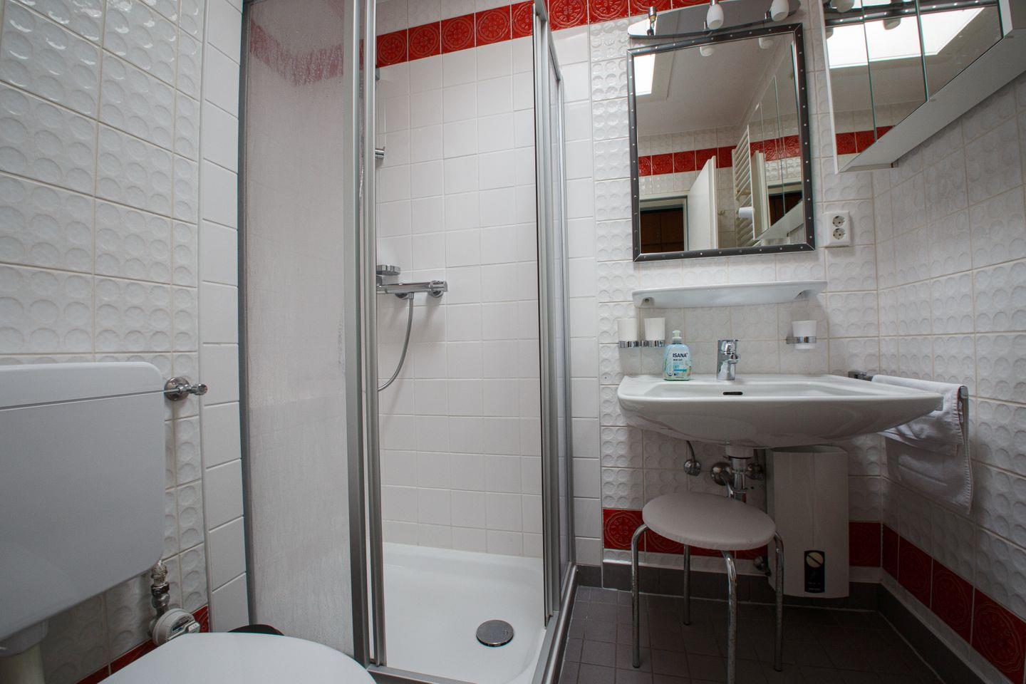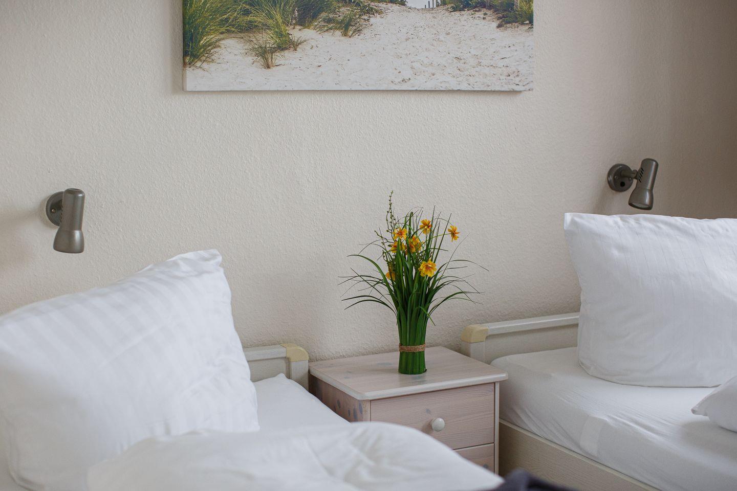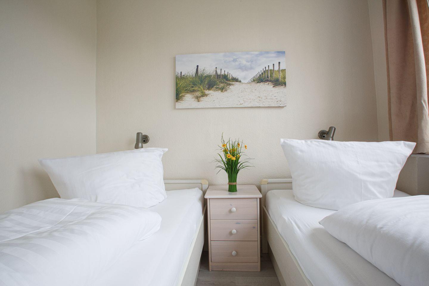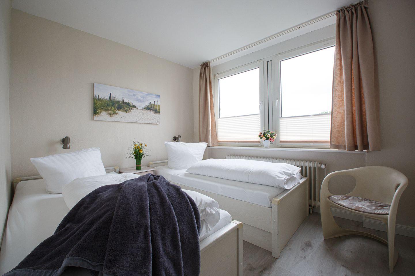 Das separate Schlafzimmer bietet eine ruhige Rückzugsmöglichkeit mit hochwertiger Bettwäsche und ist, wie die gesamte Wohnung, für Nichtraucher konzipiert. Auch Allergiker finden hier optimale Bedingungen. Ein Badezimmer mit Hand- und Badetüchern sowie Erstausstattung und Reinigungsmitteln sorgen für zusätzlichen Komfort. Ein Wäscheständer, Staubsauger und Garderobe sind vorhanden. Waschmaschine und Trockner können gemeinschaftlich genutzt werden.