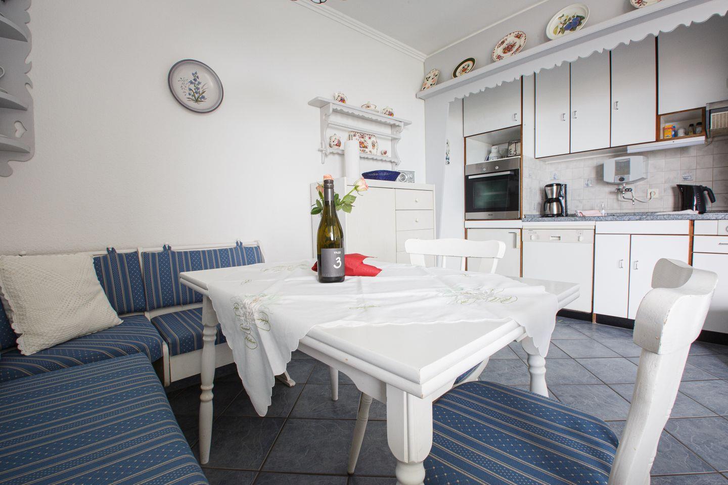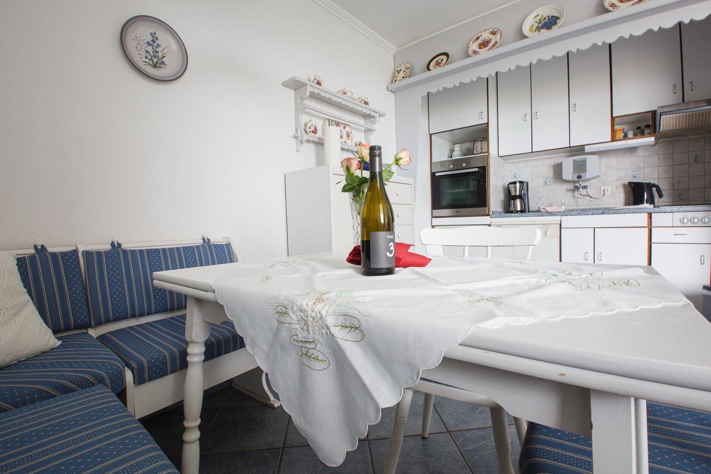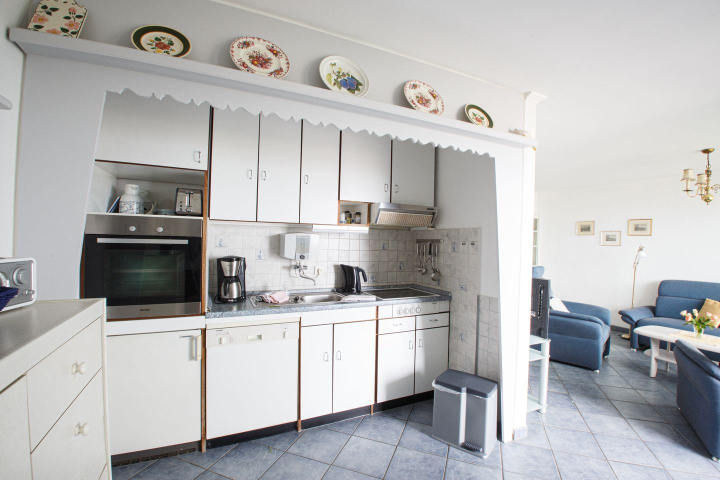 Im offenen, zum Wohnzimmer hin gestalteten Küchenbereich finden Sie eine moderne Ausstattung: Ein Cerankochfeld, Backofen mit Elektroanschluss, Kühlschrank mit Gefrierfach, Spülmaschine, Kaffeemaschine, Toaster, Wasserkocher sowie umfangreiche Küchenutensilien, Geschirr und Besteck sind ebenso vorhanden wie Geschirrhandtücher und Abfalleimer. Diese praktische Küchenkonzeption ermöglicht entspannte Mahlzeiten im eigenen Essbereich oder auf dem überdachten Balkon mit Meerblick.