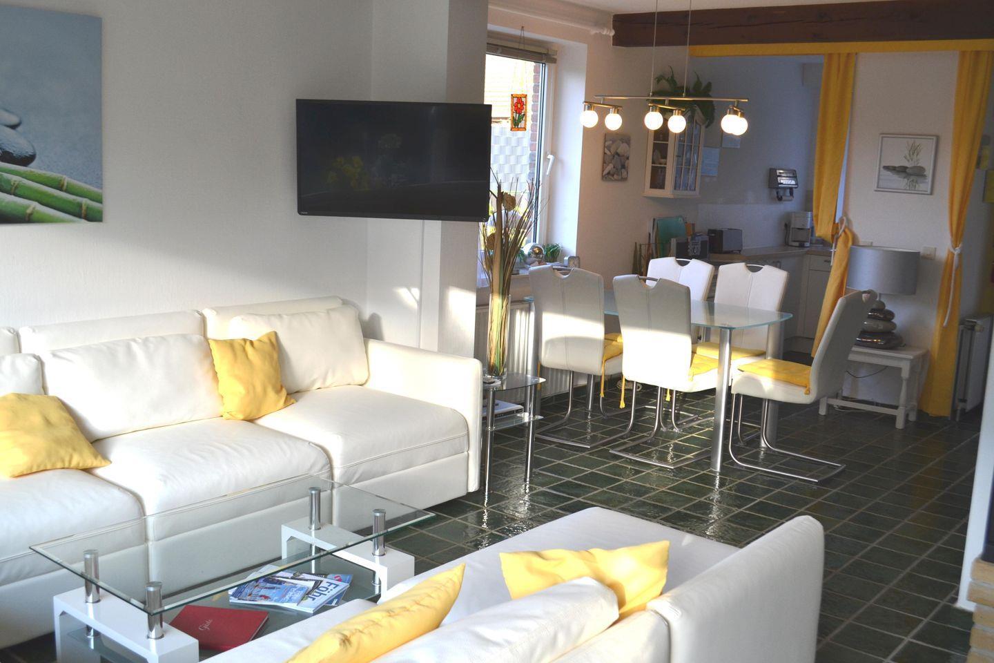 liegt das komplett neu eingerichtete Ferienhaus Harmonie über 2 Etagen mit ca. 85 m² Wohn-/Nutzfläche für 5 Personen. Von dort sind es ca. 400 m (5 Gehminuten) zum Strand. Einkaufsmöglichkeiten befinden sich im nahen Umfeld. Zur Innenstadt benötigt man ca. 15 Gehminuten.Im Erdgeschoss gibt es einen gemütlichen Wohn-/Essbereich mit offener Küchenzeile sowie ein Duschbad mit WC. Eine offene Treppe führt in die 1. Etage mit einem geräumigen Schlafzimmer mit Doppelbett und TV. Weiter in zwei zusätzliche Schlafzimmer. Betten 1,80 m lang. Ein Zimmer davon mit Etagenbett / umzufunktionierendem Doppelbett, das andere Zimmer verfügt über ein Einzelbett. Außerdem steht ein Gäste-WC auf dieser Etage zur Verfügung.