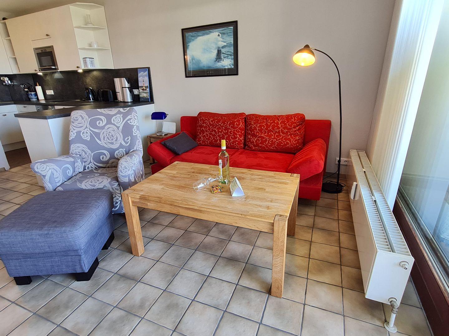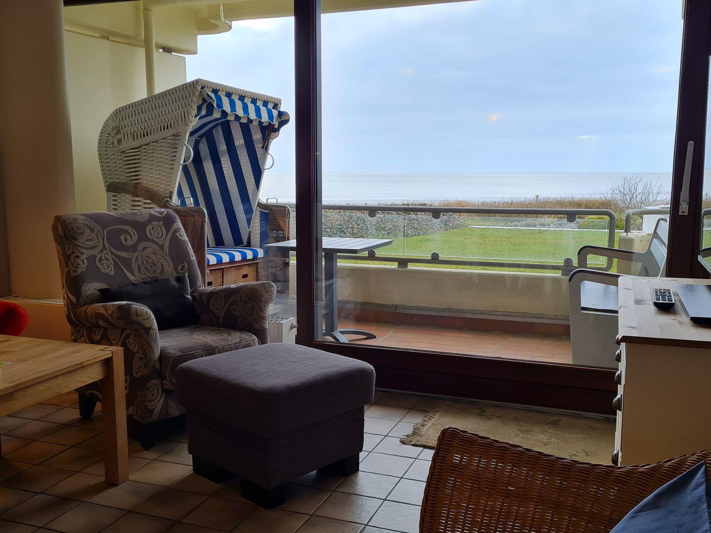 Aus dem Wohnzimmer mit einem Panorama-Fenster und vom Balkon aus haben Sie einen traumhaften Blick auf das Meer und die Halligen. Sie betreten durch die Schiebetür den mit einem Strandkorb und Terrassenmöbeln ausgestatteten Balkon (Süd-Lage). Hier können Sie ein Sonnenbad nehmen, die gute Nordseeluft genießen und entspannen.