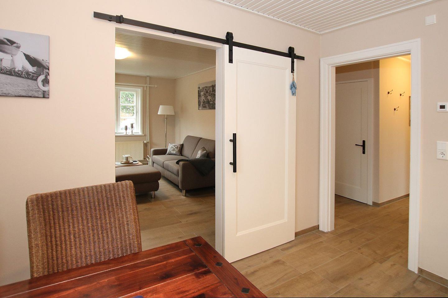 - Wohnzimmer mit Couch und Hocker Zugang zur Südterrasse