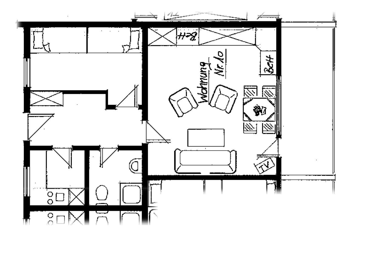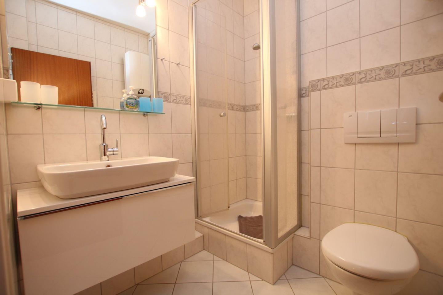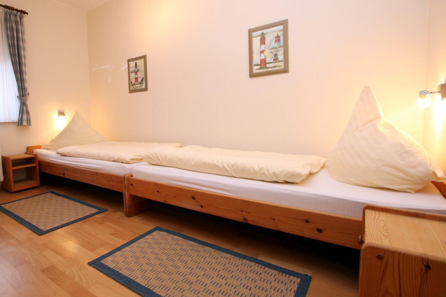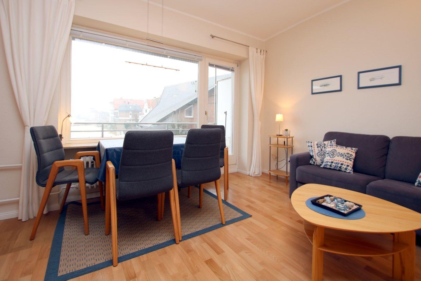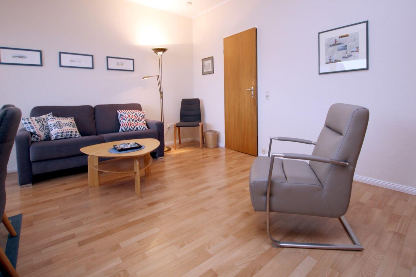 WOHNZIMMER: 1 Sessel, Sofa, Esstisch mit 4 Stühlen, SAT-TV und 2 Schrankbetten. SCHLAFZIMMER: 2 Einzelbetten und eingebaute Schränke. BAD: Dusche/WC. Das Haus verfügt über einen Fahrstuhl. Ein Parkplatz steht nur zur Verfügung, wenn ein Platz frei ist, es gibt fürs Haus 6 Parkplätze. Die Wohnung liegt zentral in der Fußgängerzone und hat einen sagenhaften Blick aufs Wasser und auf den Strand. Zum Wellenbad sind es ca. 10 bis 15 Minuten Fußweg.