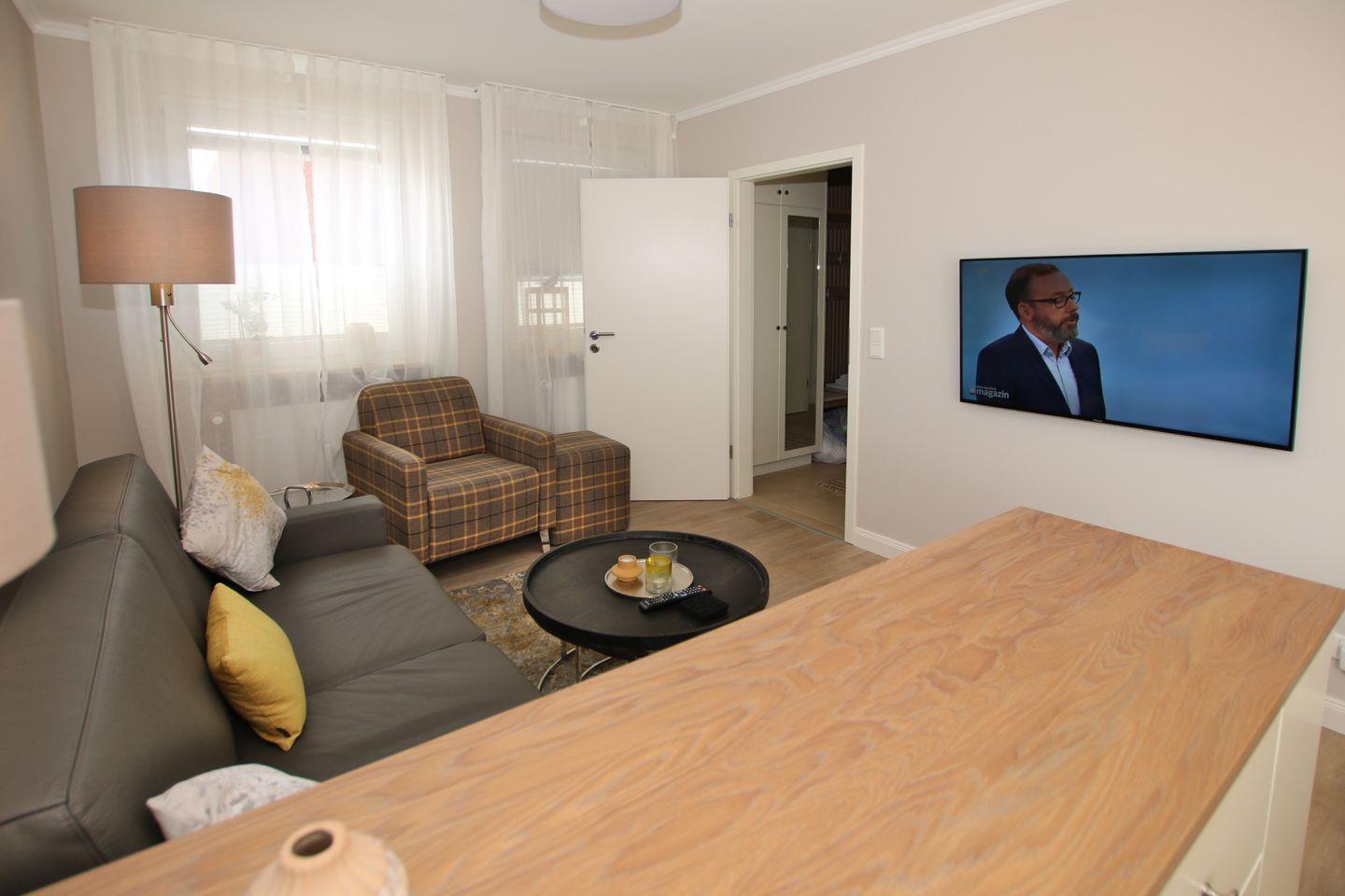 - Wohnzimmer mit Couch, 1 Sessel, Esstisch mit 4 Stühlen und große Küchenzeile