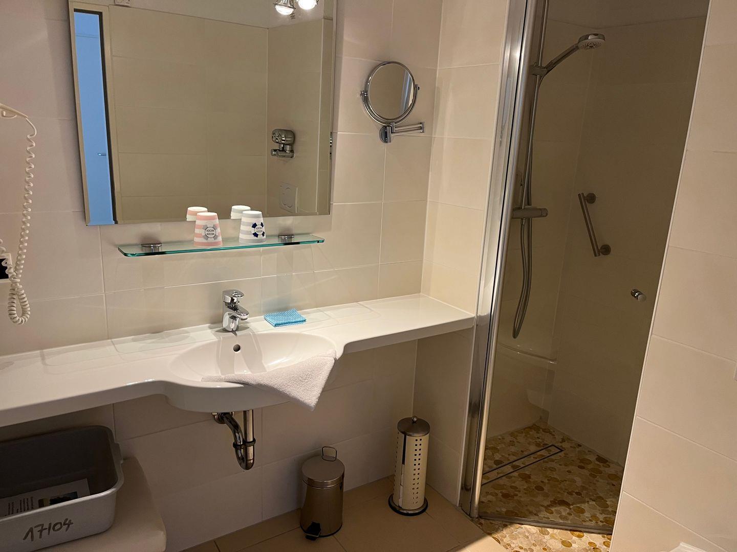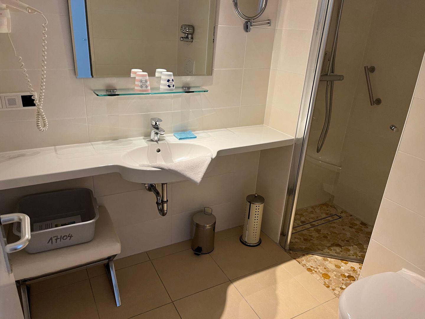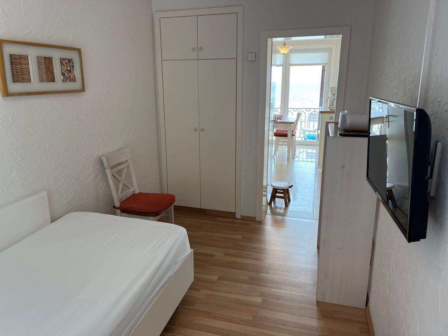 Vom Wohnungsflur aus gelangen Sie ins das große Schlafzimmer mit Doppelbett (180x200), das moderne Duschbad und das lichtdurchflutete Wohnzimmer mit Meerblick. Die separate Küche ist gut ausgestattet und bietet Ihnen einen Sitzplatz mit Meerblick. Von hier aus haben Sie Zugang zum Balkon und zum 2. Schlafzimmer zwei einzeln Betten (90x200). In der neuen Küche finden Sie u.a. eine Mikrowelle, eine Spülmaschine und ein Cerankochfeld vor. Das Duschbad ist neu und hat eine große, begehbare Dusche. Zur Ausstattung gehören: großflächige Fliesen und eine moderne Duschkabine.