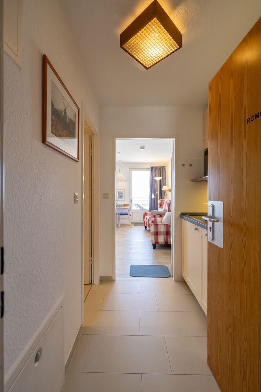 Die Wohnung selbst ist über wenige Treppenstufen erreichbar und liegt im 1. Obergeschoss. Besonders hervorzuheben ist der direkte Blick auf das Meer Richtung Osten. Hier lassen sich die eigenen Kinder beim Spielen beobachten.