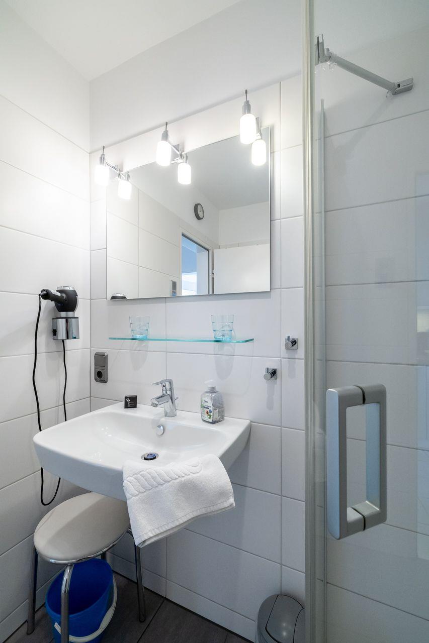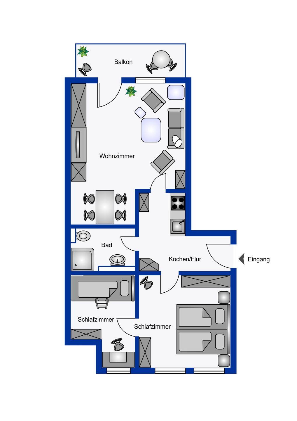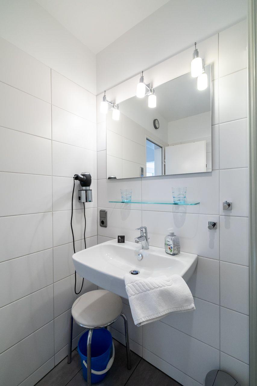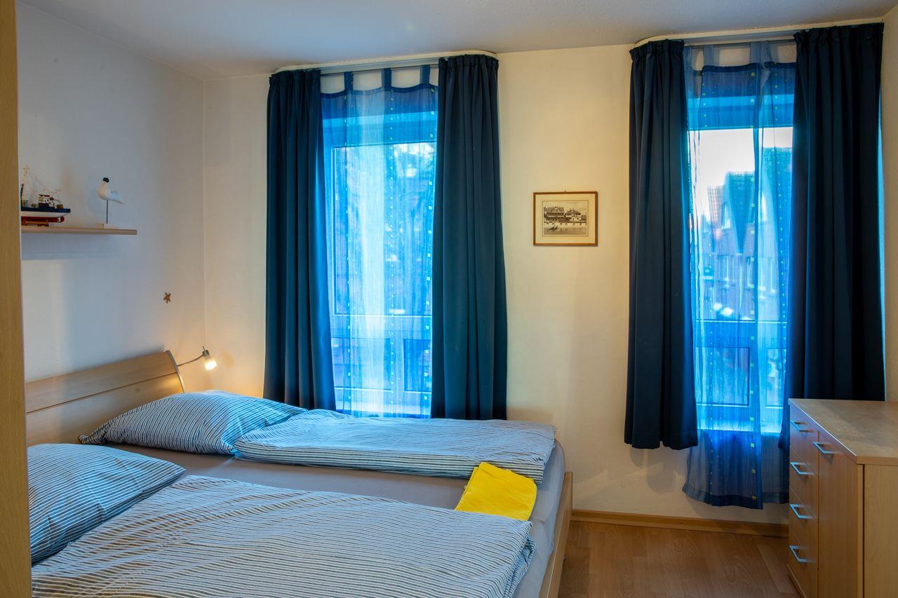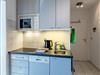 Vom Wohnungsflur zweigen ab: die praktische Küchenzeile, das großzügige Wohnzimmer und ein Schlafraum mit einem Doppelbett. Das zweite Schlafzimmer (Etagenbett zwei Mal 90*200 cm) geht vom Hauptschlafzimmer ab. Ebenso hat diese Wohnung tief herunter gezogene Fenster. Die Küchenzeile ist gut ausgestattet. Vorhanden sind: eine Mikrowelle, eine Spülmaschine und ein Cerankochfeld. Das Duschbad ist in einem neuen Zustand. Zur Ausstattung gehören: großflächige Fliesen und eine moderne Duschkabine.