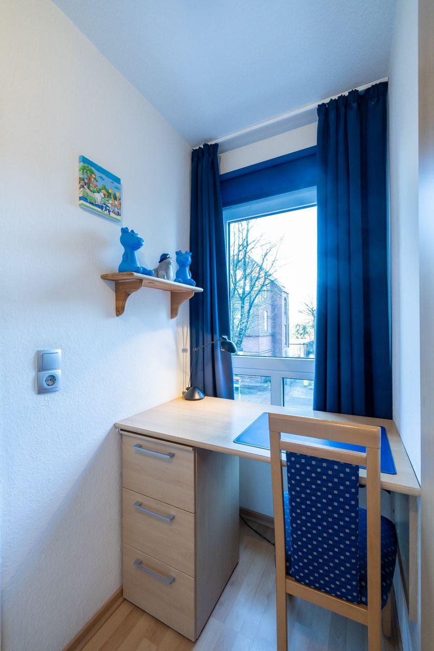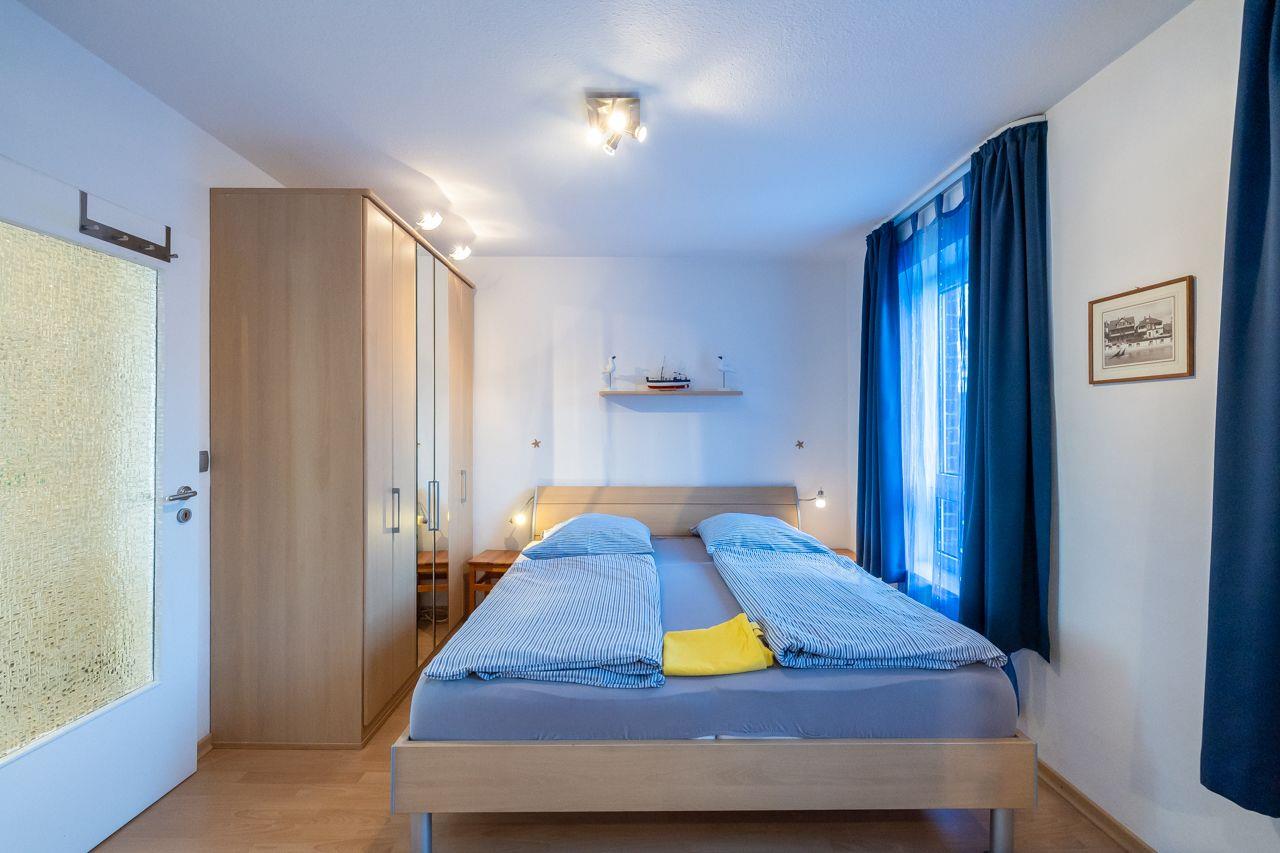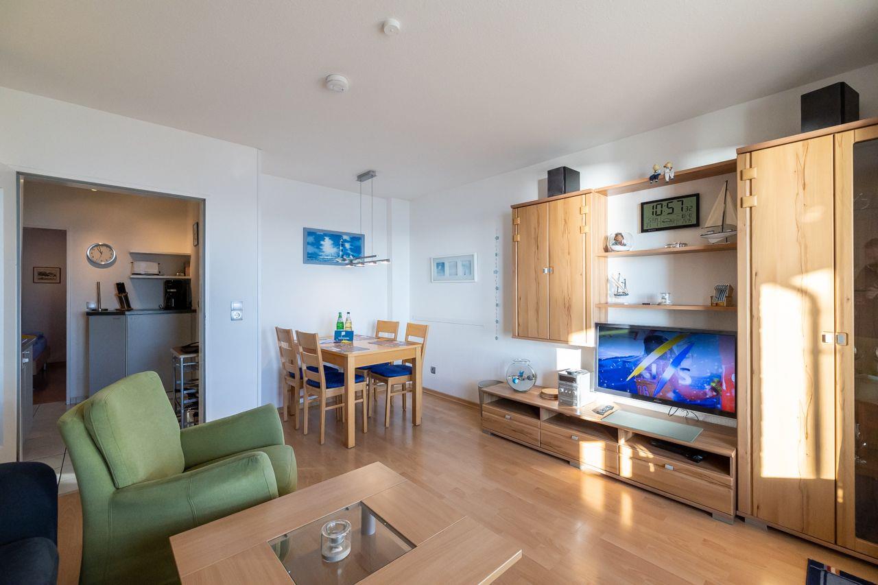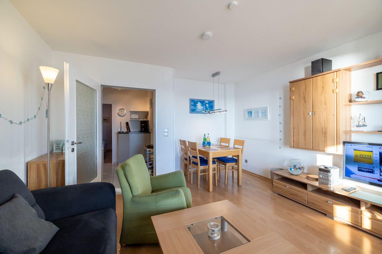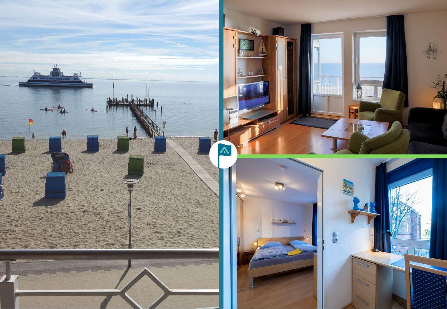 Die Wohnung selbst ist über wenige Treppenstufen erreichbar und liegt im 1. Obergeschoss. Besonders hervorzuheben ist der direkte Blick vom Wohnzimmer und Balkon auf das Meer Richtung Osten. Hier lassen sich die eigenen Kinder beim Spielen beobachten. Der Balkon ist überdacht, so dass Sie auch bei Regen draußen sitzen und den Meerblick genießen können.