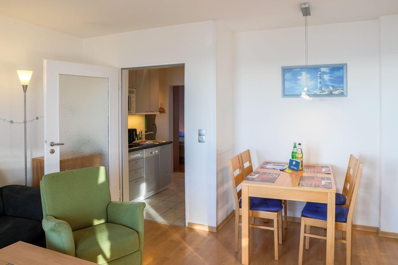 Die Wohnung Amrum ist über wenige Treppenstufen erreichbar und besticht durch ihren direkten Blick vom Wohnzimmer und dem überdachten Balkon auf das Meer in östliche Richtung. Der Balkon ermöglicht es Ihnen, auch bei Regen draußen zu sitzen und den faszinierenden Meerblick zu genießen, während Sie Ihre Kinder beim Spielen beobachten können.