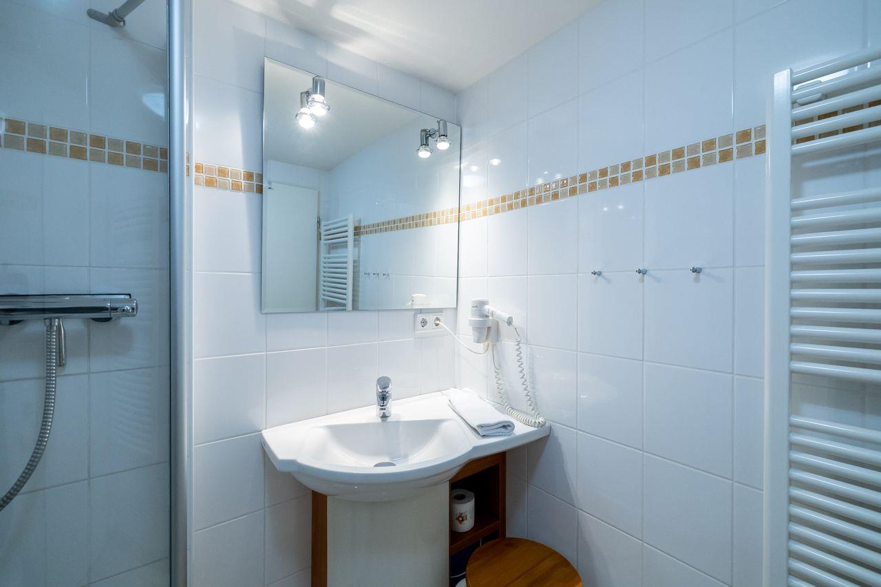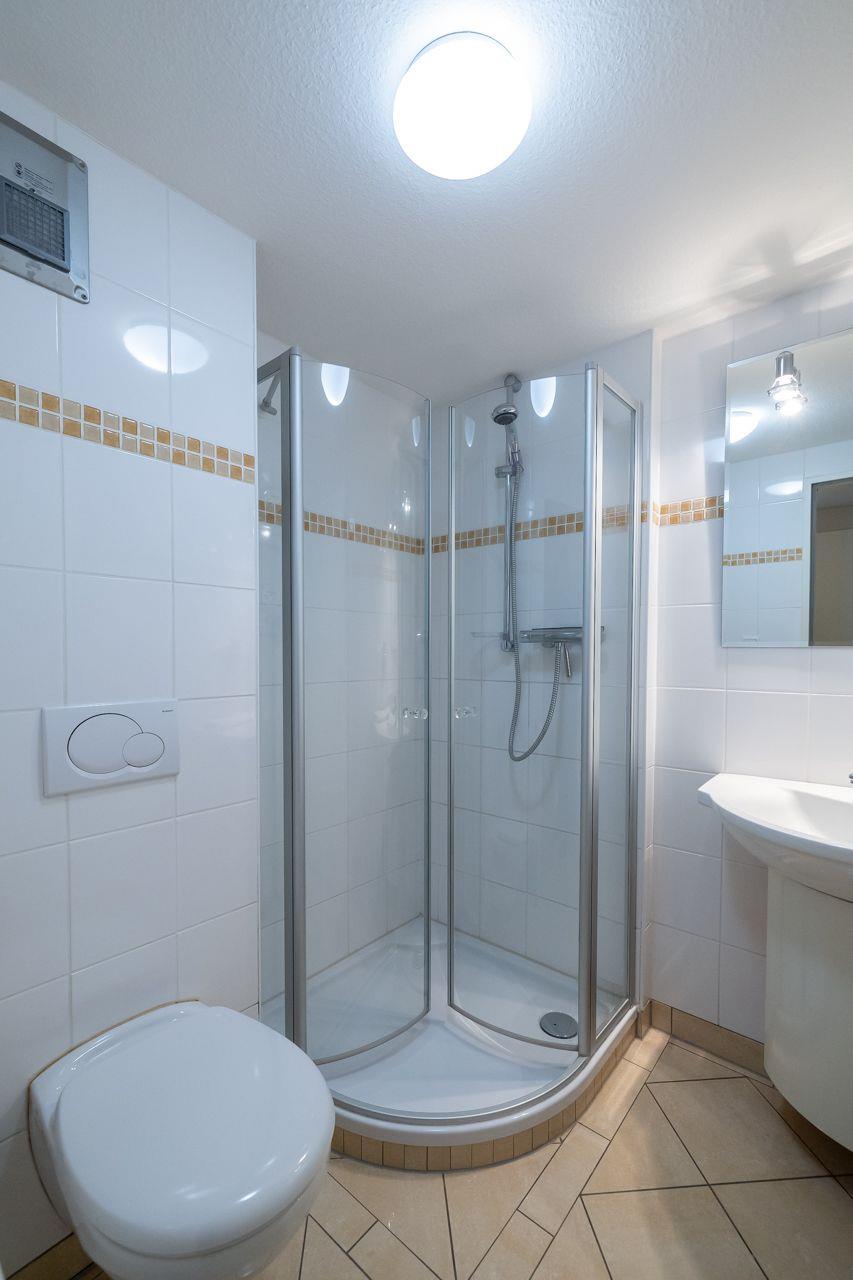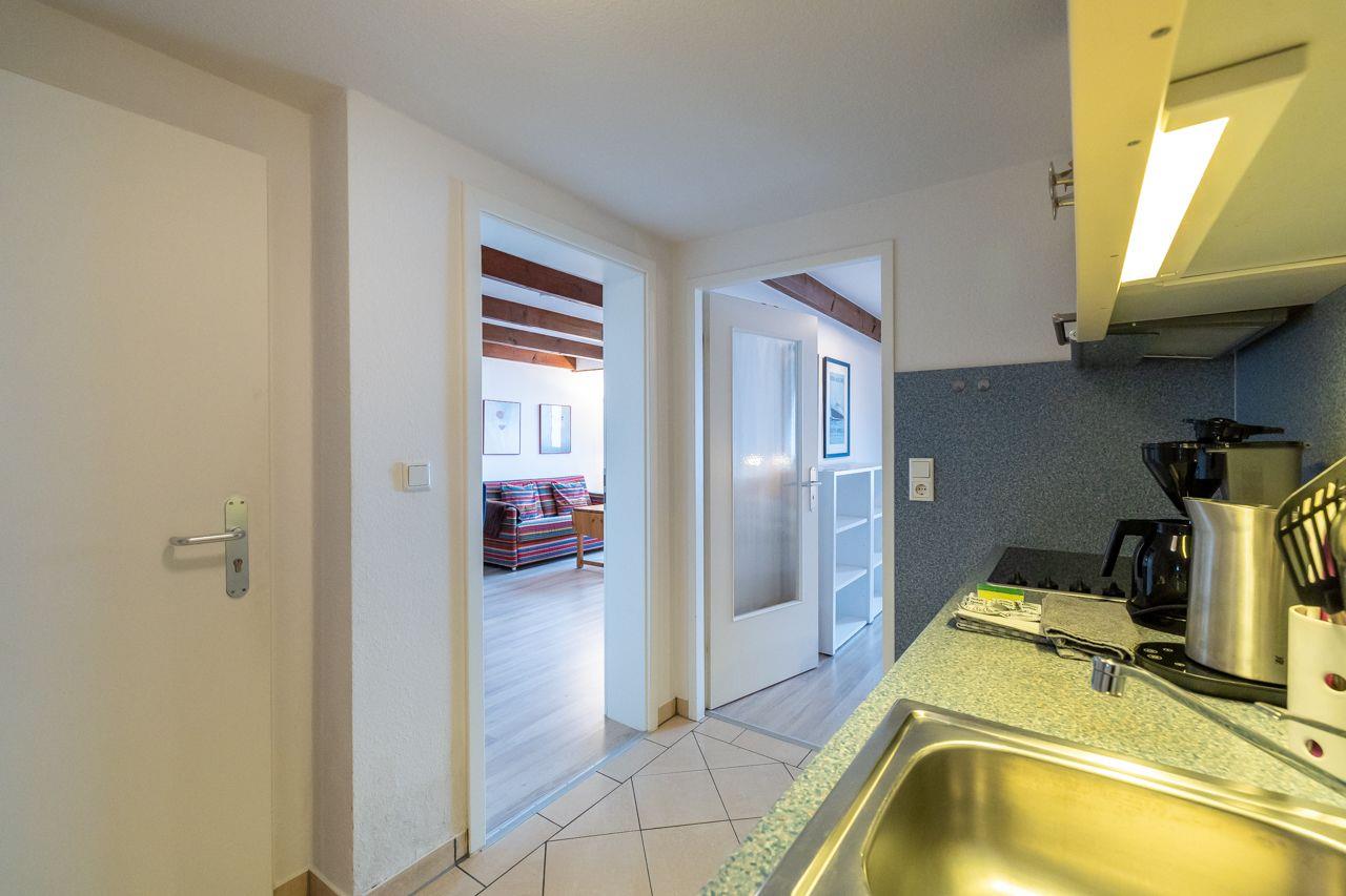 Vom Wohnungsflur aus gelangen Sie ins das große Schlafzimmer mit Doppelbett (180x200) und Meerblick, das moderne Duschbad und das lichtdurchflutete Wohnzimmer mit Meerblick und Balkon. Die Küchenzeile ist gut ausgestattet und bietet auch im Urlaub, Gelegenheit gut zu kochen. Das Duschbad ist neu und mit hellen, modernen Fliesen ausgestattet.