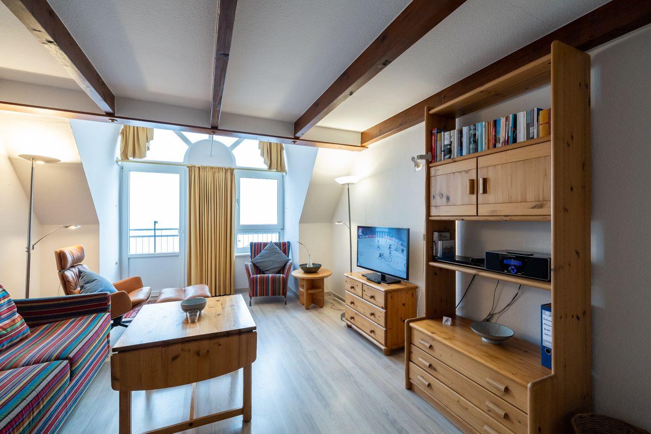Die Wohnung selbst liegt im 3. Obergeschoss und ist per Fahrstuhl plus Treppe erreichbar. Besonders hervorzuheben ist der direkte Blick auf das Meer Richtung Osten. Hier lassen sich die Geschehnisse am Strand bestens beobachten.