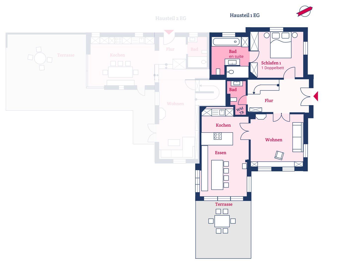 Den Gästen vom Hausteil Bi-de-Wyk steht neben der Terrasse auch ein eigener, umzäunter sowie eingewachsener Gartenabschnitt mit sehr großzügigen 700 m² zur Verfügung, der durch eine Hecke von dem Gartenabschnitt des Nachbarhausteils abgetrennt ist. Zwei eigene PKW-Stellplätze für das Hausteil runden das Angebot ab.