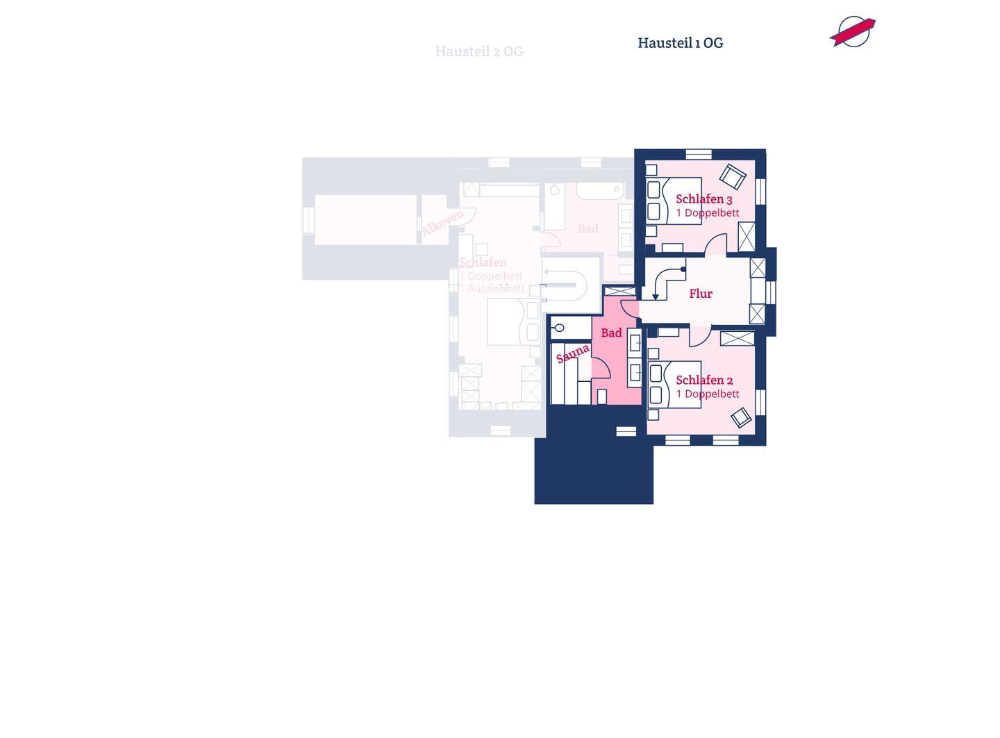 Im Obergeschoss sind zwei weitere Schlafzimmer - jeweils mit einem Doppelbett ausgestattet - sowie das Duschbad mit der eigenen Sauna gelegen.
