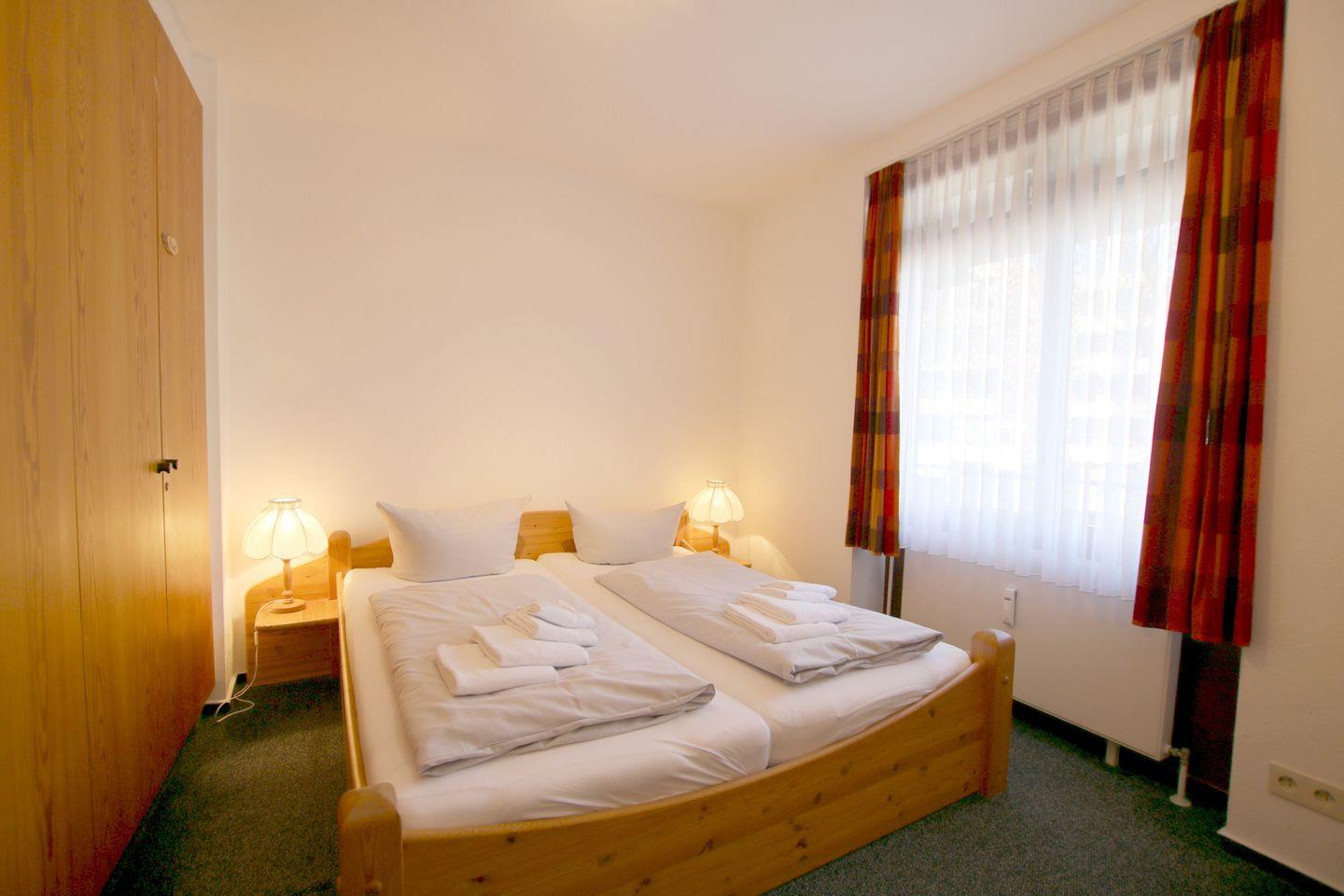 - Schafzimmer mit Doppelbett (180 x 200 cm) und Kleiderschrank und Stuhl