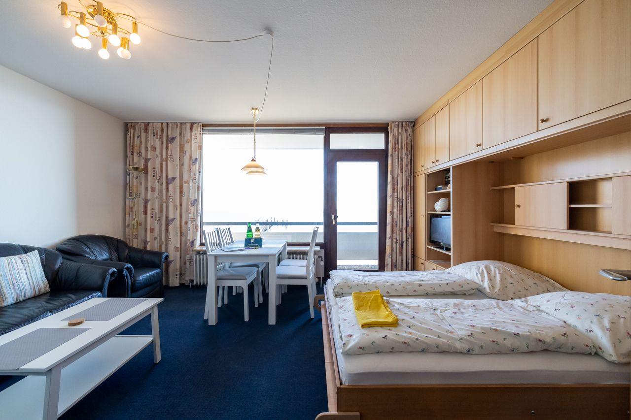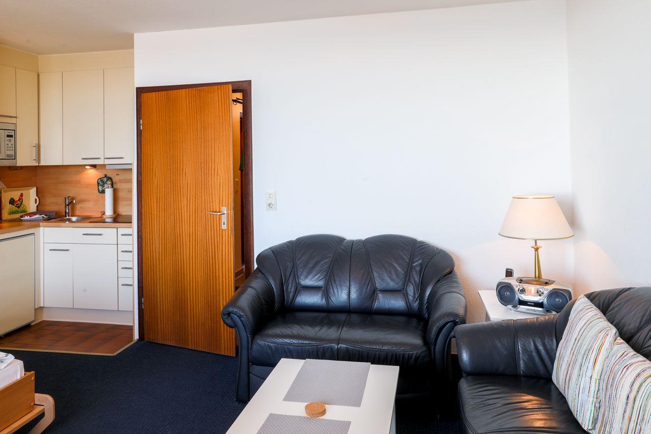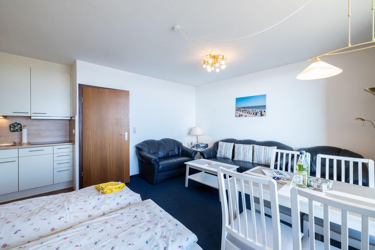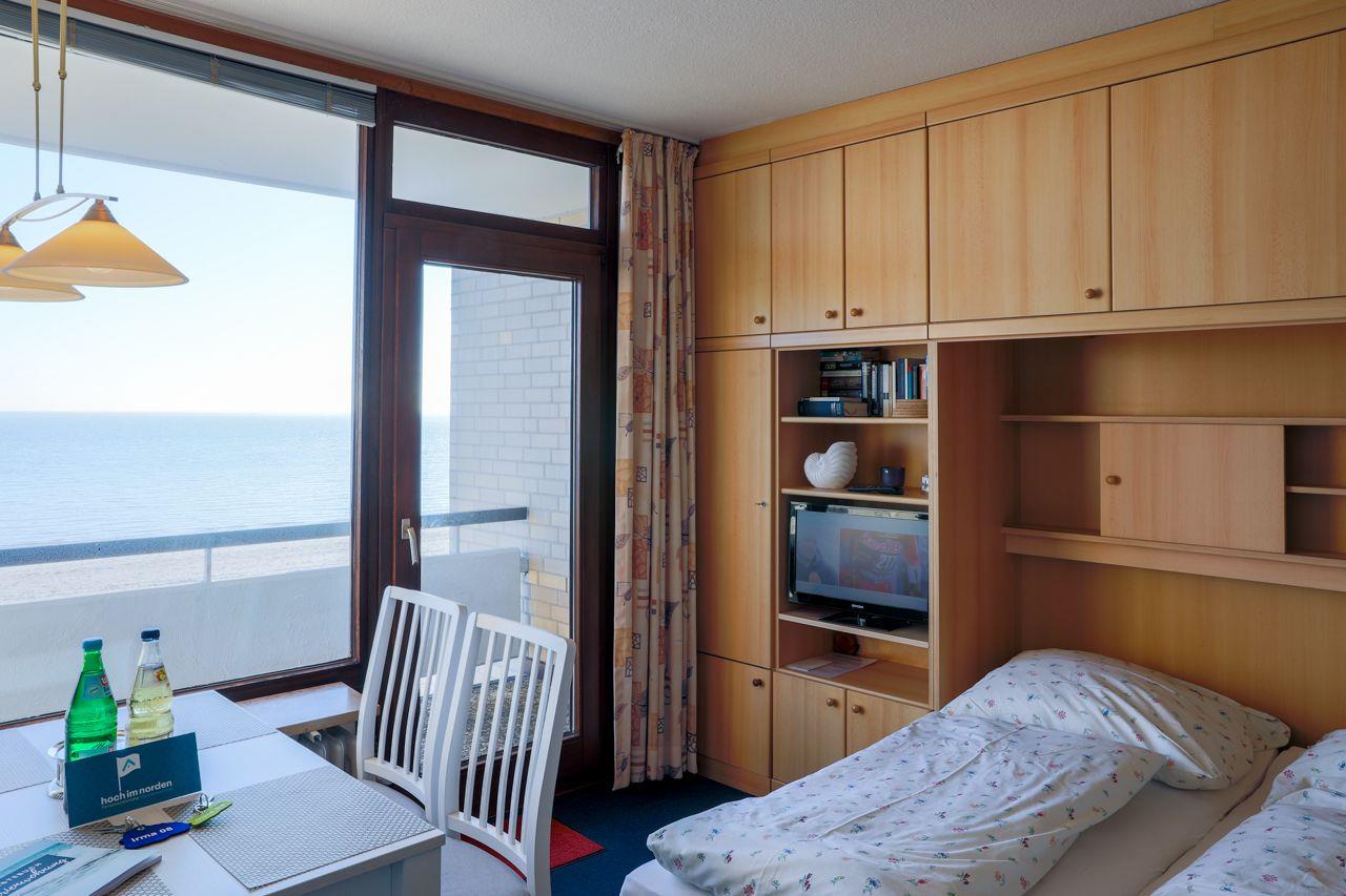 Das Appartement bietet einen kombinierten Wohn-Ess-Küchenbereich, der modern und einladend gestaltet ist. Hier können Sie entspannen, speisen und den Ausblick auf das Meer gleichermaßen genießen. Das Schlafzimmer verfügt über zwei Einzelbetten und bietet eine gemütliche Rückzugsmöglichkeit. Das moderne Duschbad mit Fenster sorgt für Frische und Komfort.