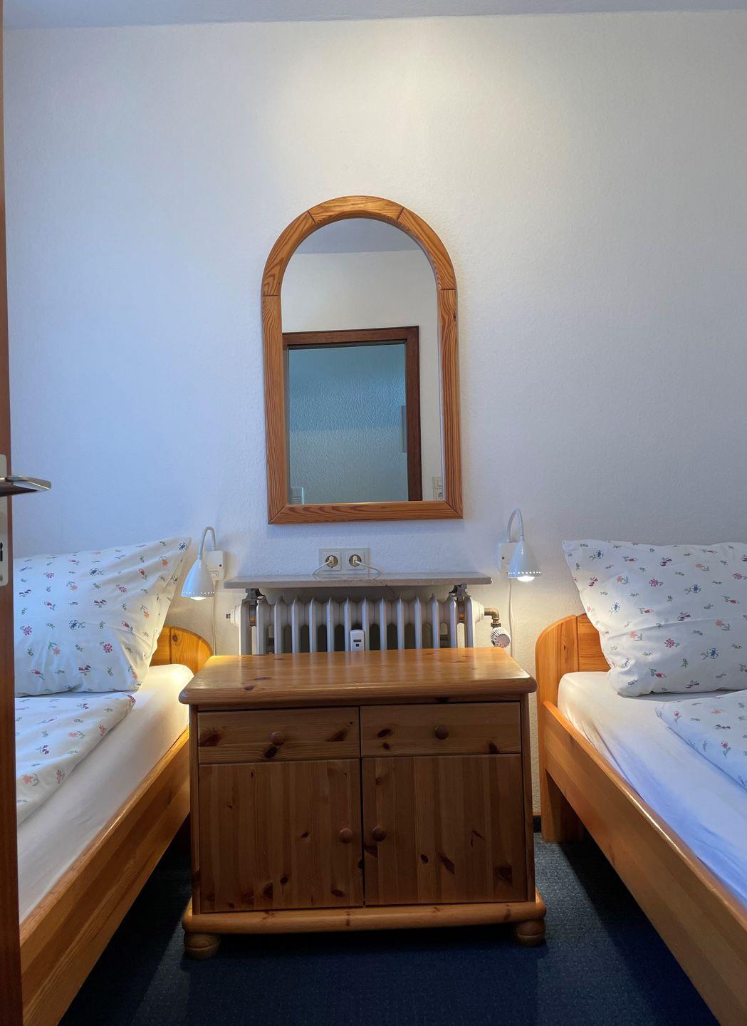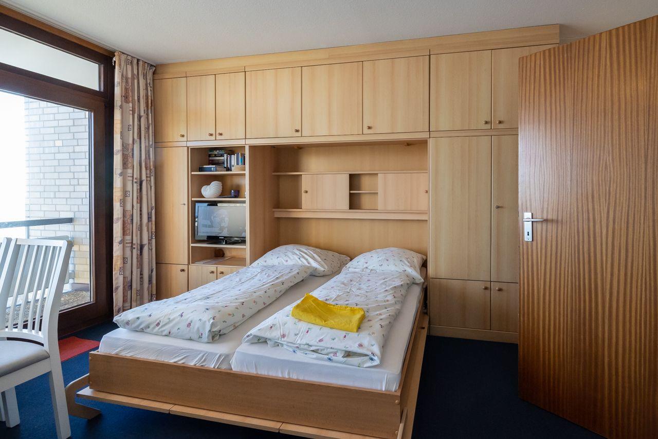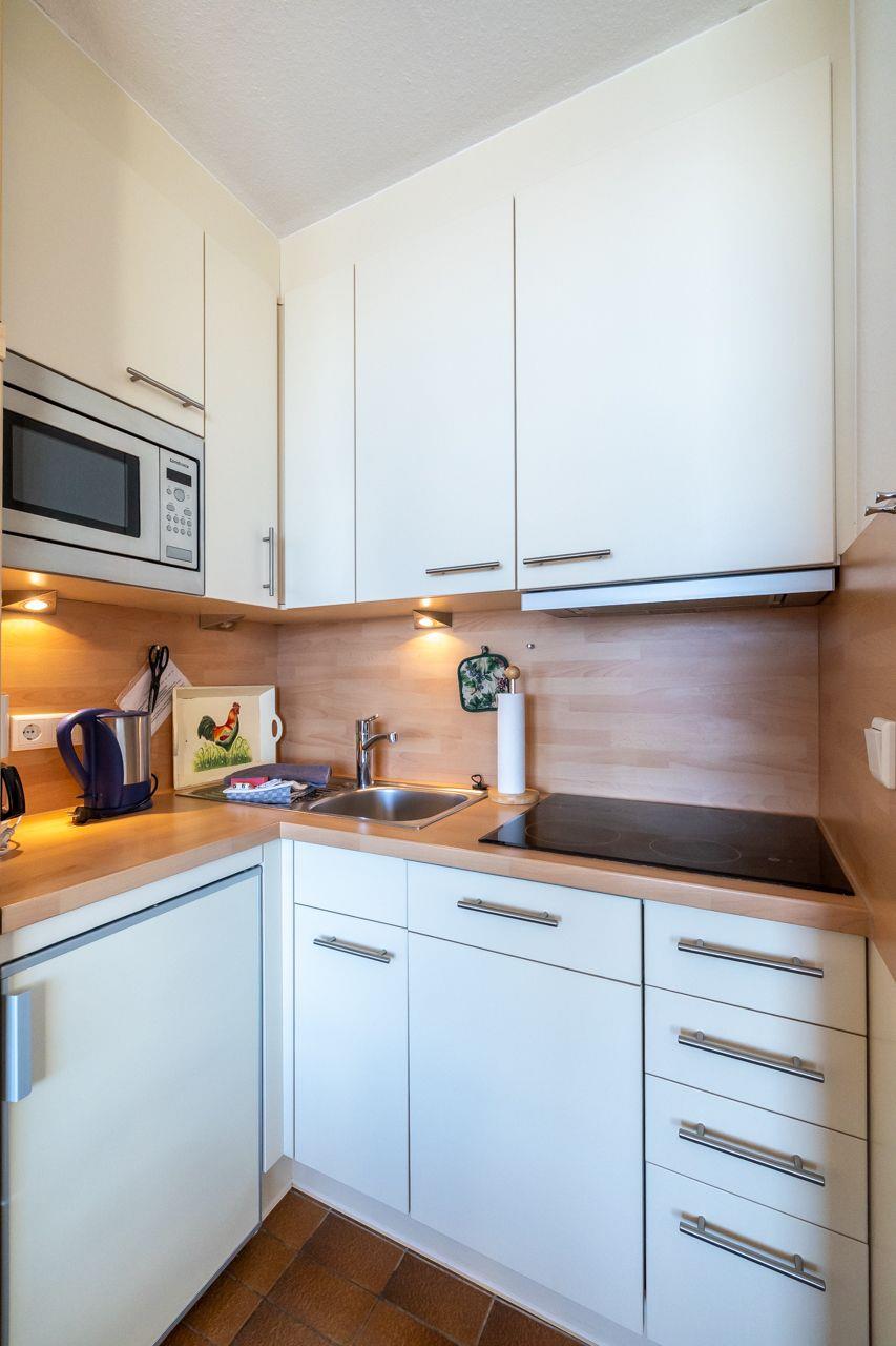 Das Appartement bietet einen kombinierten Wohn-Ess-Küchenbereich, der modern und einladend gestaltet ist. Hier können Sie entspannen, speisen und den Ausblick auf das Meer gleichermaßen genießen. Das Schlafzimmer verfügt über zwei Einzelbetten und bietet eine gemütliche Rückzugsmöglichkeit. Das moderne Duschbad mit Fenster sorgt für Frische und Komfort.