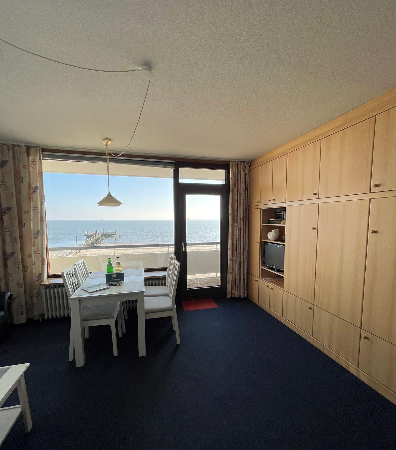 Willkommen im charmanten Appartement im 1. Stock des Hauses, das Sie bequem mit dem Fahrstuhl erreichen können (ab Hochparterre, bis dahin sind es ca. 8 Treppenstufen). Die Eingangstür öffnet sich zu einem atemberaubenden Meerblick, der das gesamte Appartement mit Helligkeit und Freundlichkeit durchflutet. Der überdachte Balkon erweitert Ihren Wohnraum und ermöglicht es Ihnen, bei jedem Wetter draußen zu sitzen und den uneingeschränkten Blick auf die Nordsee und die Halligen zu genießen.