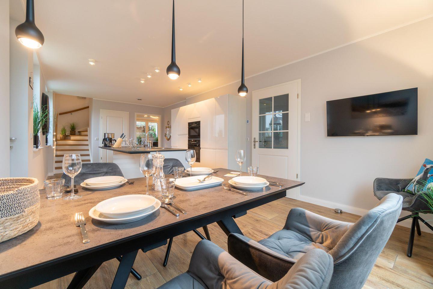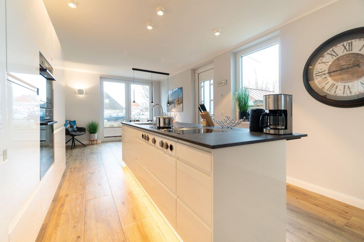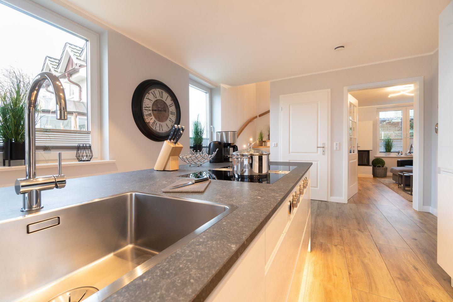 Im Erdgeschoss befinden sich der großzügige Wohn- und Essbereich mit offener Küche, eines der drei Duschbäder und das Gäste-WC, sowie ein Hauswirtschaftsraum mit Waschmaschine und Trockner. Der Kamin im Wohnbereich sorgt auch an kühleren Tagen für eine angenehme Atmosphäre. Über den Essbereich gelangen Sie in den Außenbereich und auf die eigene Terrasse. Die Kochinsel bildet das Herzstück der großen, modernen Küche - ein Traum für jeden Hobbykoch!