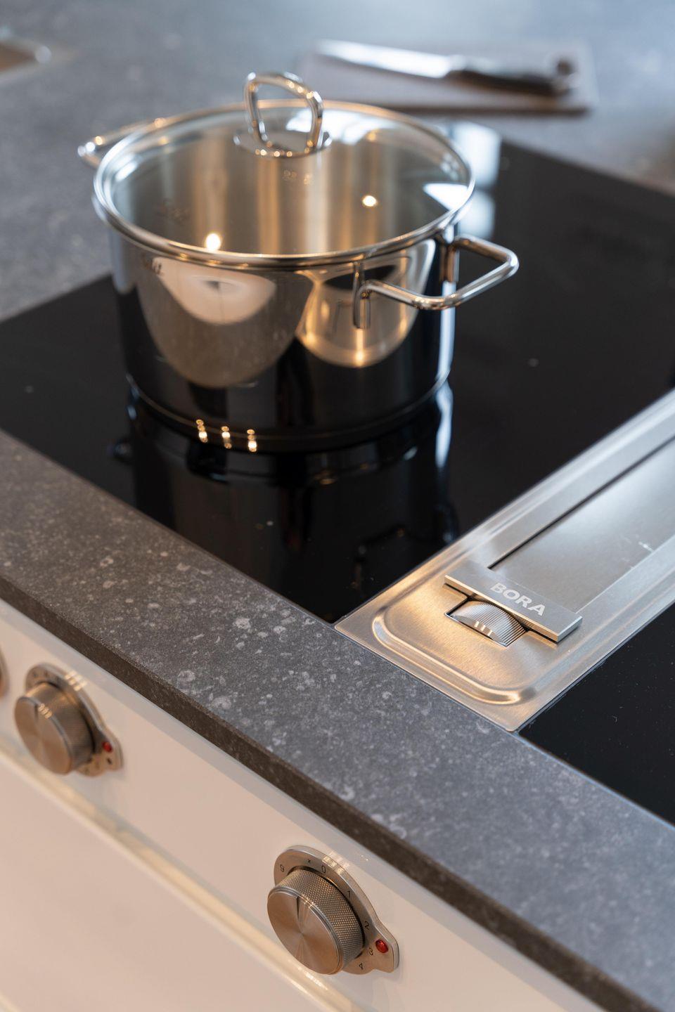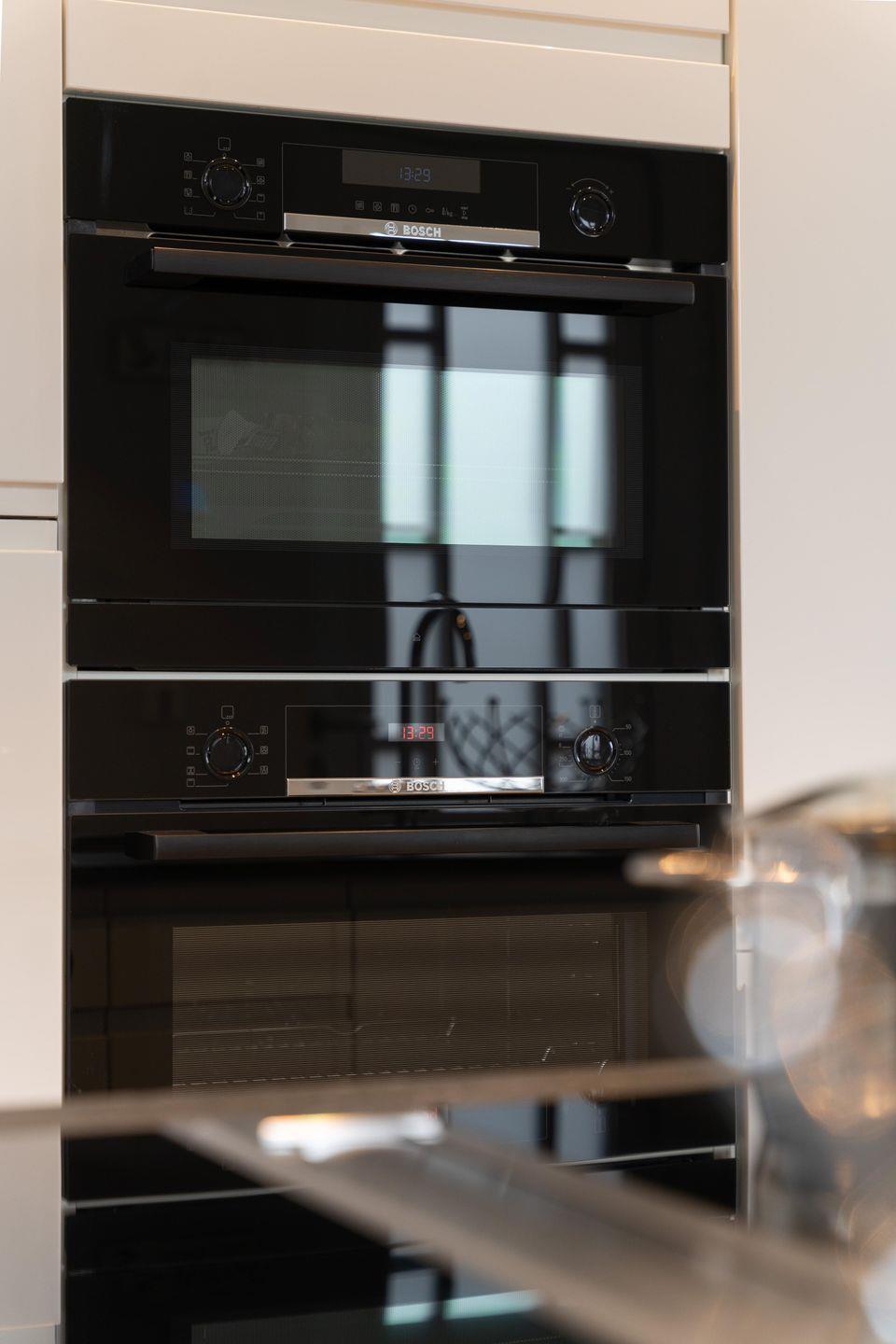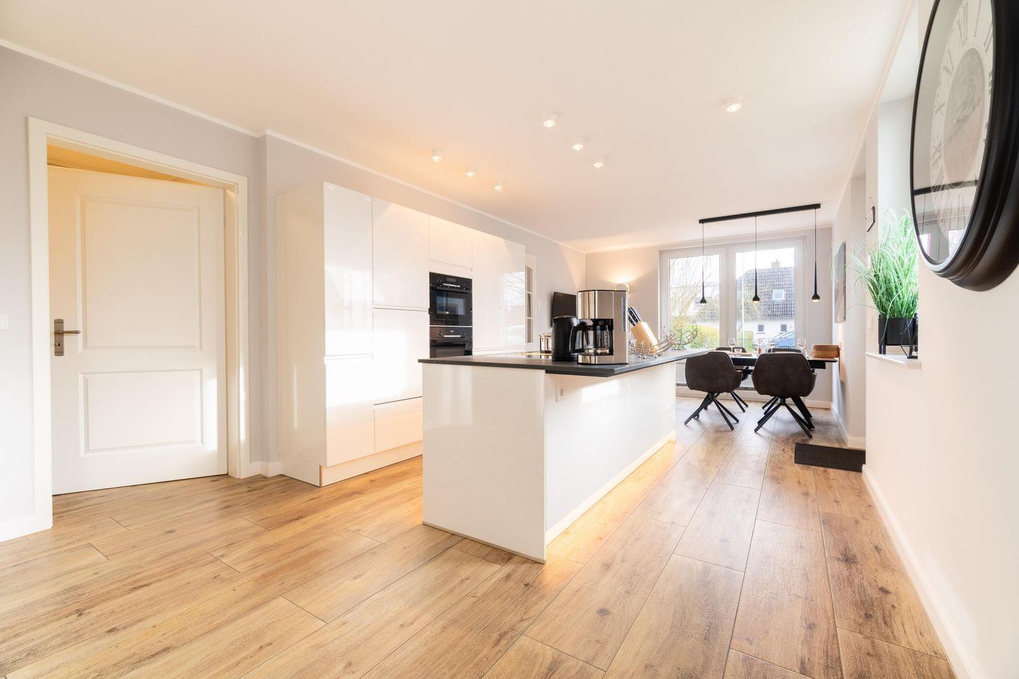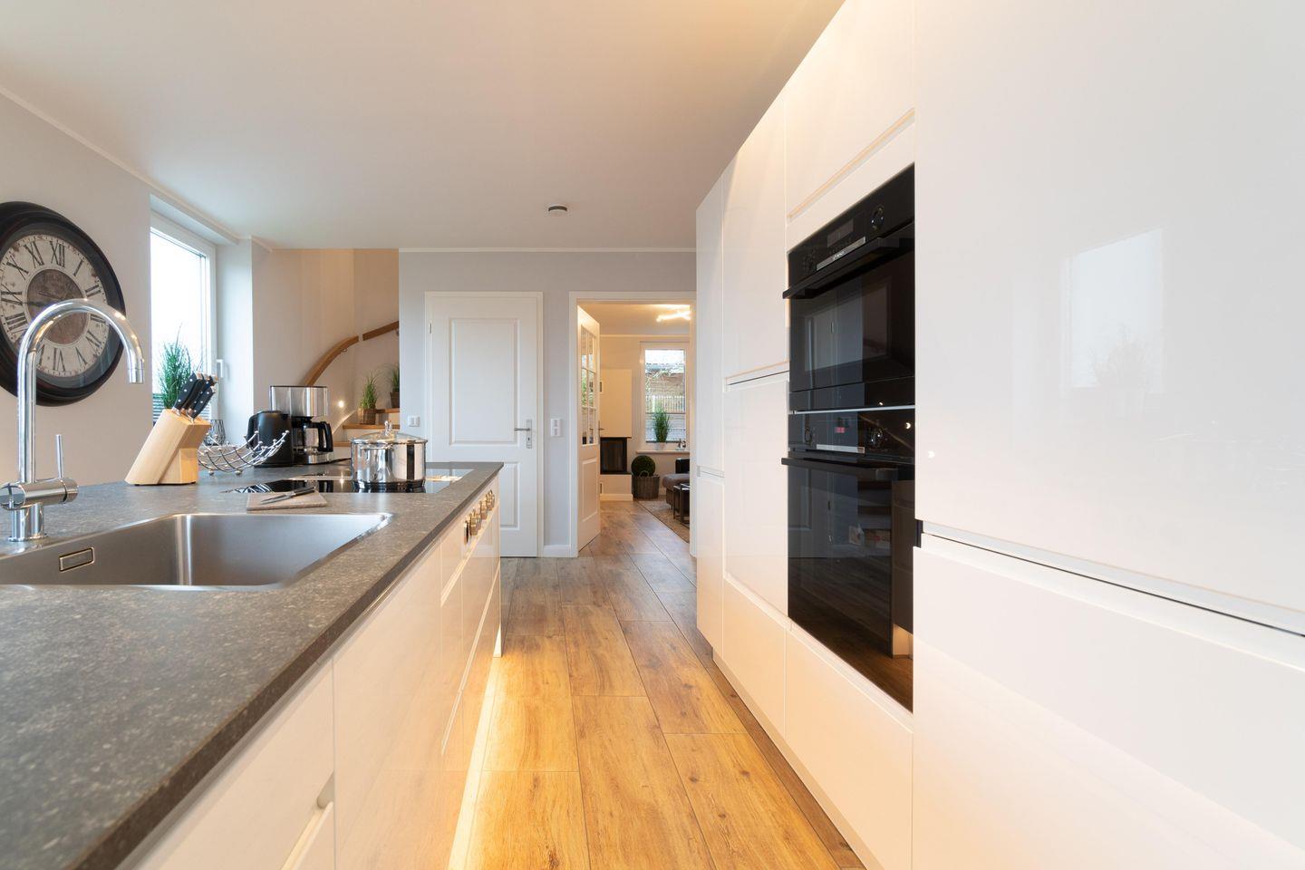 Im Erdgeschoss befinden sich der großzügige Wohn- und Essbereich mit offener Küche, eines der drei Duschbäder und das Gäste-WC, sowie ein Hauswirtschaftsraum mit Waschmaschine und Trockner. Der Kamin im Wohnbereich sorgt auch an kühleren Tagen für eine angenehme Atmosphäre. Über den Essbereich gelangen Sie in den Außenbereich und auf die eigene Terrasse. Die Kochinsel bildet das Herzstück der großen, modernen Küche - ein Traum für jeden Hobbykoch!