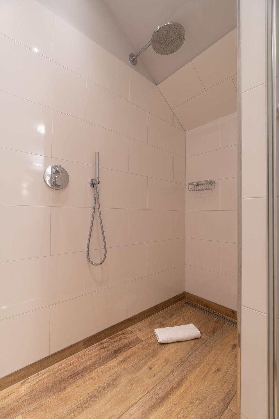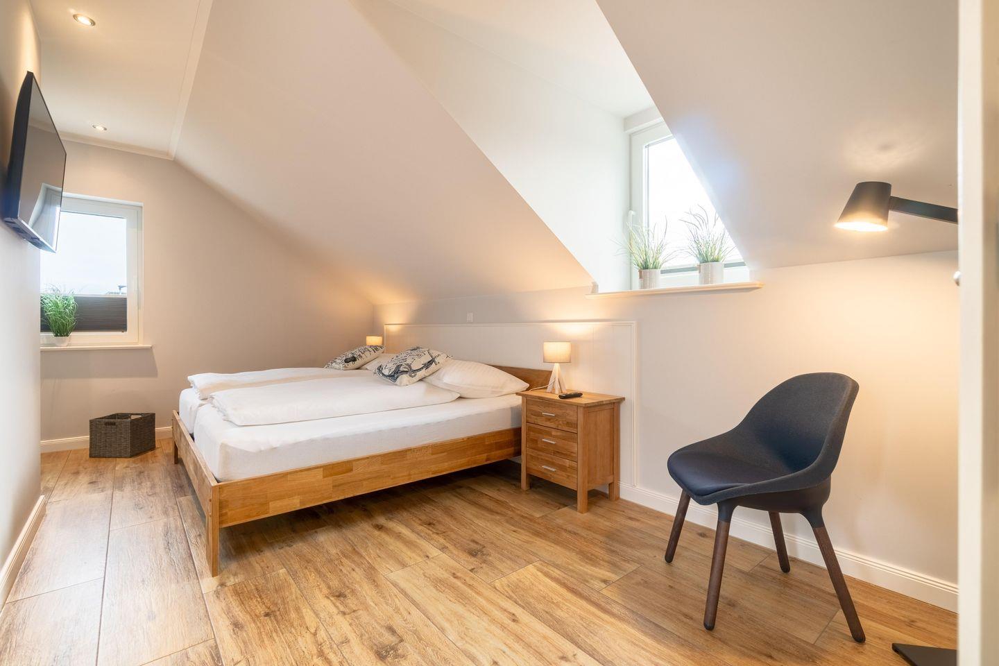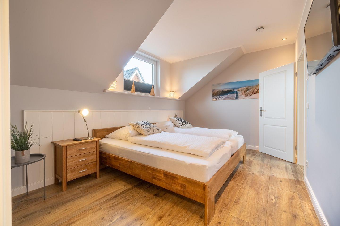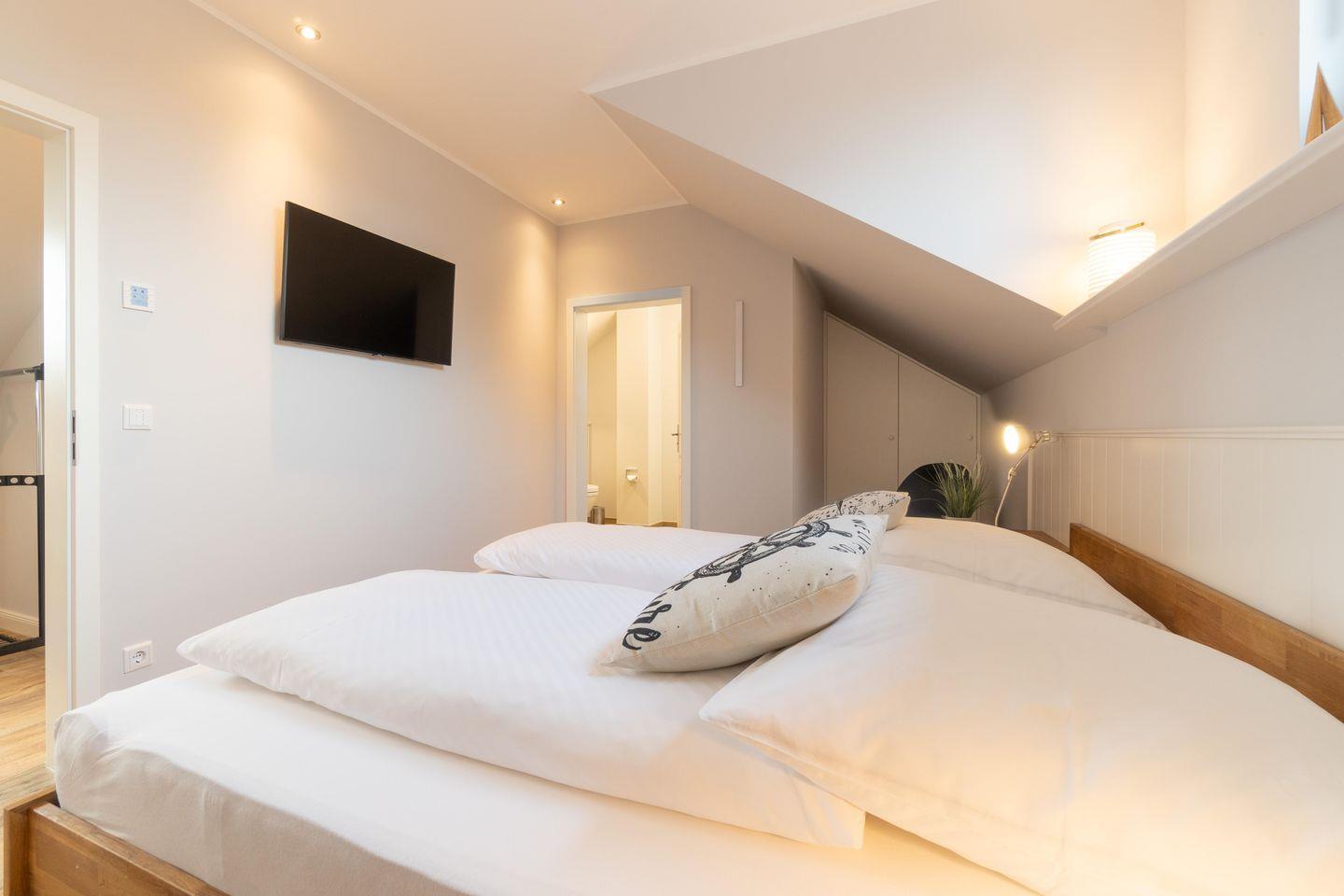 Im Obergeschoss sind die zwei Schlafzimmer gelegen. Diese verfügen jeweils über ein Doppelbett mit den Maßen 200 x 200cm, einen Einbauschrank, einen eigenen Fernseher sowie über ein Duschbad en Suite.