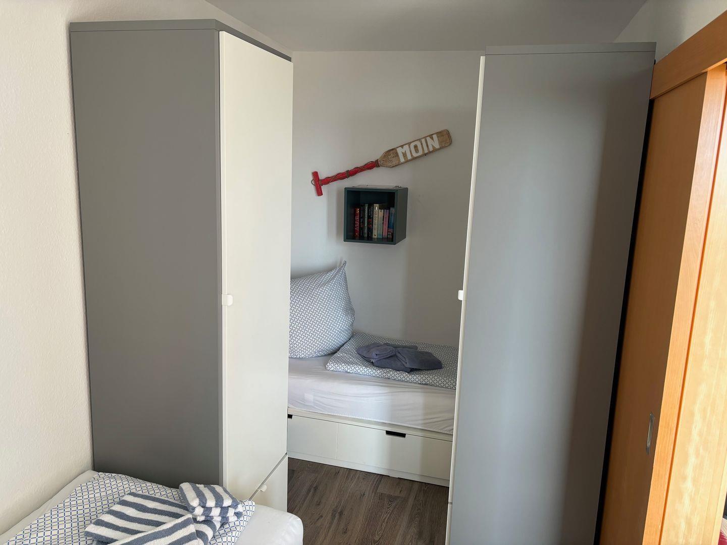 Genießen Sie Ihren Urlaub in dieser großzügigen und hellen Ferienwohnung im 2. Stock des Hauses Uthlande mit atemberaubendem Meerblick. Der moderne Wohnbereich lädt zum Entspannen ein, während die gut ausgestattete Küche alles bietet, was Sie für eine angenehme Selbstversorgung benötigen. Die Wohnung verfügt über ein Schlafzimmer mit Doppelbett (160x200 cm, 2 Matratzen) sowie ein weiteres Schlafzimmer mit zwei hintereinander stehenden Einzelbetten. Ein helles Duschbad, WLAN und ein Flachbild-TV sorgen für zusätzlichen Komfort.