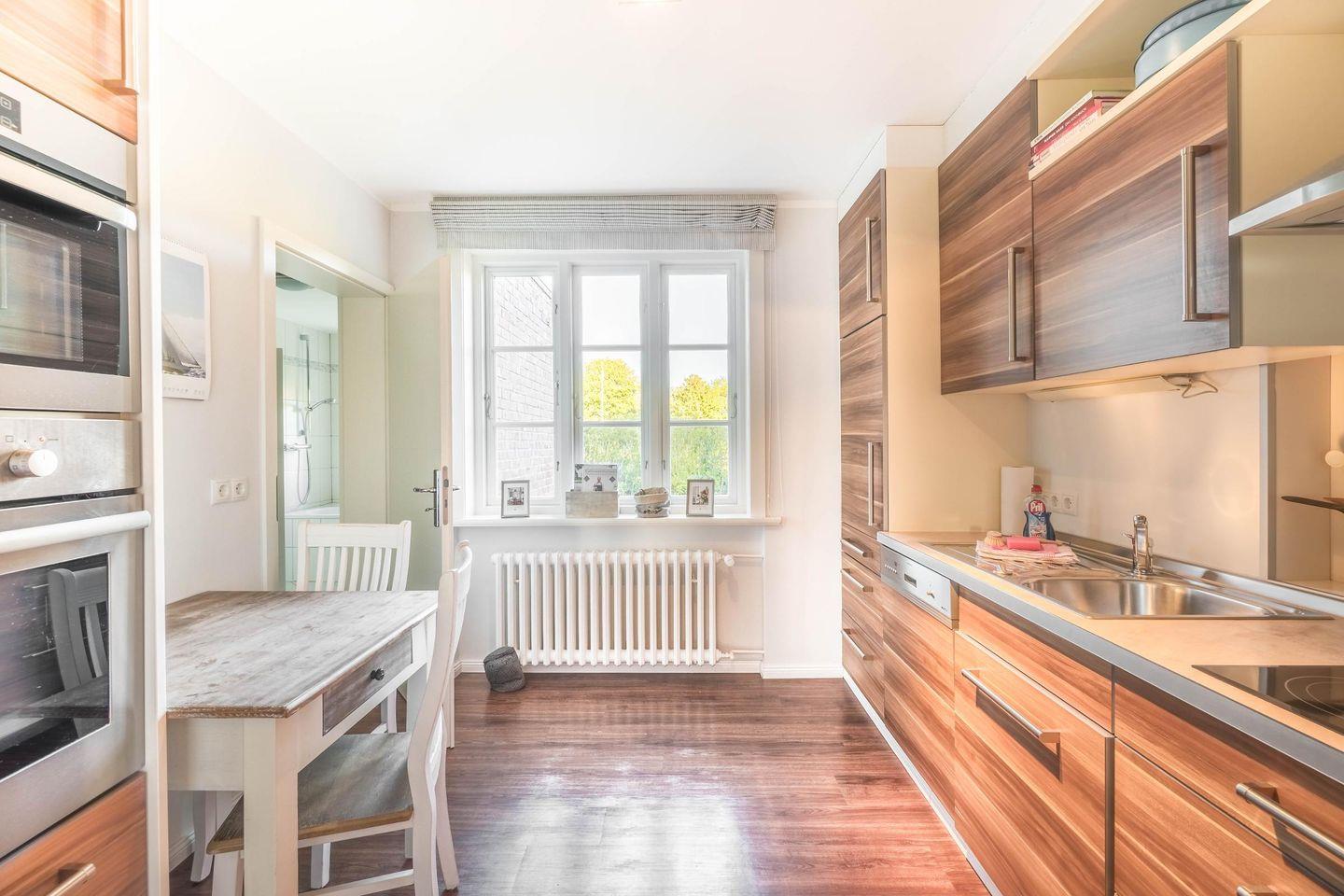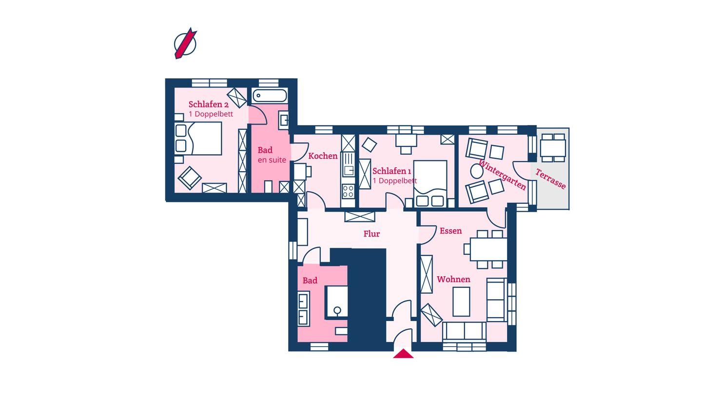 Die großzügige, ca. 120 m² große Wohnung "Rose" liegt im Erdgeschoss des Hauses und bietet Ihnen ein offenes Wohn-Esszimmer mit separater Küche, zwei Doppelbett-Schlafzimmer, ein Vollbad mit Dusche und Wanne, ein Duschbad und einen Wintergarten, von dem aus Sie auf die eigene Terrasse und in den gemeinschaftlich genutzten Garten gelangen. Zudem befindet sich im Souterrain ein weiterer Aufenthaltsraum mit einem Schlafsofa, einem Sessel und einem Smart-TV.