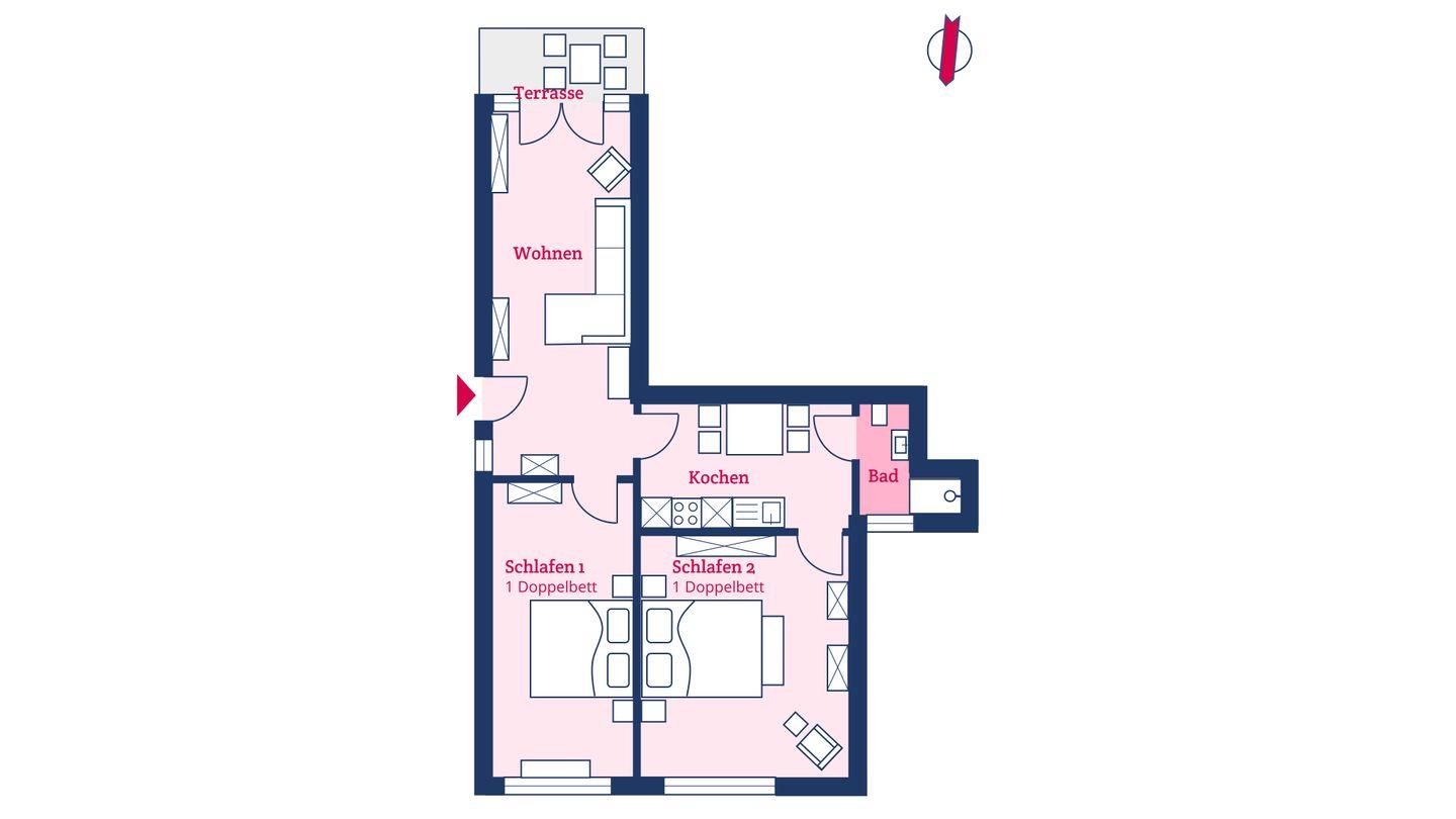 Die großzügige, ca. 65 m² große Wohnung "Clematis" befindet sich im Erdgeschoss und bietet Ihnen eine separate Küche, zwei Doppelbett-Schlafzimmer, ein Duschbad und ein Wohnzimmer mit Zugang zur eigenen Terrasse und dem gemeinschaftlich genutzten Garten. Gerne können Sie in diese Wohnung Ihren Hund mitbringen.