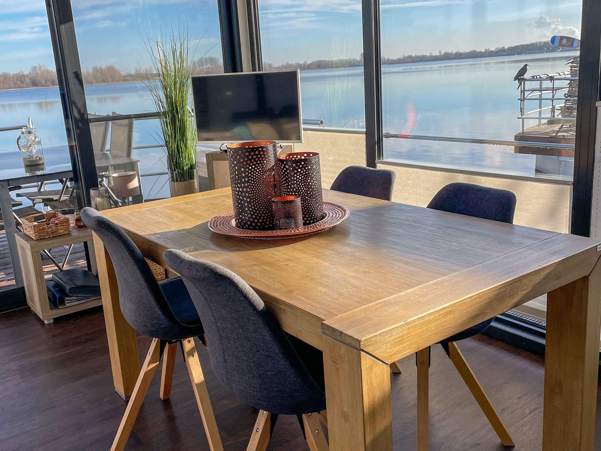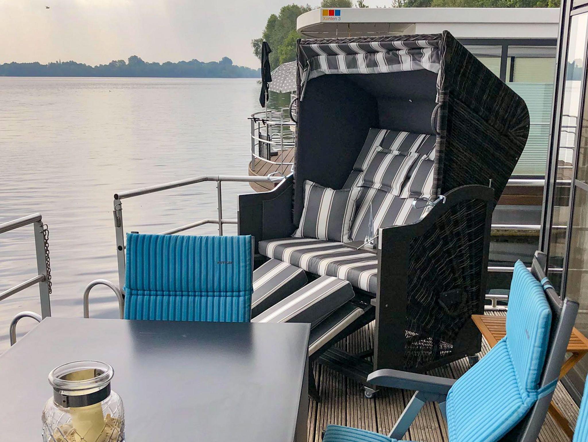 Auf dem Floating House 2 erlebst du erholsame Tage auf dem Wasser. Mit 44m² Wohnfläche, zwei Schlafzimmern und Platz für bis zu 4 Personen ist dieses festliegende Hausboot das perfekte Refugium für alle, die maritimes Flair lieben, aber den Komfort eines Ferienhauses nicht missen möchten. Direkt auf dem Nordsee gelegen, genießt Du einen freien Blick auf die Xantener Seenlandschaft ? ruhig, grün und voller Möglichkeiten. Innen erwarten Dich eine moderne, schiffig inspirierte Einrichtung und große Fensterfronten, die viel Licht hereinlassen und Dir jederzeit den Blick auf die Natur freigeben. Der offene Wohnbereich mit integrierter Küchenzeile ist bestens ausgestattet ? mit Mikrowelle, Ceran-Kochfeld, Spülmaschine, Kühlschrank, Kaffeemaschine, Toaster, Wasserkocher und allem, was Du im Urlaub brauchst. Der gemütliche Essplatz lädt zum Zusammensitzen ein. Zwei Schlafzimmer mit Doppelbetten (160x200) und ein separates Bad mit Dusche sowie ein WC sorgen für entspannte Nächte und Morgende. Besonderes Highlight sind die beiden Terrassen: die möblierte Bugterrasse mit direktem Wasserblick und die großzügige Dachterrasse mit rund 25m² Fläche ? ideal zum Sonnen, Lesen oder einfach zum Durchatmen. Eine Klimaanlage mit Warmluftfunktion sorgt für angenehmes Raumklima zu jeder Jahreszeit. Direkt am Hafen befindet sich ein Parkplatz (ca. 30m entfernt), außerdem steht Dir ein abschließbarer Raum zur sicheren Unterbringung von Fahrrädern oder Sportequipment zur Verfügung. Bei den Fotos kann es sich um Beispielfotos handeln ? daher sind Abweichungen in Ausstattung und Einrichtung möglich.