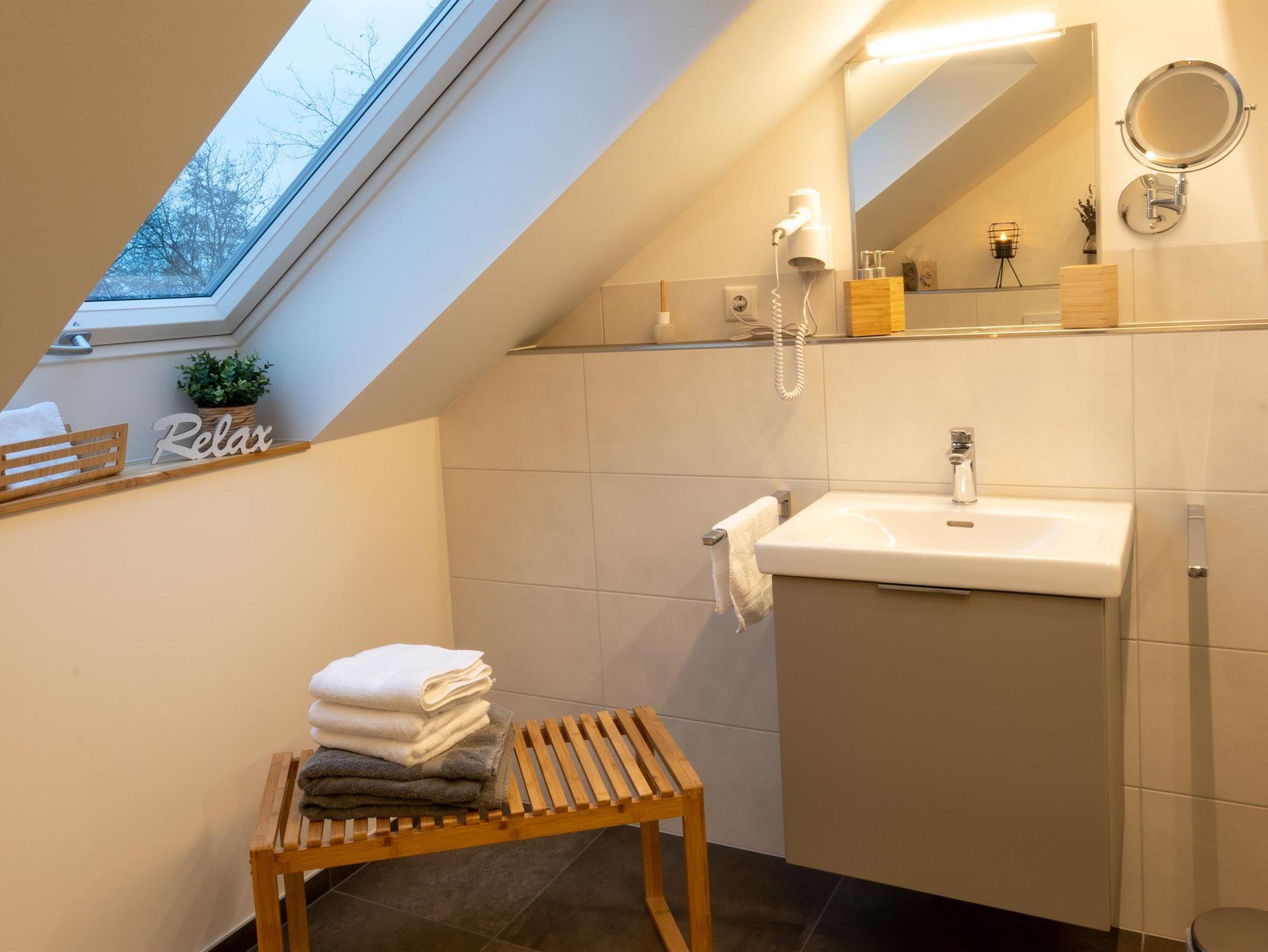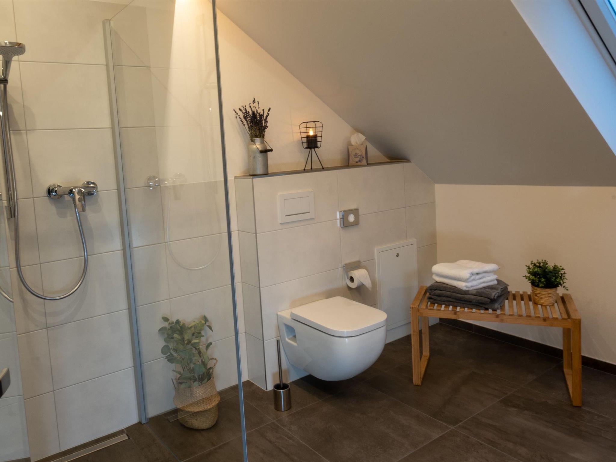 • 1 Badezimmer mit großer ebenerdiger Dusche und WC