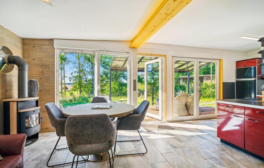 Nyd en fantastisk familieferie i disse rolige og idylliske omgivelser, lige ved søen. Det smukke hus imponerer med sin lyse stue, som er forbundet med solterrassen via flere døre og vinduer. Her kan I kombinere at bo og lave mad inde og spise ude. Læs en bog på liggestolen og se børnene løbe rundt i haven.