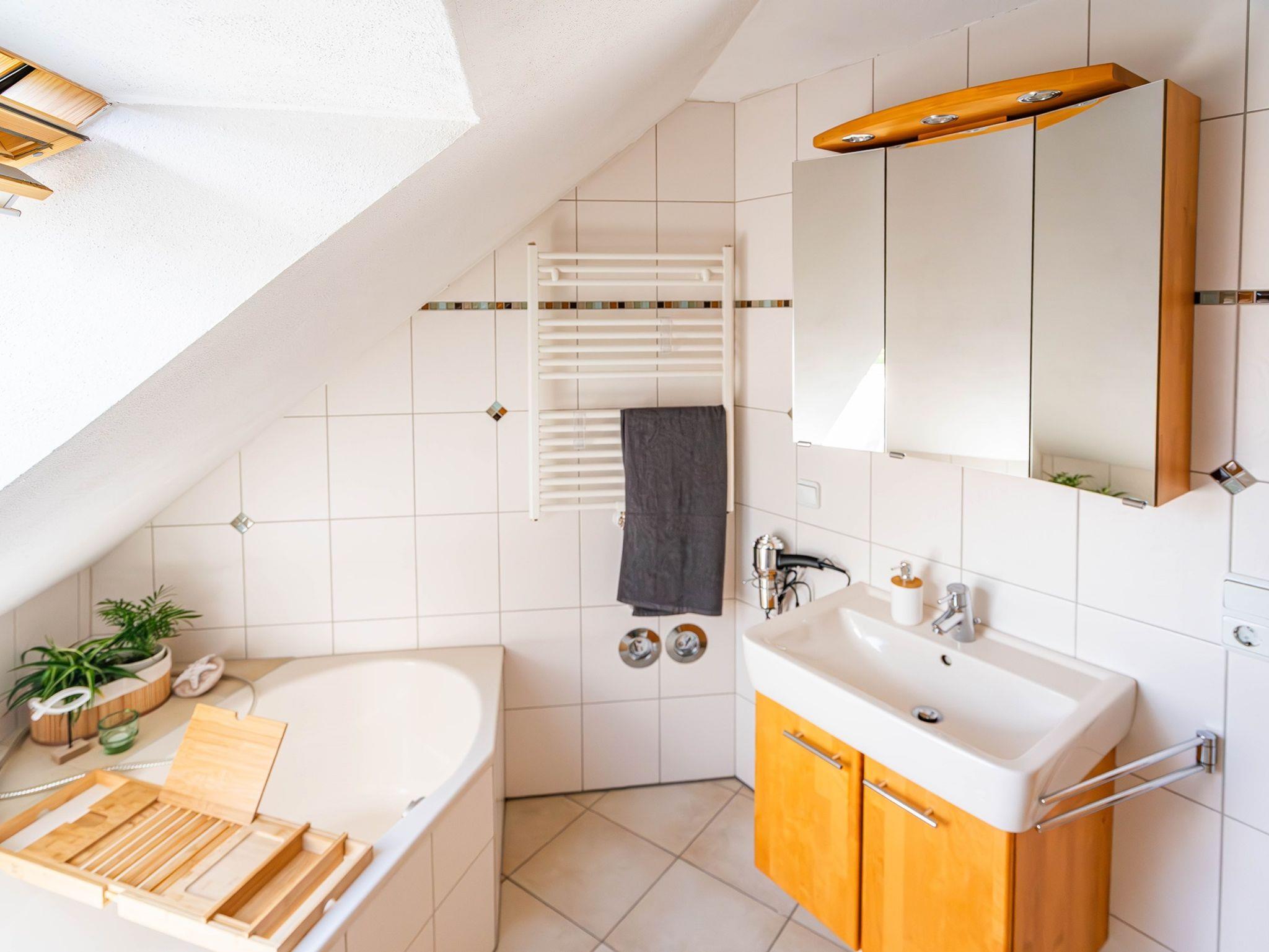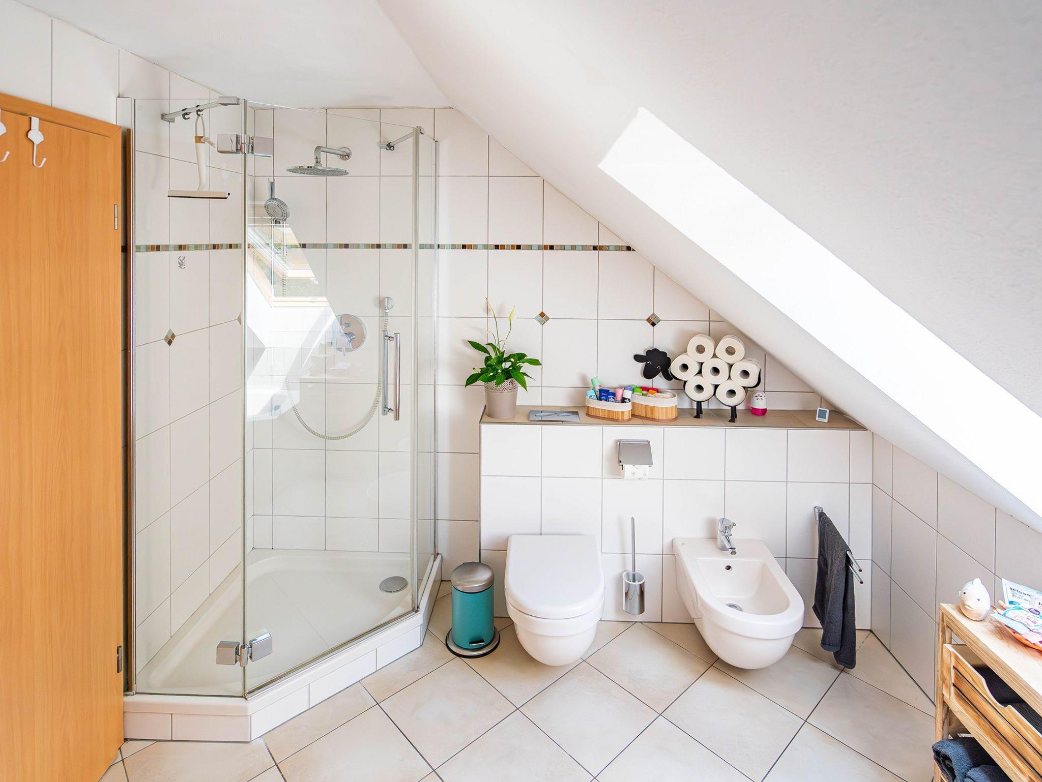 Im Badezimmer befindet sich eine Dusche, ein WC, ein Bidet, eine Eckbadewanne und ein Waschbecken mit Spiegelschrank. Ein Fön, Handtücher und Kosmetikartikel, wie Badezusätze, Shampoo und Duschgel, können kostenlos genutzt werden.