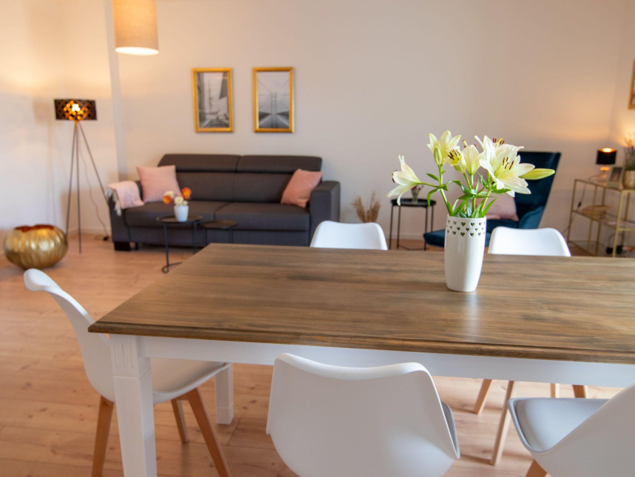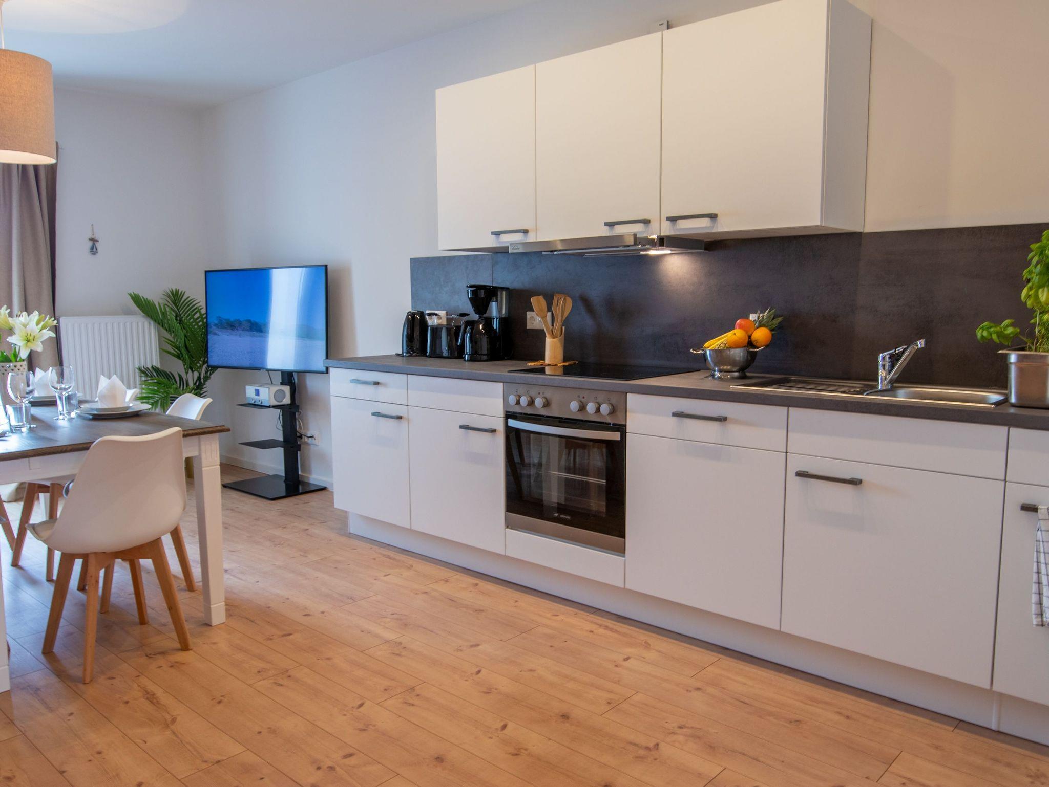 Das Landhaus Wiesenblick in Zarrendorf umfasst neben 3 Ferienwohnungen noch einen separat mietbaren Tanzsaal und eine Gaststube für eigene Feiern und Veranstaltungen. Die Ferienwohnungen Panoramablick 1 und 2 sind für jeweils 6 Personen ausgelegt und befinden sich im 1. OG und sind über einen gemeinsamen Zugang erreichbar. Die Ferienwohnung Wiesenglück für 8 Personen befindet sich im Erdgeschoss und besitzt einen separaten Eingang. Die sehr stilvoll eingerichteten Ferienwohnungen verfügen über jeweils 1 Wohnzimmer mit offener Küche und Essbereich, sowie 2 bzw. 3 getrennten Schlafzimmern. Das Badezimmer ist separat abschließbar und mit Dusche, WC und Badewanne ausgestattet. Die Küche beinhaltet eine Spüle, Geschirrspüler, Backofen, Cerankochfeld, Kühlschrank mit Gefrierfach, Wasserkocher, Toaster, Tassimo Kaffeemaschine, täglichen Küchenhelfern, Besteck und Geschirr für bis zu 6 bzw. 8 Personen. Auf dem Grundstück stehen Parkplätze und eine große Terrasse sowie Grillmöglichkeiten zur Verfügung.